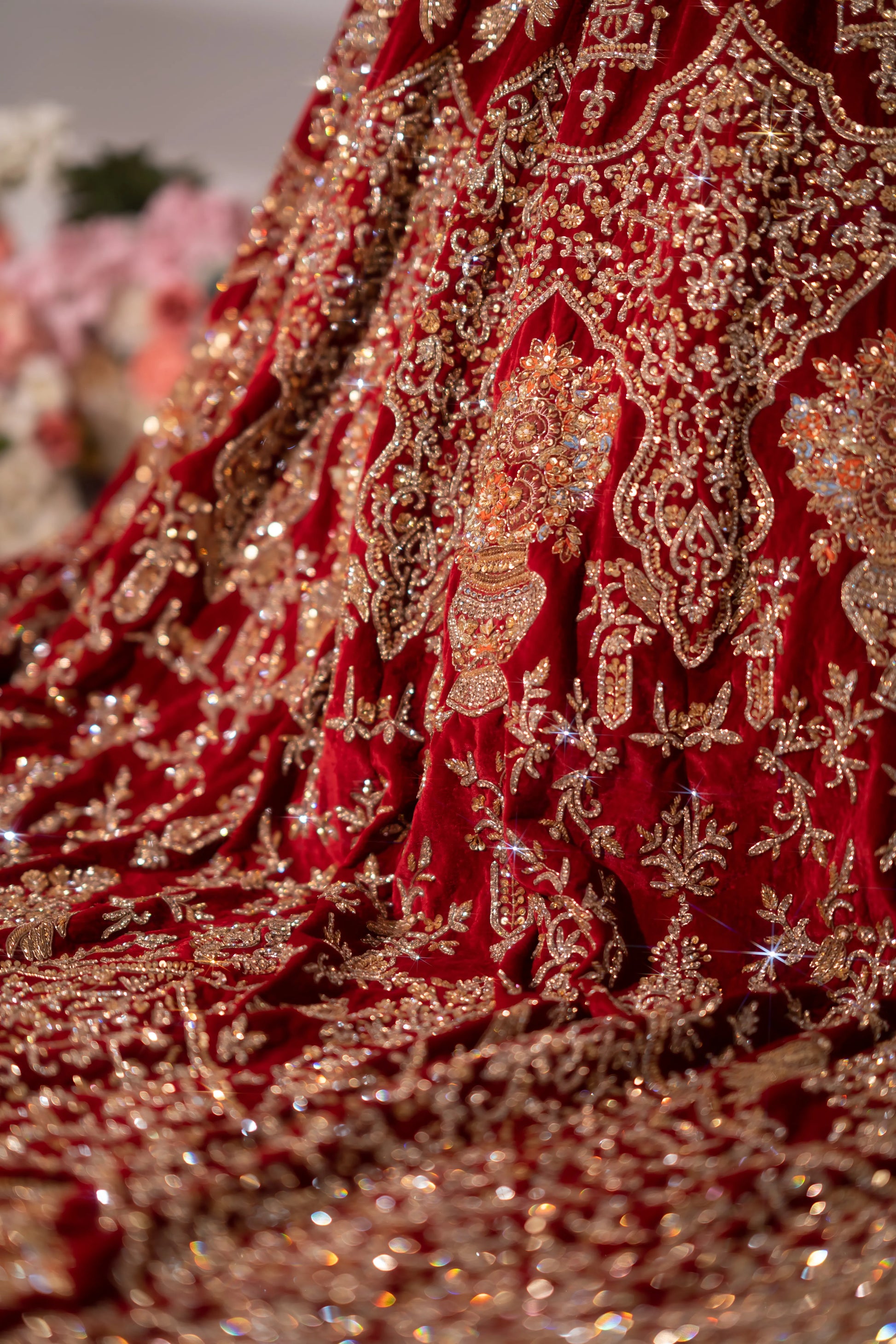 Velvet Luxury: Crafted on plush deep maroon velvet, the fabric provides a rich sheen and a heavy, structured drape perfect for winter weddings ❄️