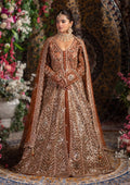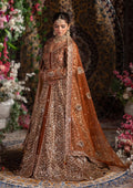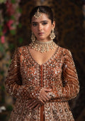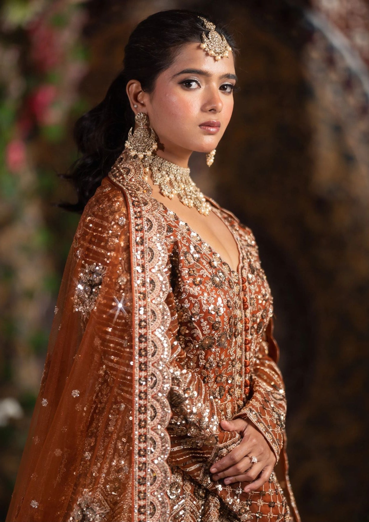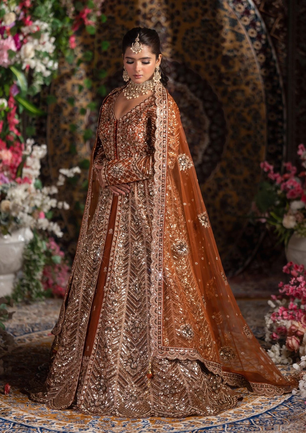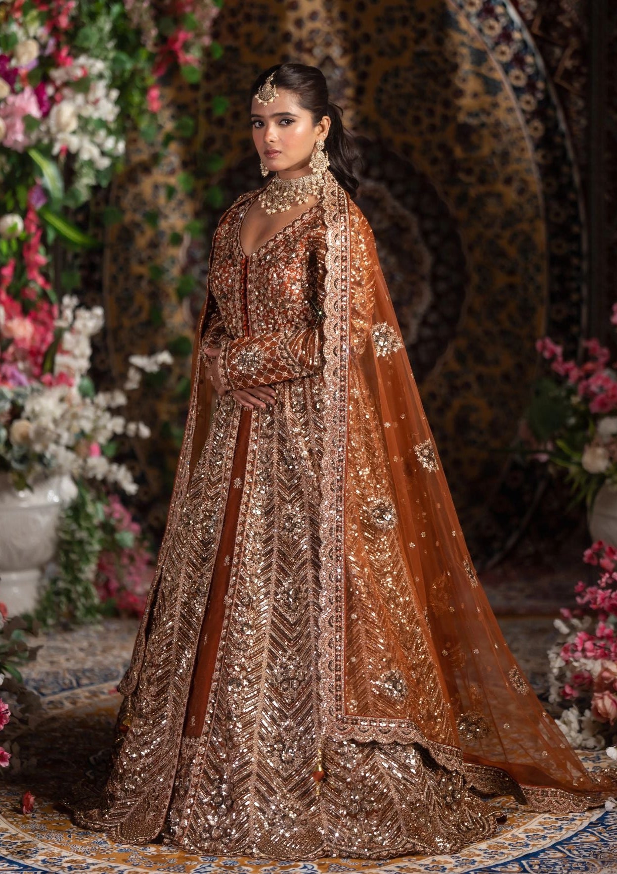 Dupatta Design: Flowing sheer bronze-gold net dupatta with embroidered border featuring floral and paisley motifs, scattered sequin work throughout — adds ethereal drama while complementing the gown's bold aesthetic.