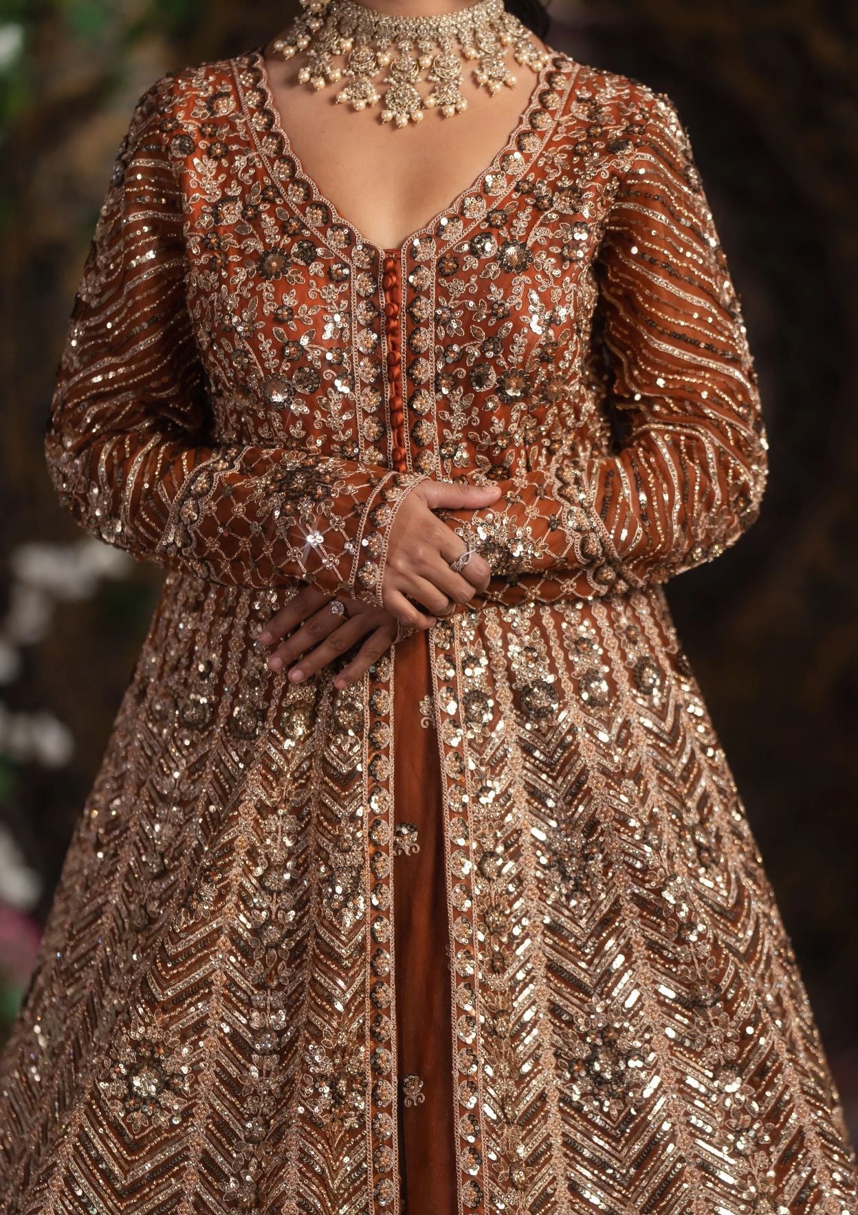 Luminous and captivating, the Bronze Radiance A-Line Gown embodies the warmth of sunset — where rich bronze tones meet shimmering gold brilliance. The gown is entirely adorned with intricate sequin embroidery in mesmerizing chevron patterns, creating a dazzling play of light with every movement. It's opulence reimagined — perfect for weddings, grand receptions, and milestone celebrations where radiant elegance meets show-stopping glamour.