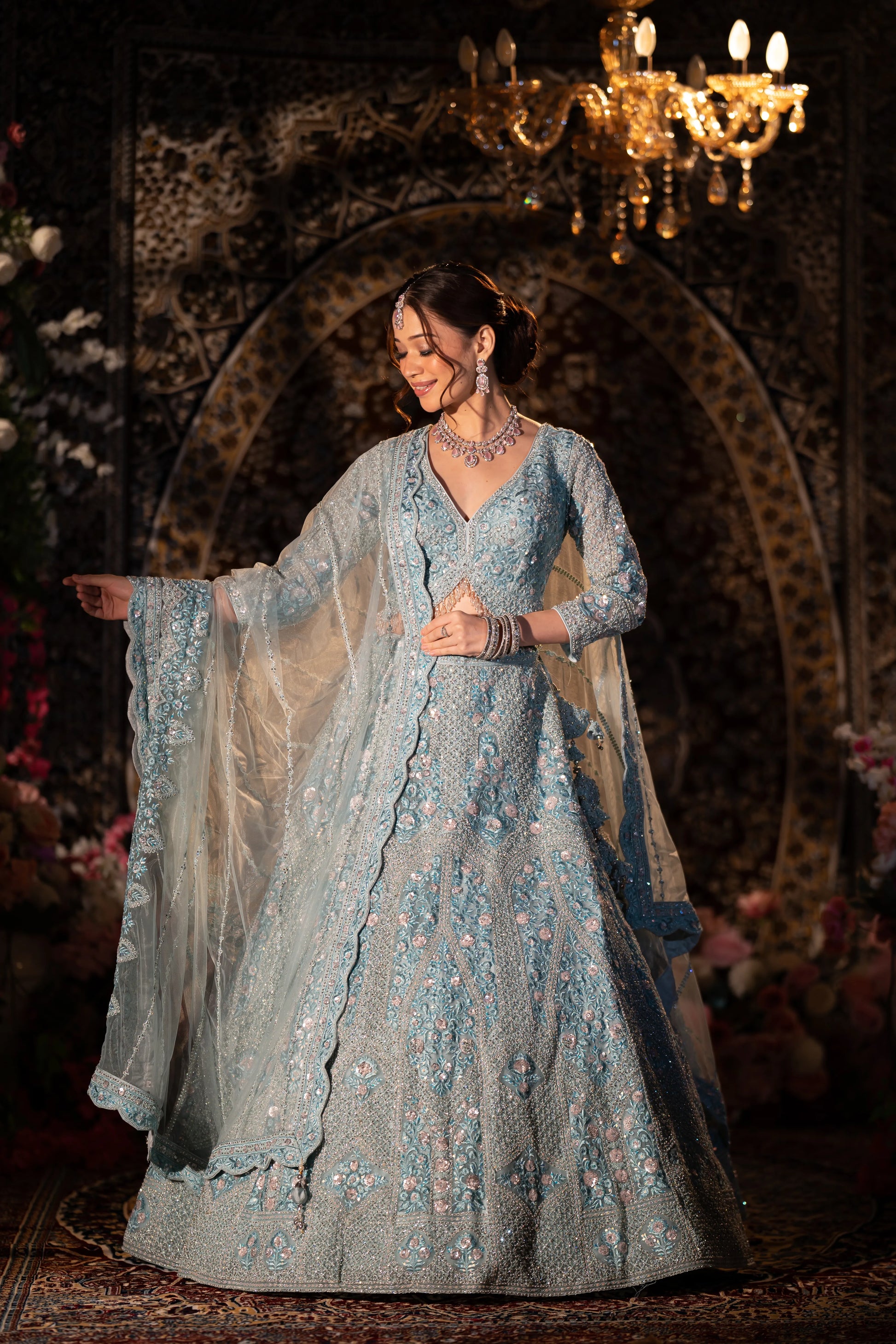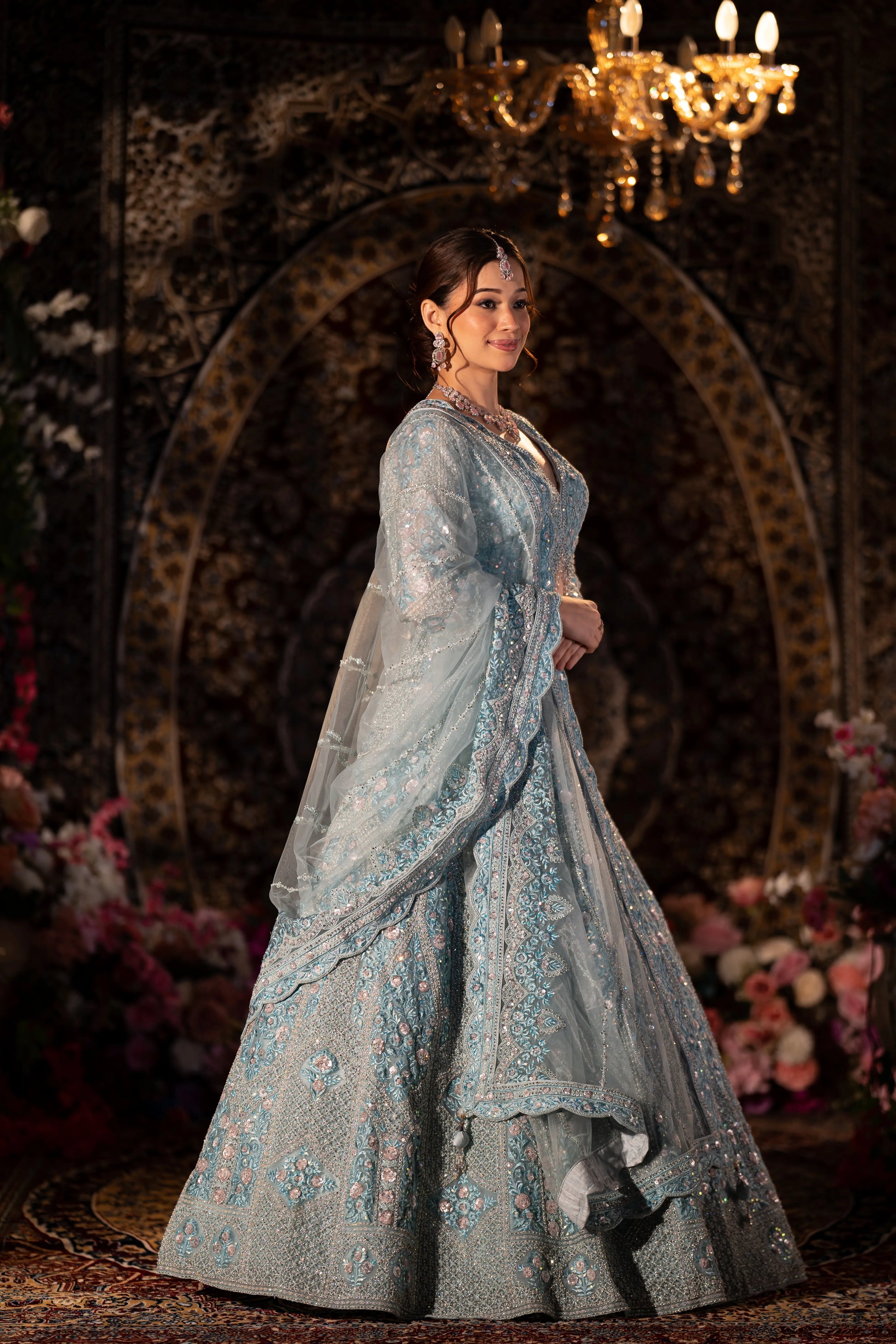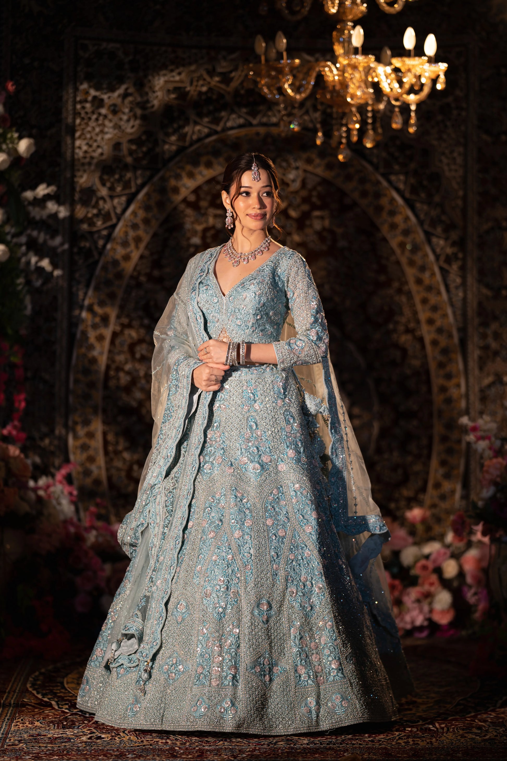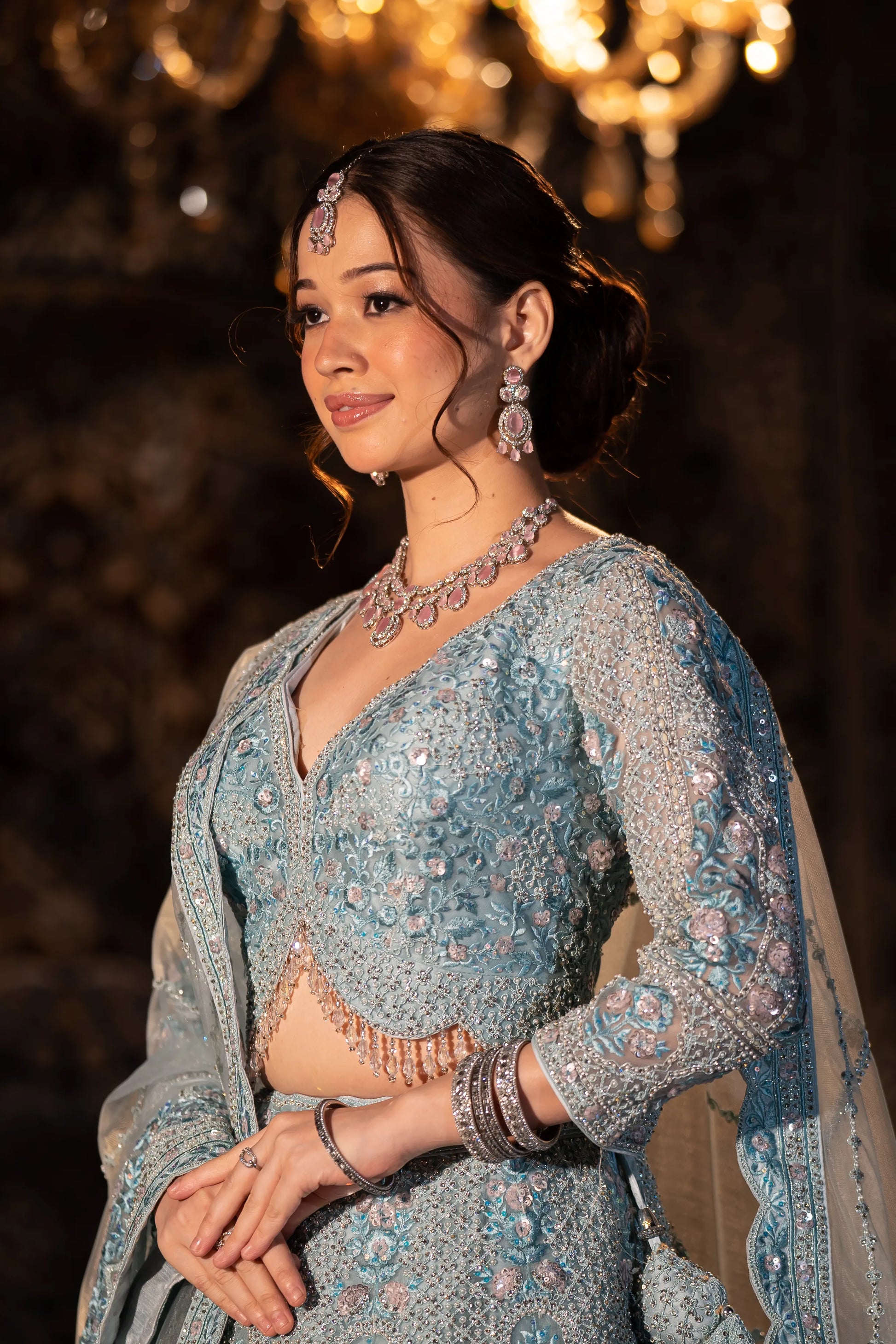 Ice Blue Crystal-Embellished Bridal Lehenga Set