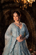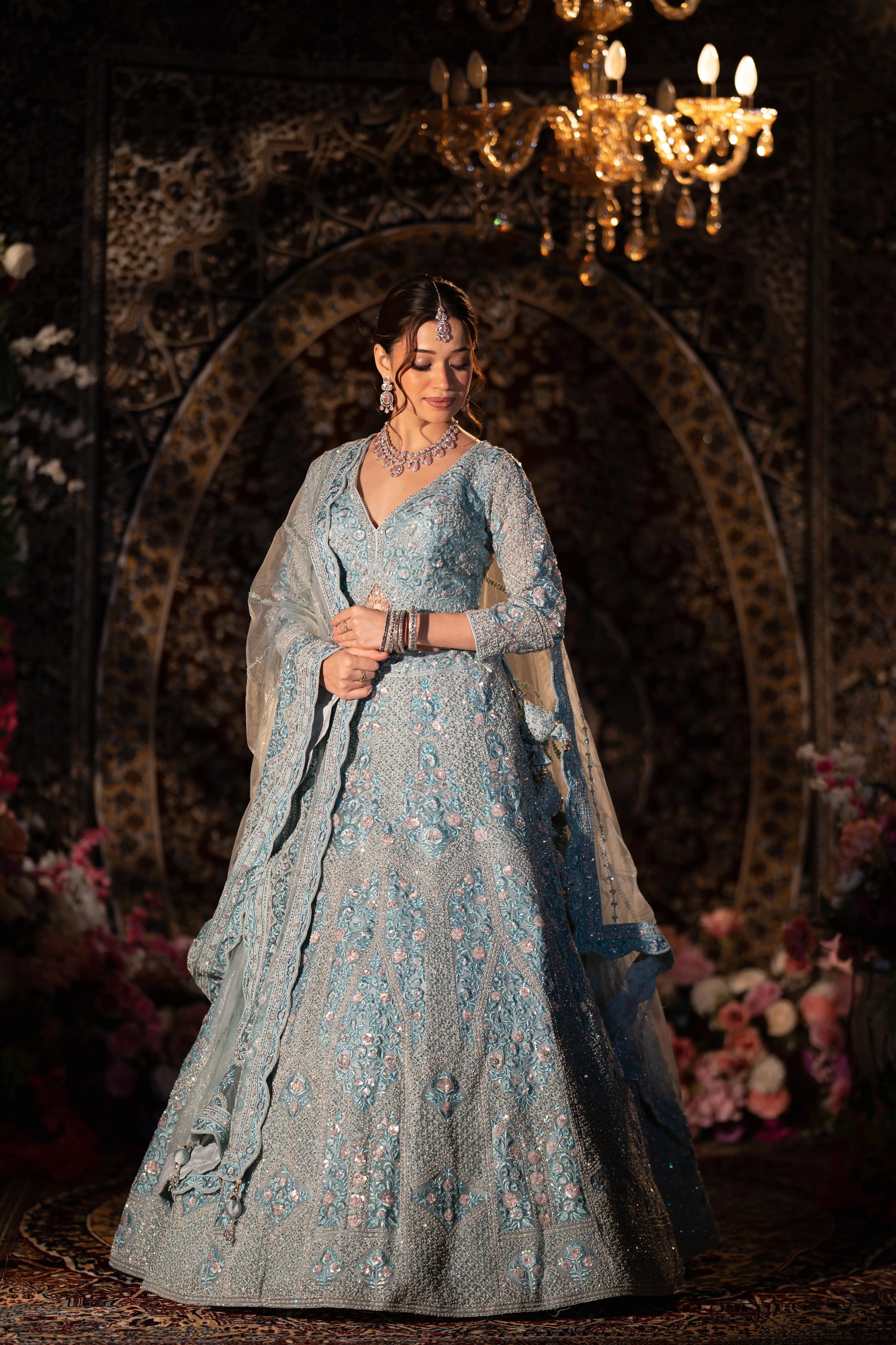 Step into a world of magical elegance with this exquisite Ice Blue Bridal Lehenga Set. The soft, serene pastel hue combined with shimmering crystal embellishments creates a fairytale-like aura—perfect for brides who adore delicate beauty with luxurious detailing. Its ethereal charm glows under chandeliers, making it ideal for receptions, engagement ceremonies, and dreamy wedding evenings.