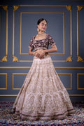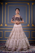 Heavy Architectural Work: The lehenga skirt features dense, vertical panels of champagne gold embroidery that flow into majestic arched motifs near the bottom, adding structure and grandeur ✨