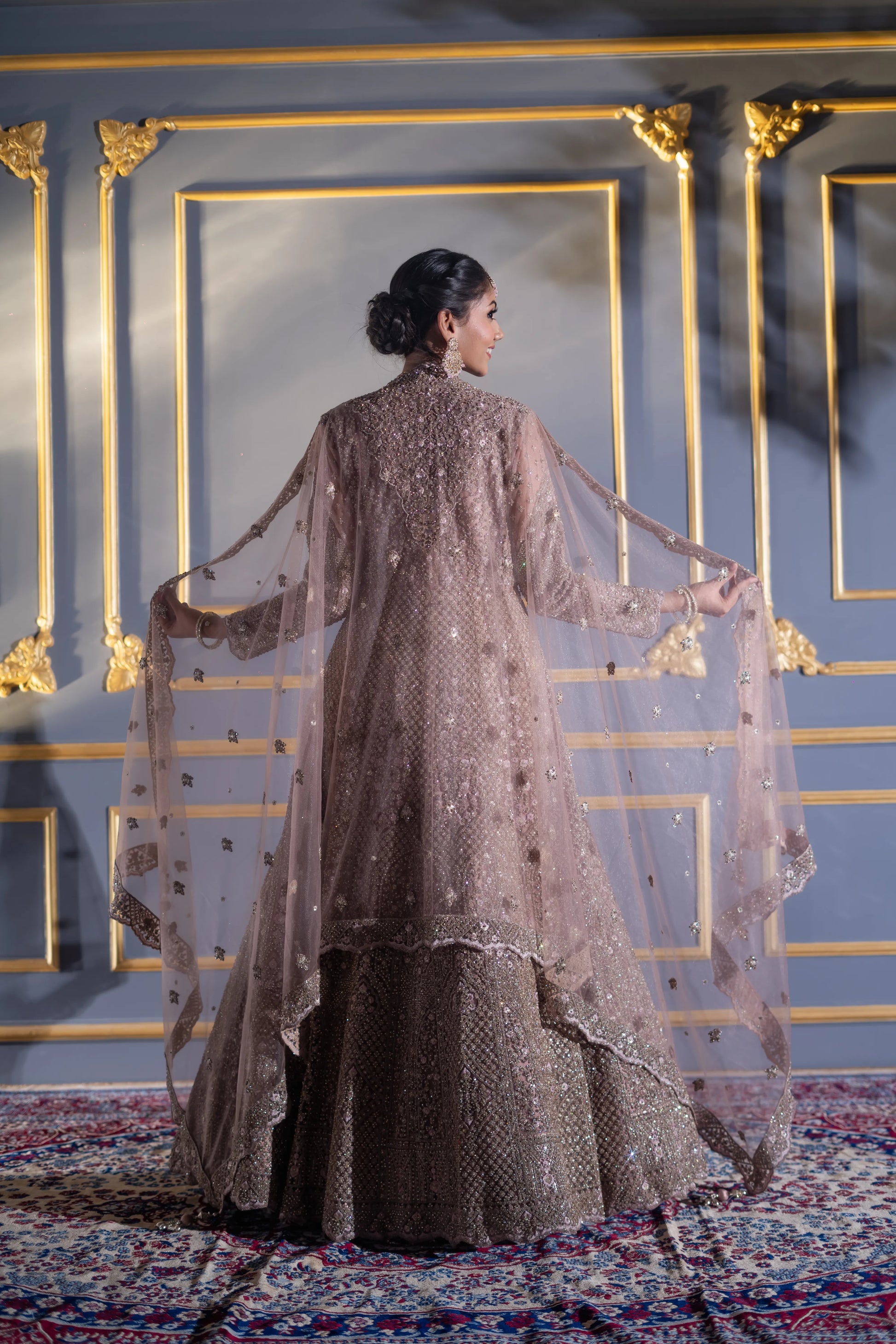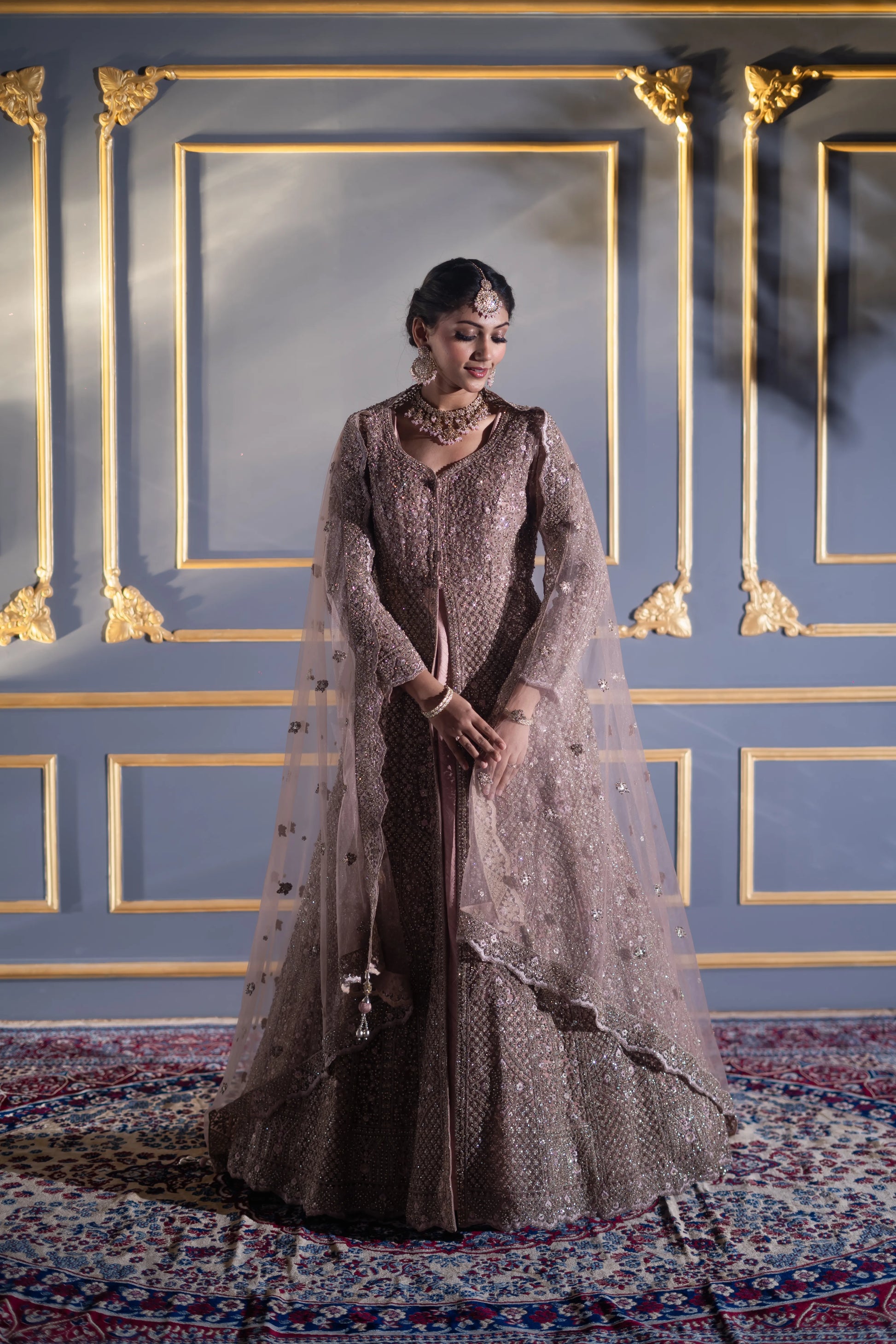 Intricate handwork featuring layered sequin grids, crystal embroidery, and fine cutdana motifs β creating a reflective tapestry of soft shimmer.