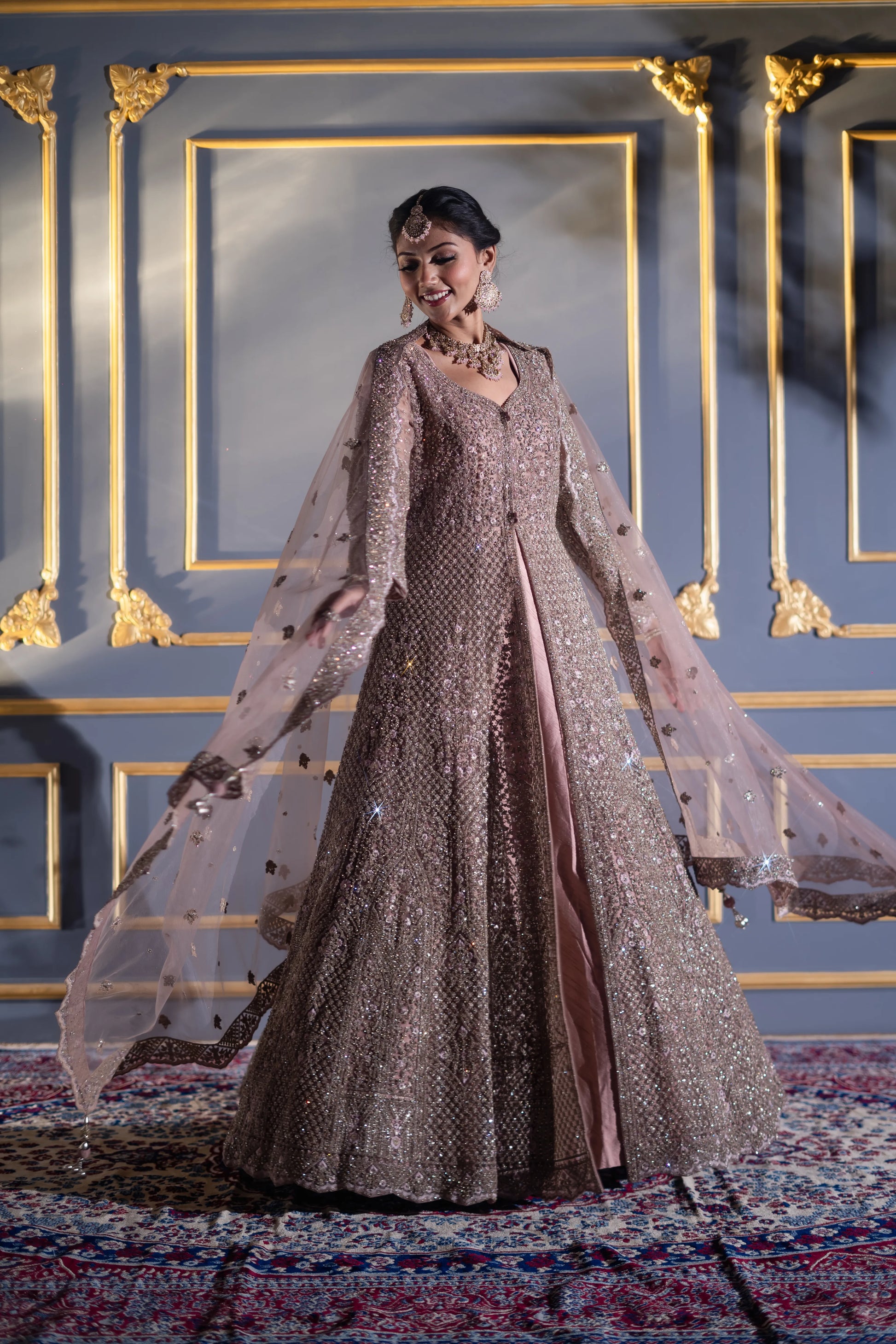 Softly smoldering in hues of rose-mocha and champagne shimmer, the Mocha Muse A-Line Gown redefines understated grandeur. Designed for the contemporary bride or the woman of elegance, this gown flows like poetry β adorned with hand-embroidered sequins, micro-cutdana, and crystal beadwork that glimmer with each graceful move. Perfect for receptions, evening galas, or destination weddings where glamour meets sophistication.
