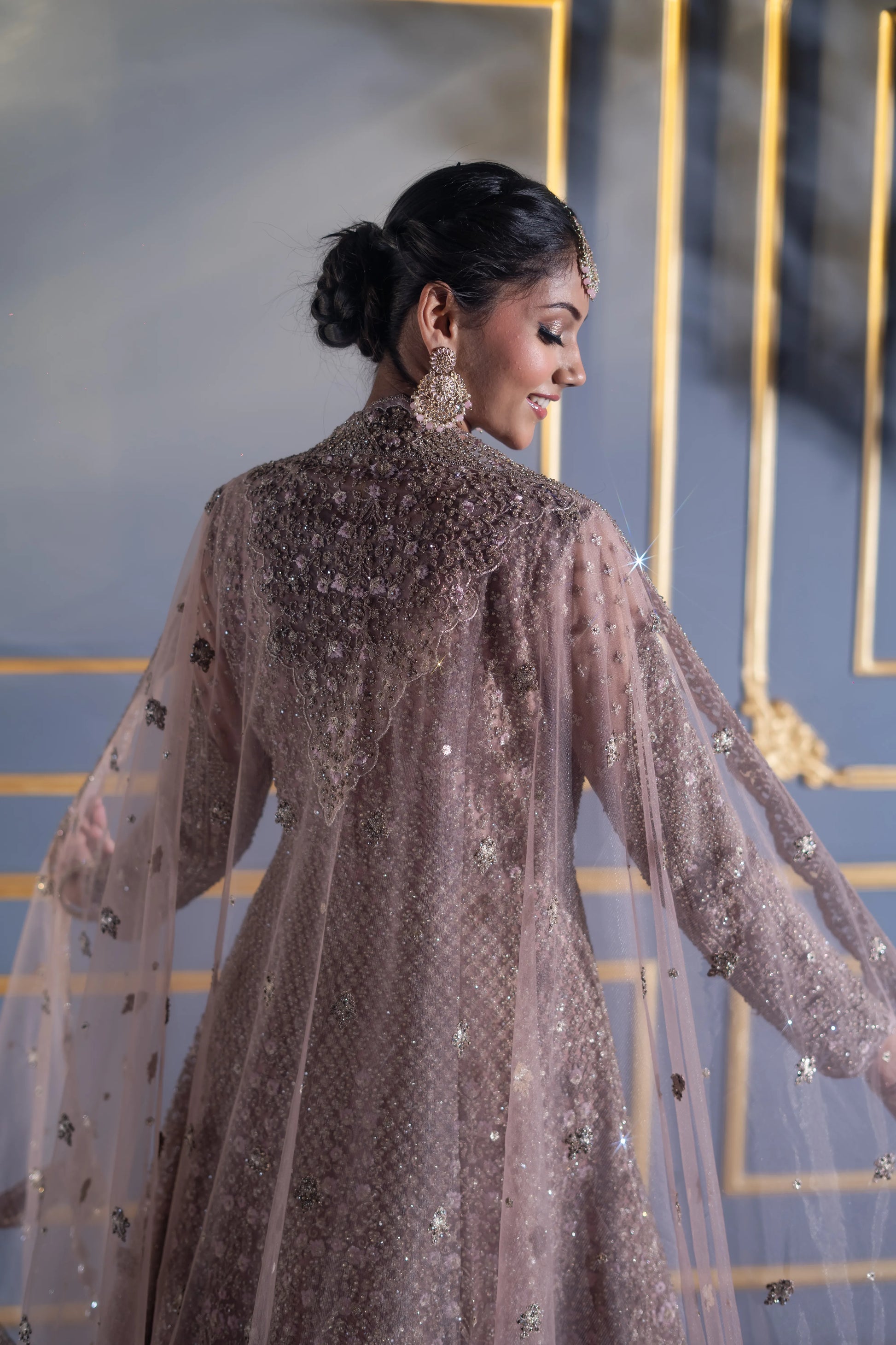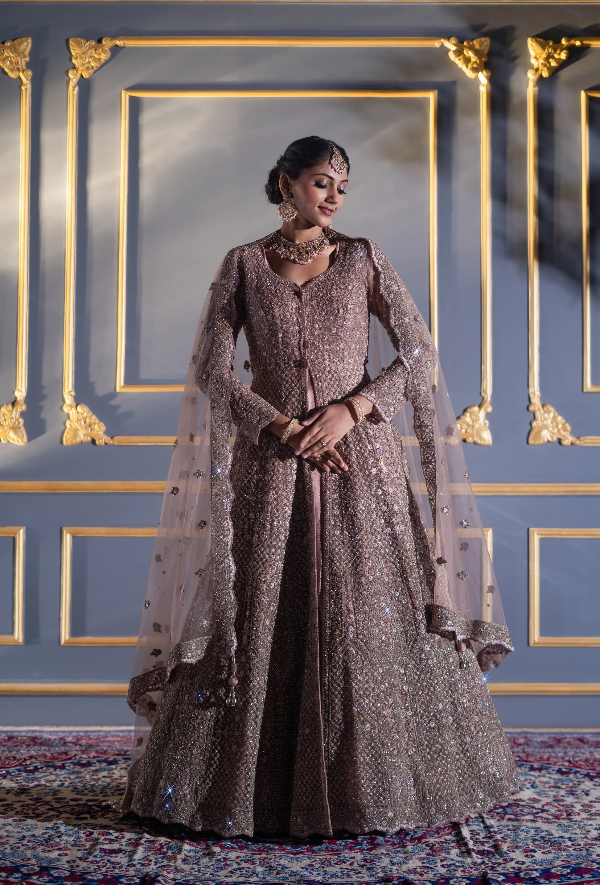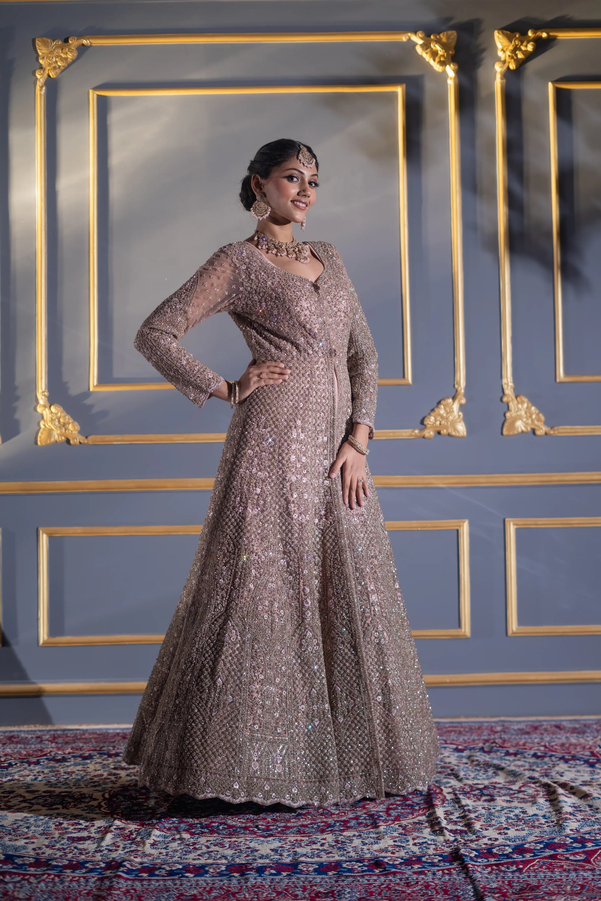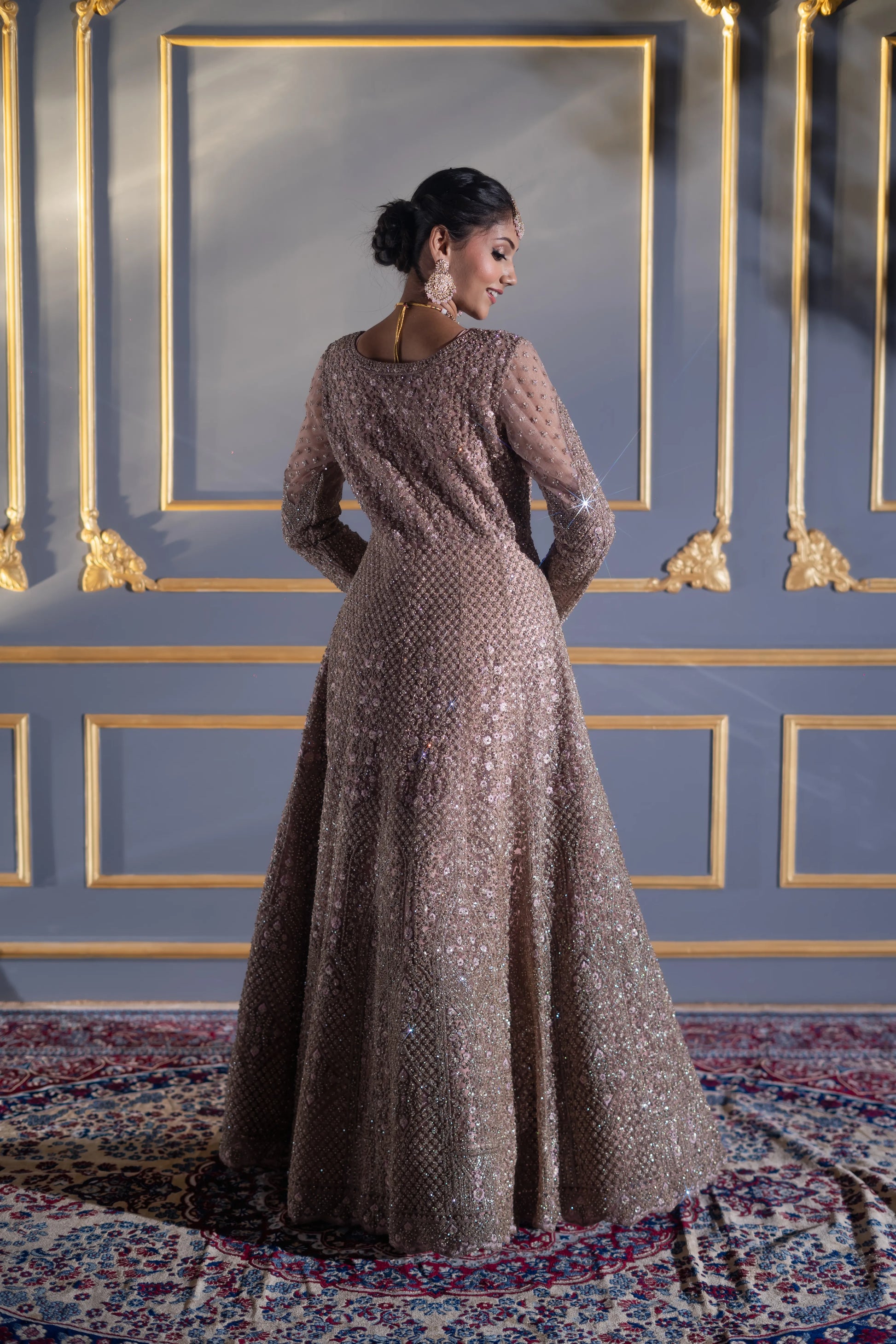 | Gown | Floor-length mocha A-line gown with dense sequin & cutdana embroidery |
