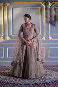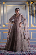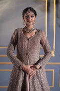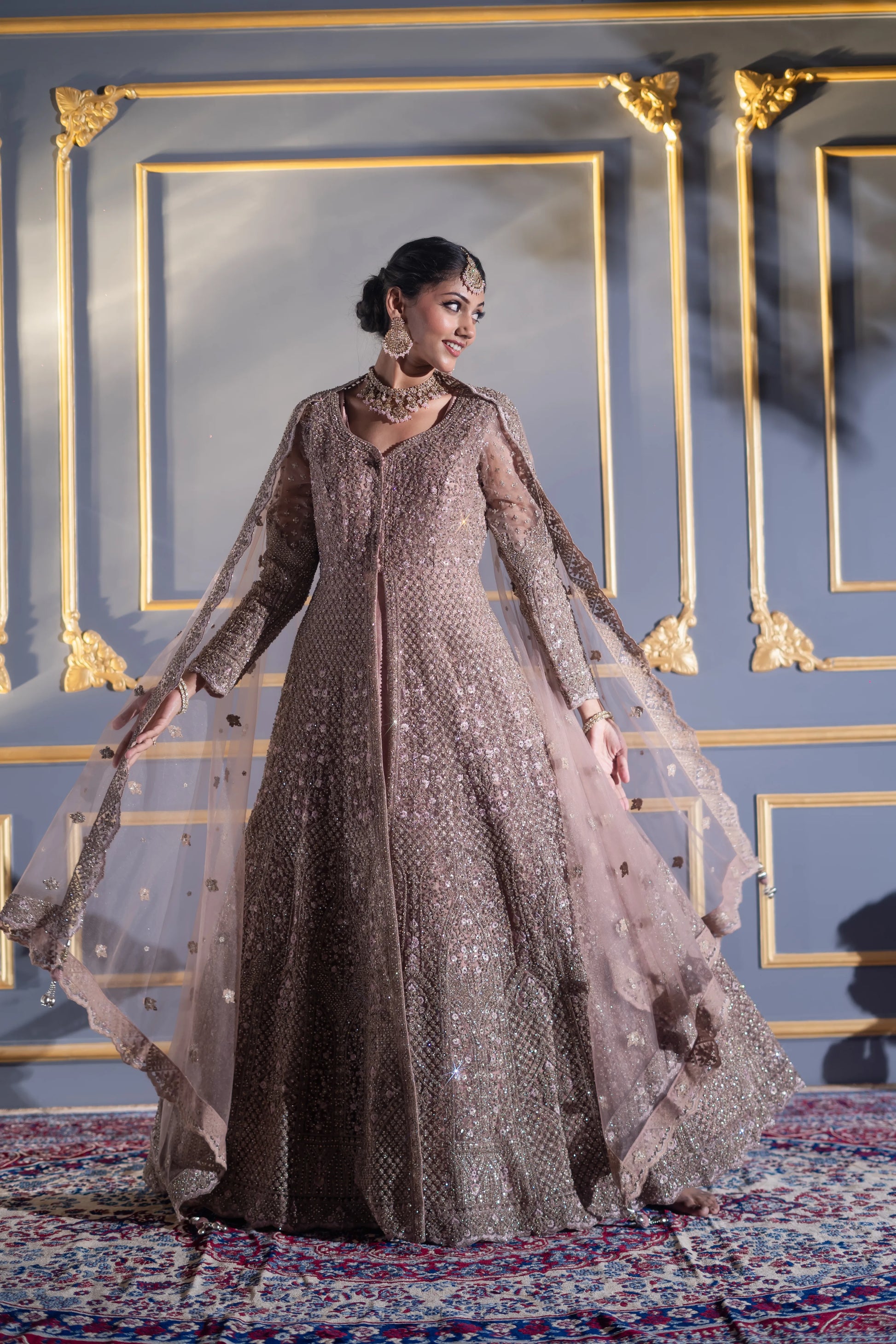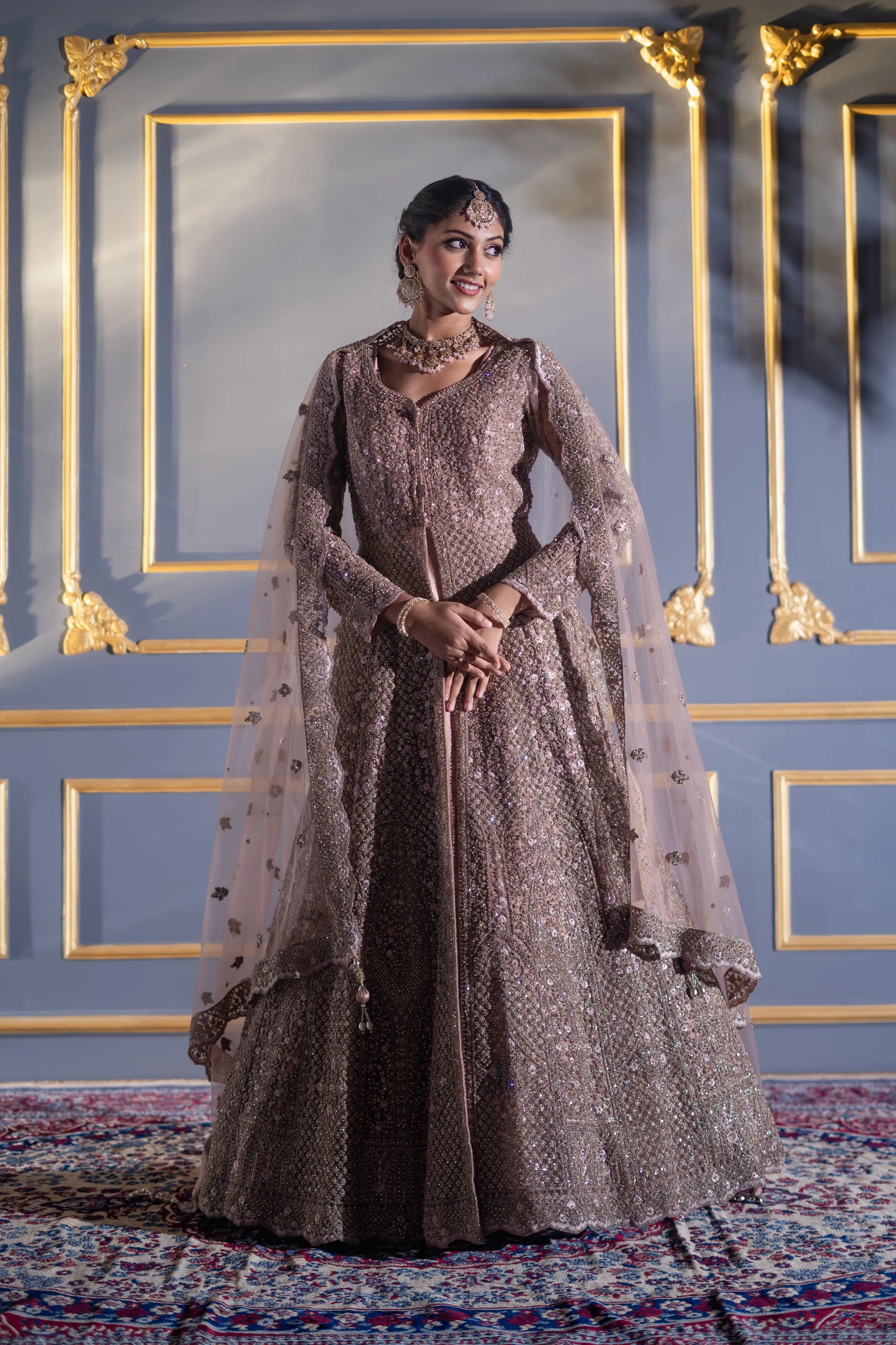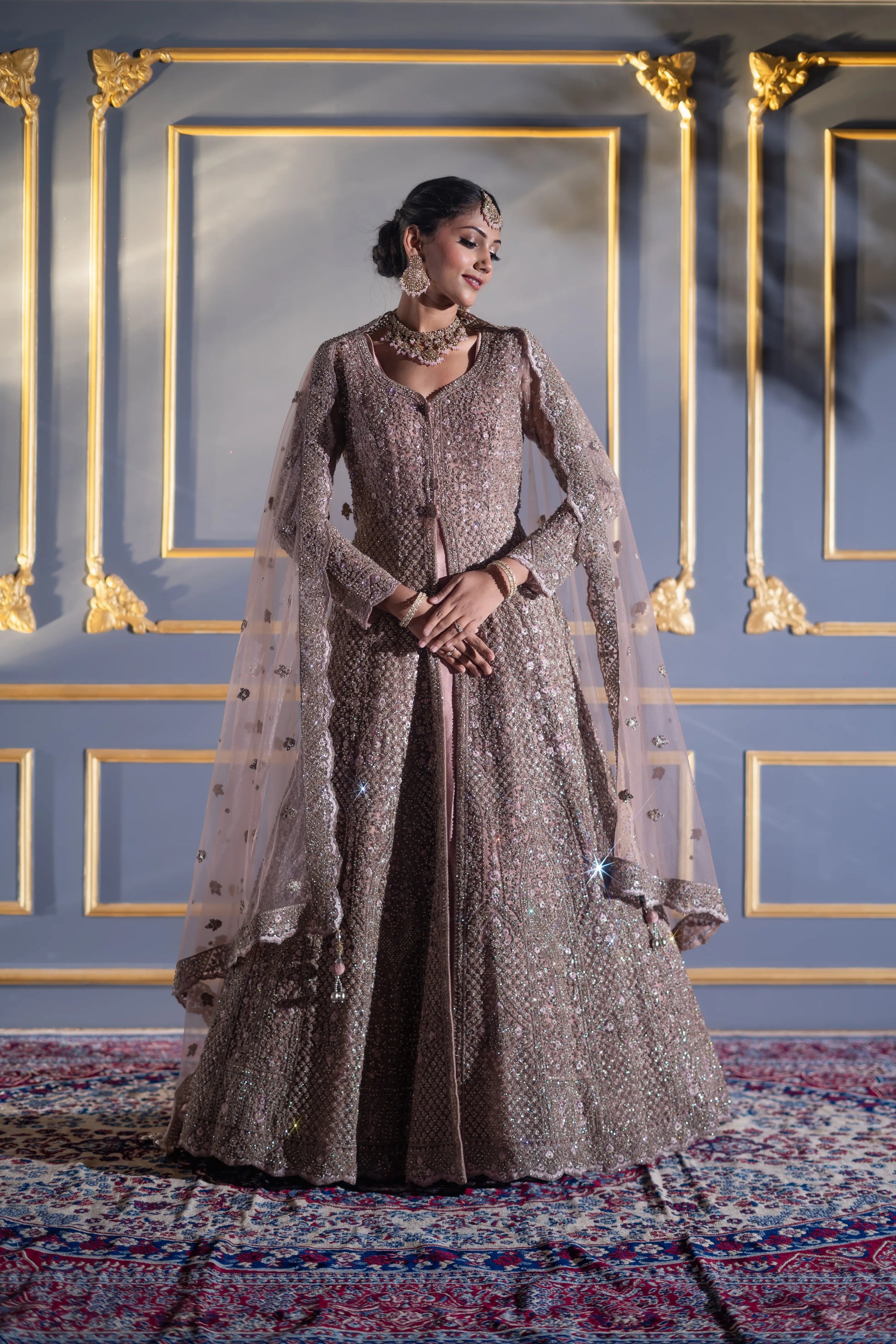 | Gown | Floor-length mocha A-line gown with dense sequin & cutdana embroidery |