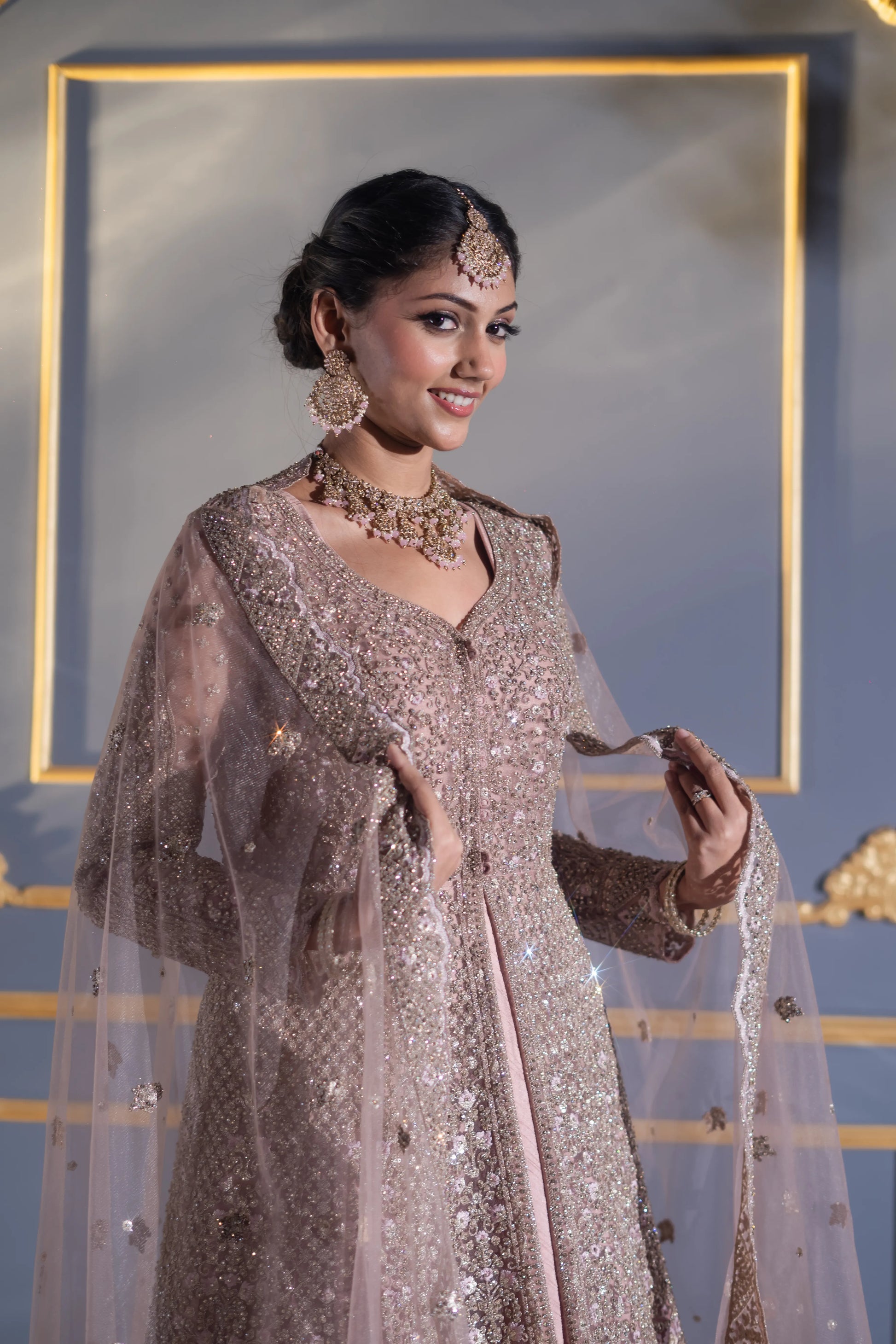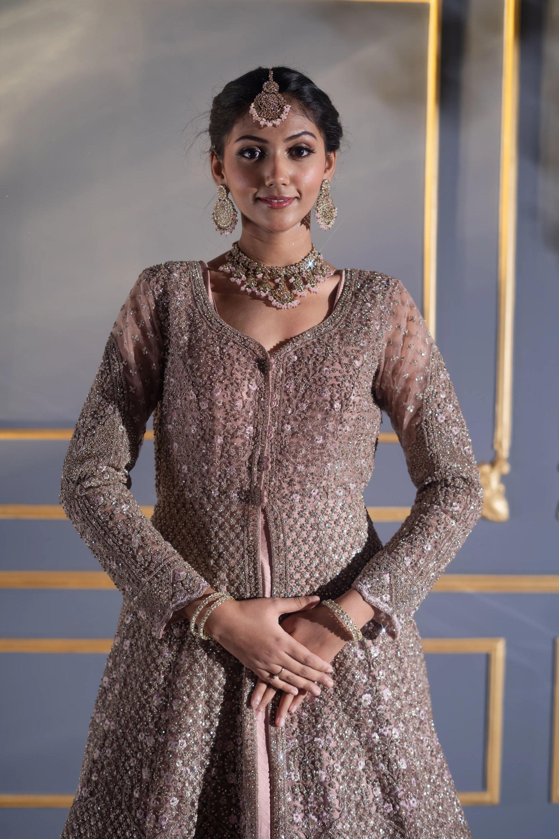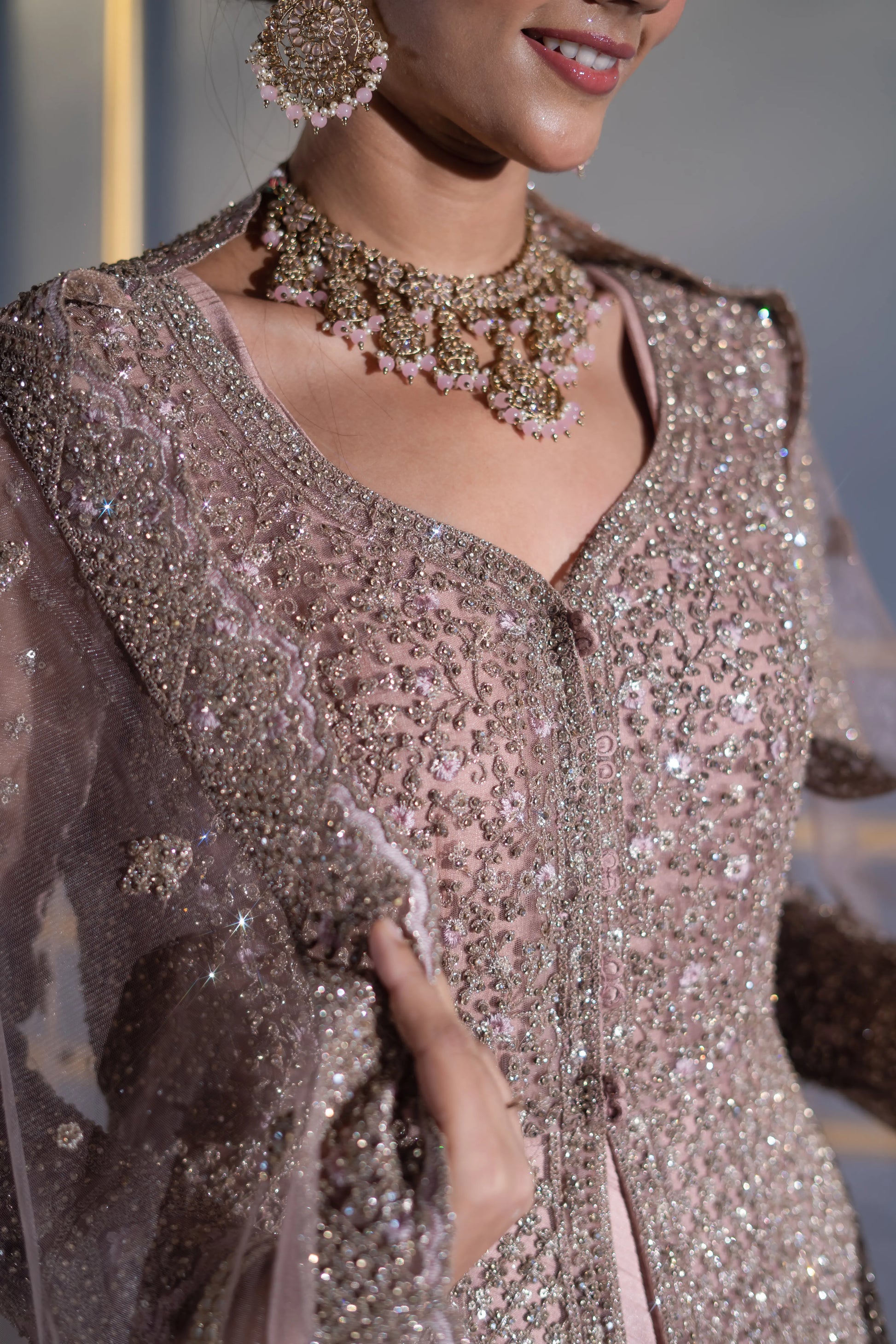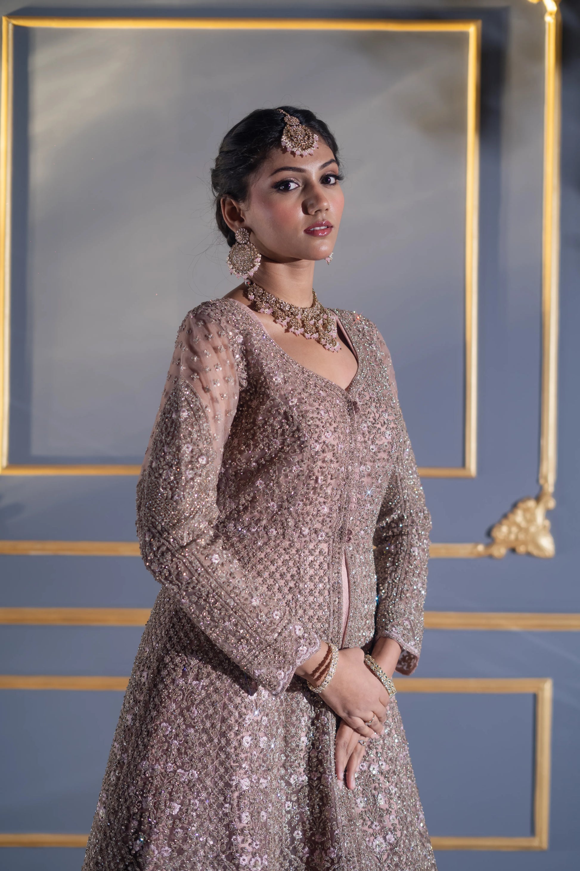 Soft sweetheart neckline with sheer full sleeves, each panel beautifully hand-embellished to balance modesty and glamour.