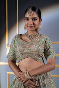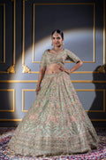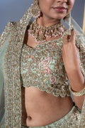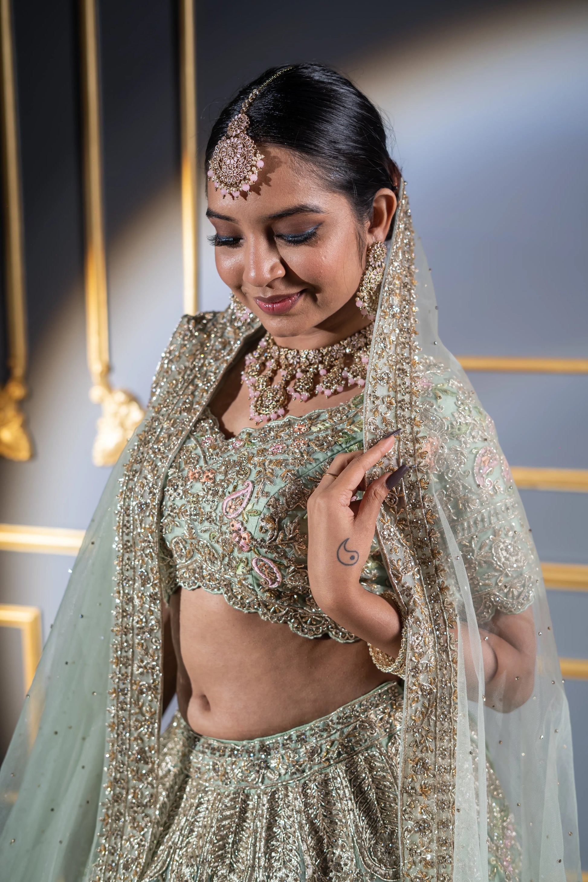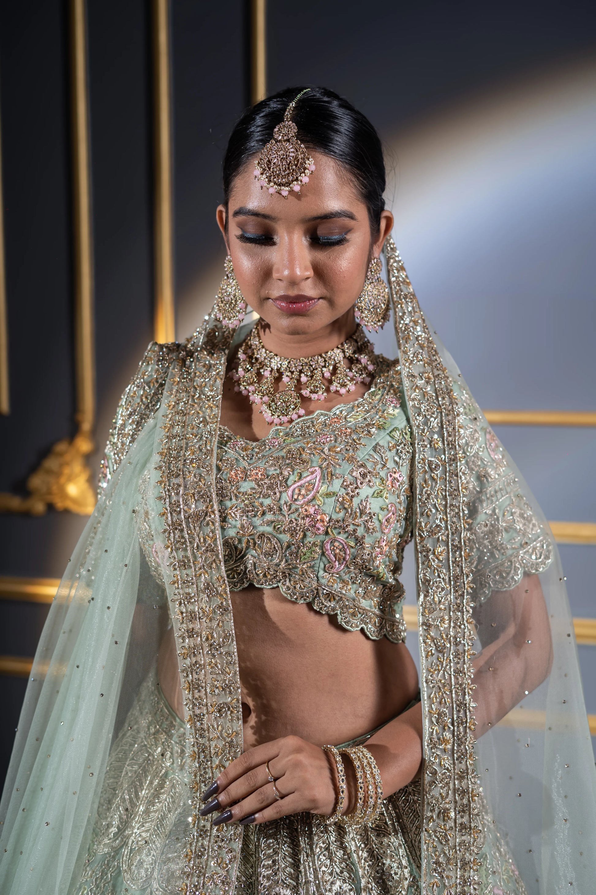 Mint Green & Pink Floral Embroidered Scalloped Bridal Lehenga