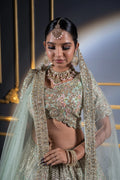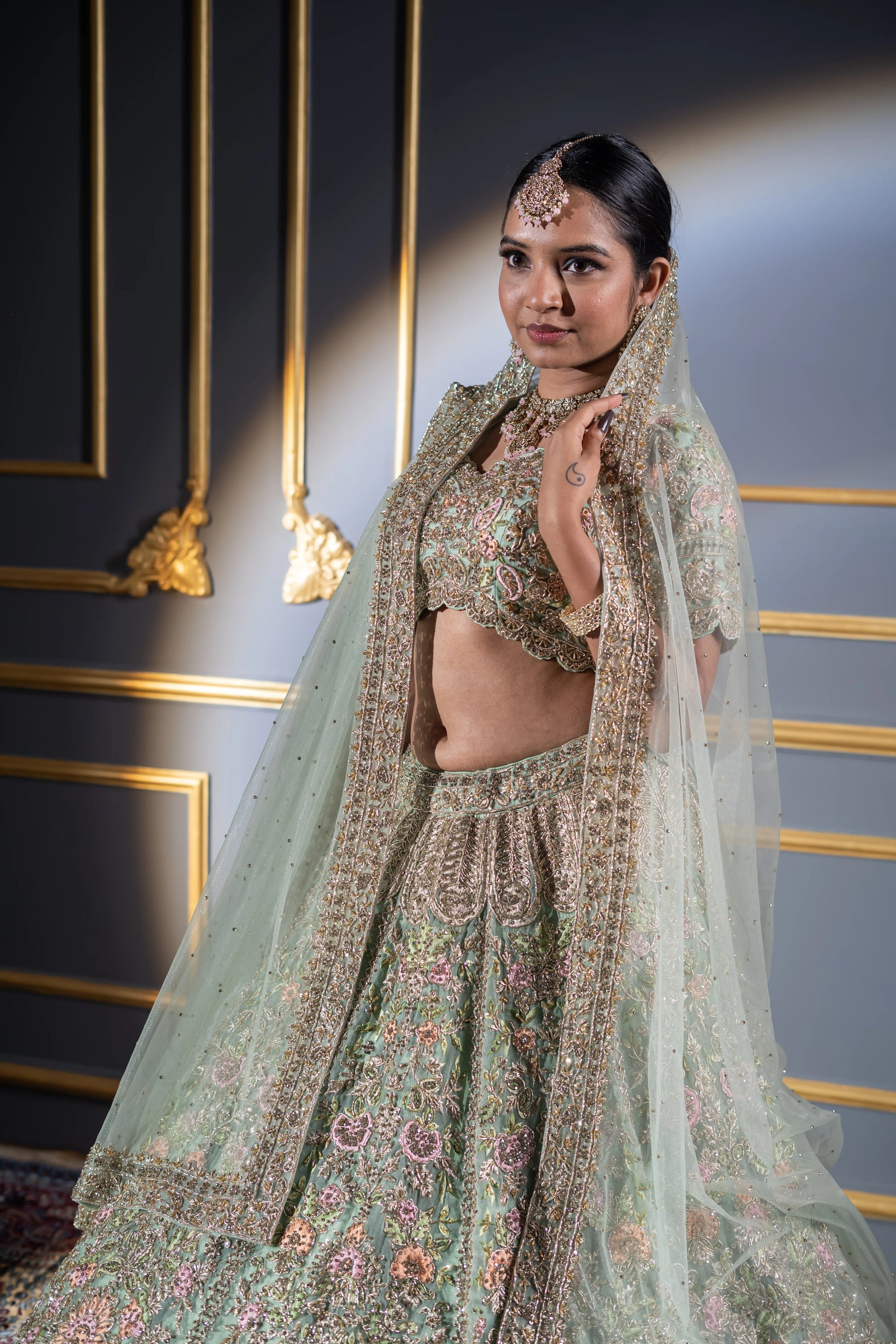 Refresh your bridal wardrobe with this enchanting Mint Green Bridal Lehenga. A breath of fresh air, this ensemble captures the essence of a blooming garden in spring. The soothing mint base is artfully contrasted with delicate pink and peach floral embroidery, creating a soft, romantic palette. Perfect for a day wedding, engagement, or Sangeet, this outfit is designed for the bride who wants to radiate youthfulness and grace.