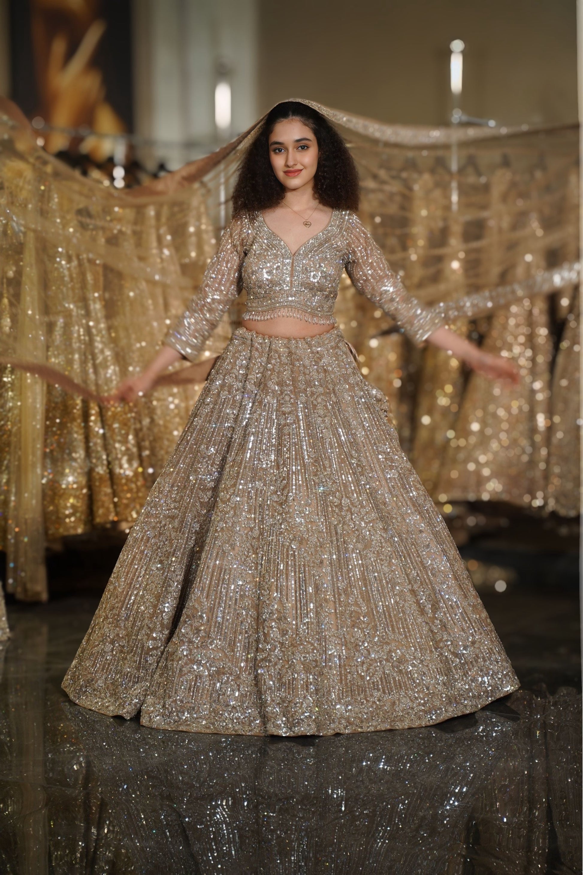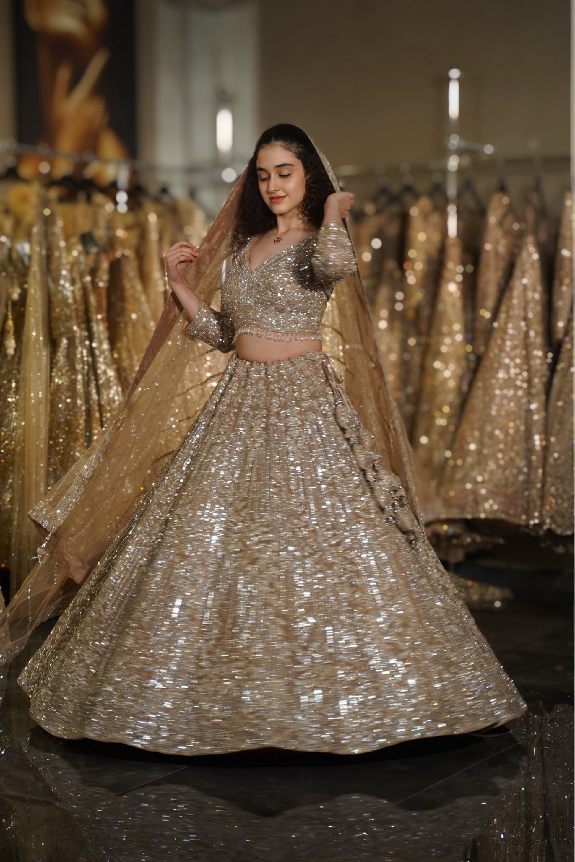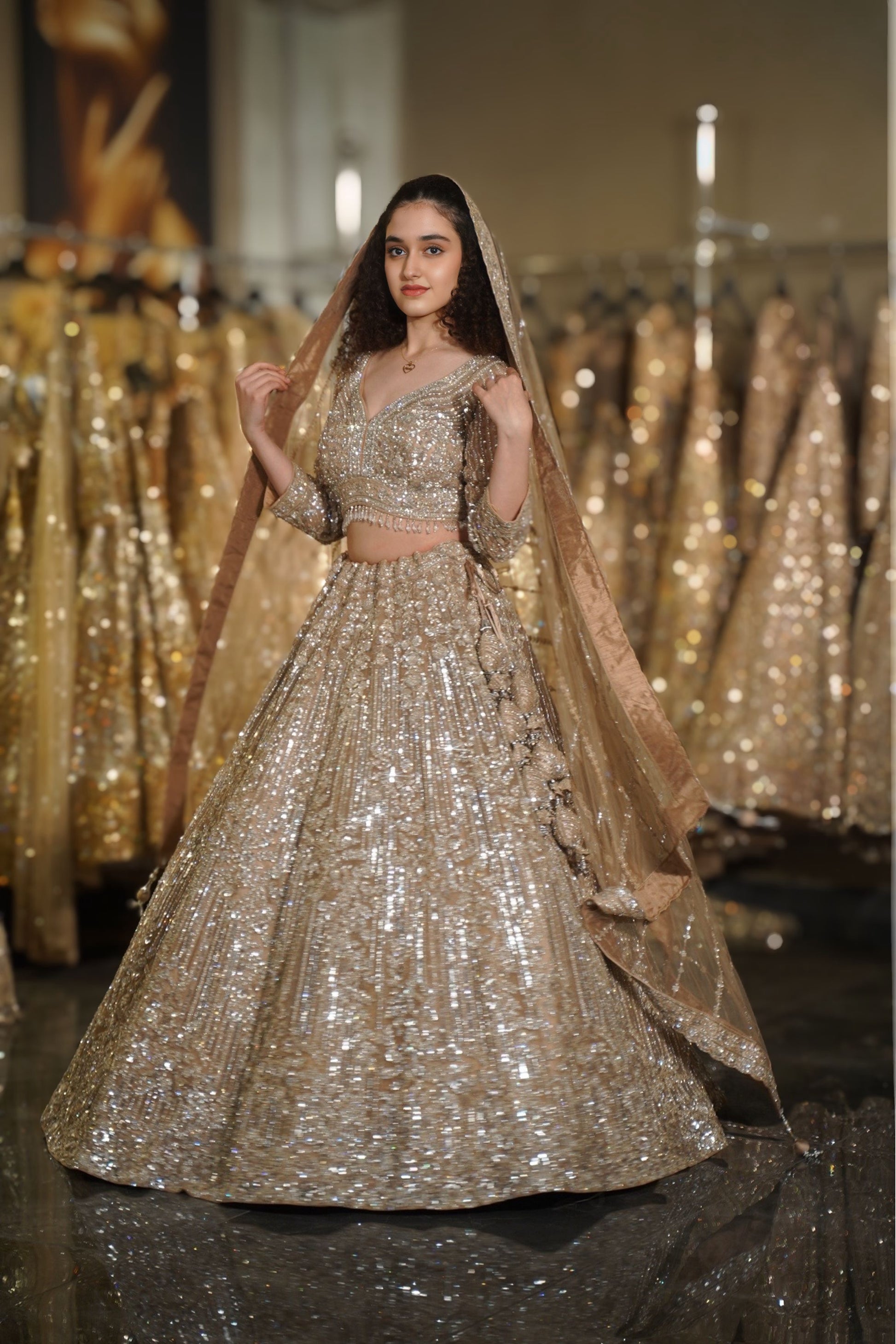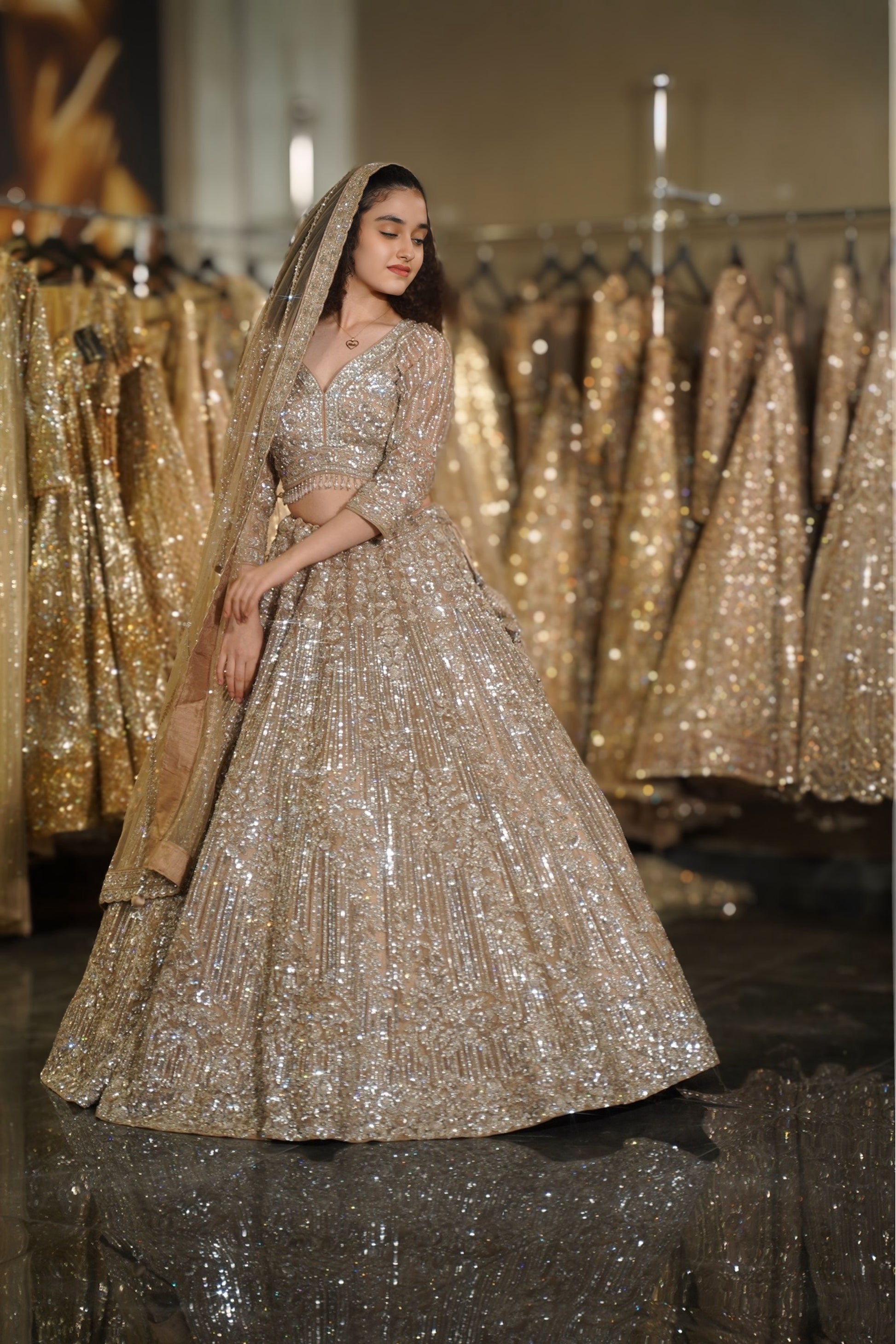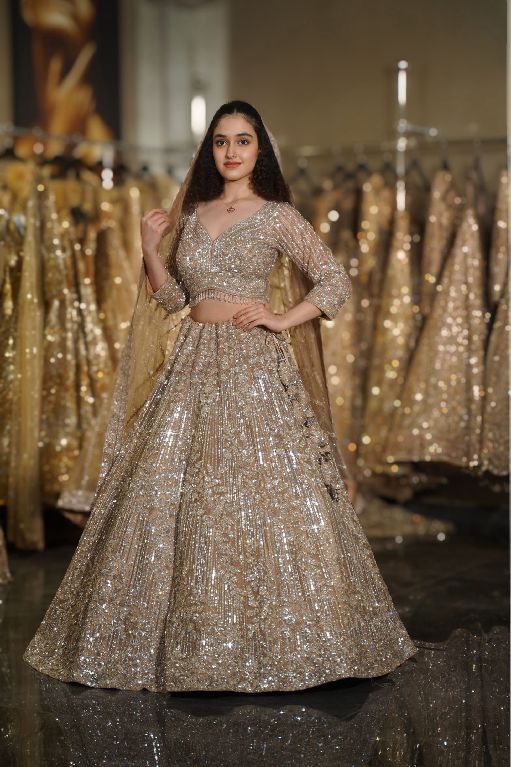 Champagne Gold Linear & Floral Sequin Embroidered Lehenga Set