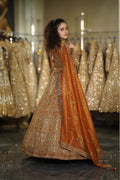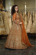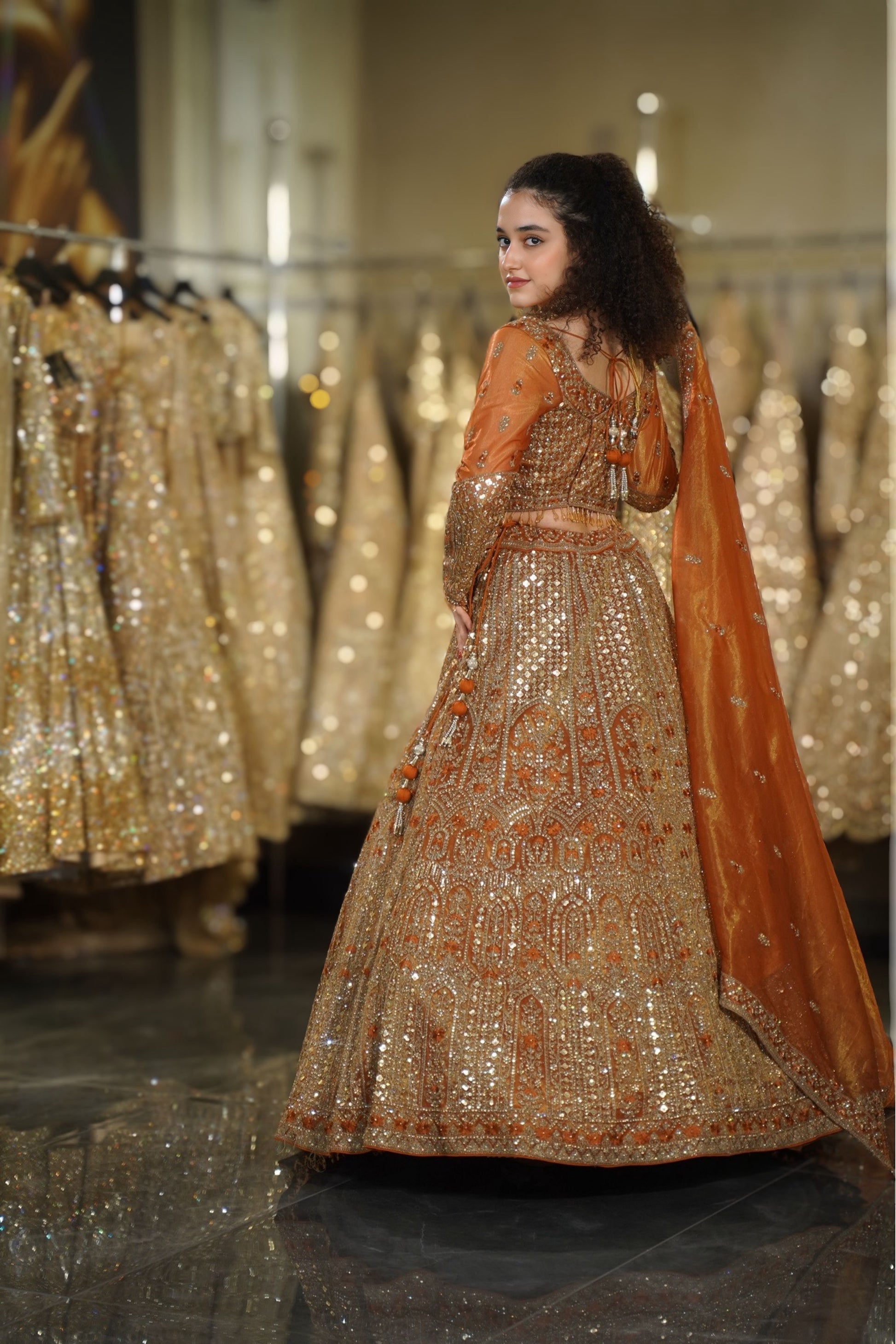 Embrace the warmth of tradition with a textural twist in this stunning Rust Orange Lehenga Set. This unique ensemble stands out with its luxurious mix of textures, featuring a heavy sequin-encrusted skirt paired with a statement crushed shimmer dupatta. The rich burnt copper hue radiates an earthy elegance, making it an impeccable choice for the bride who wants to combine regal grandeur with distinct, high-fashion fabric detailing for her wedding or sangeet.
