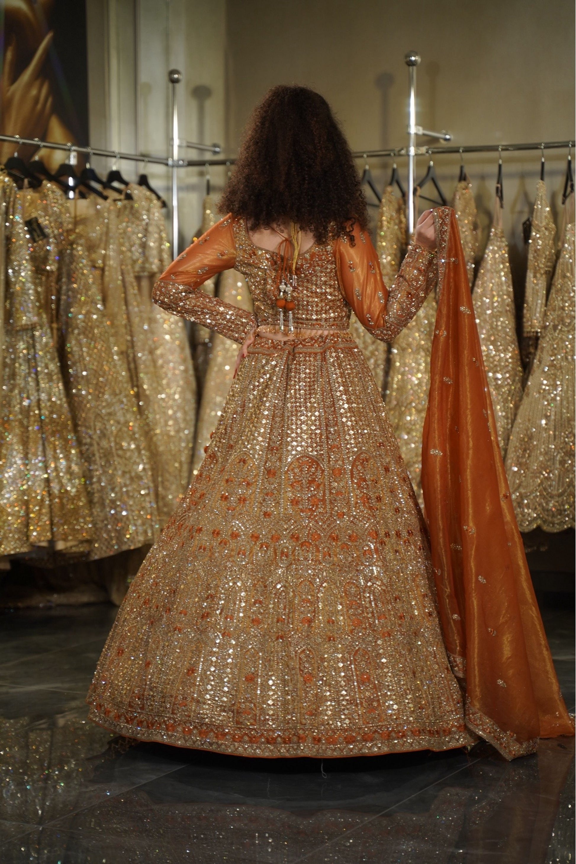 Rust Orange Crushed Shimmer Dupatta & Architectural Sequin Lehenga Set