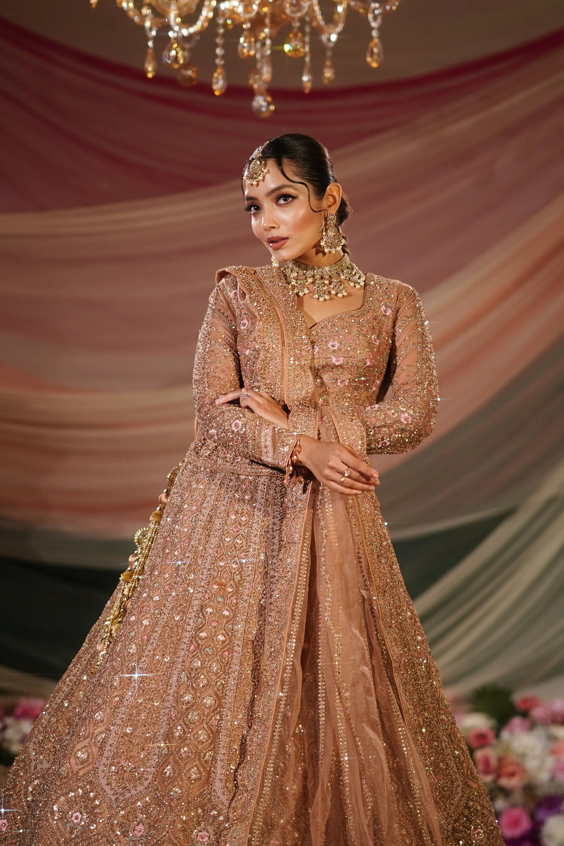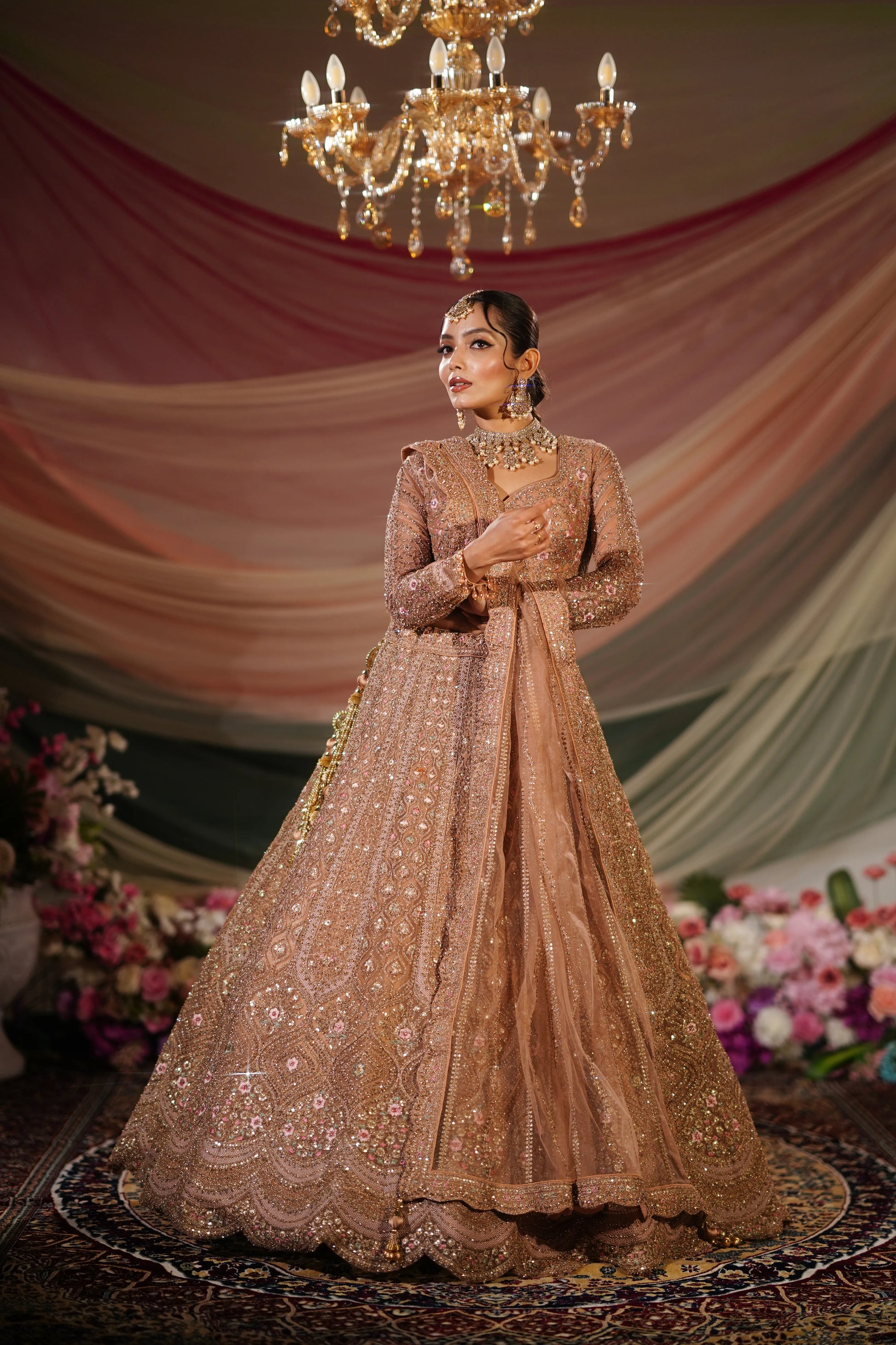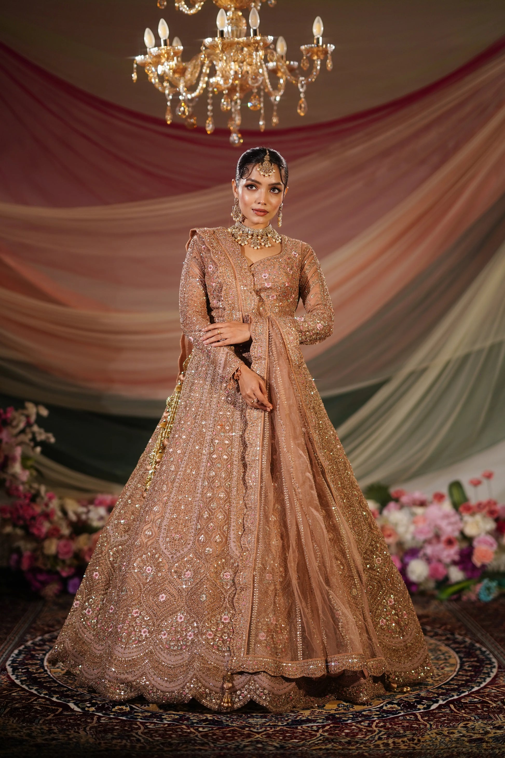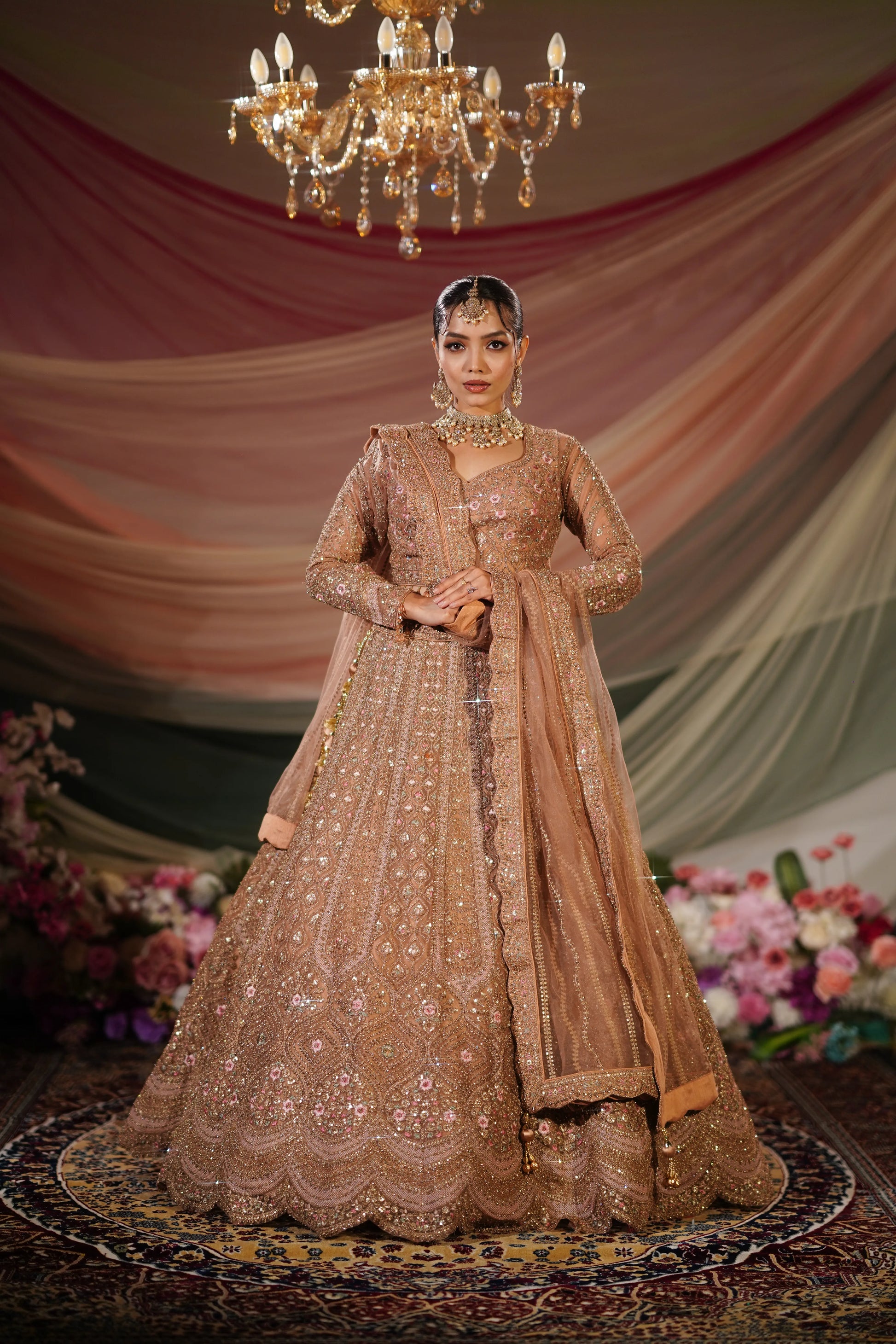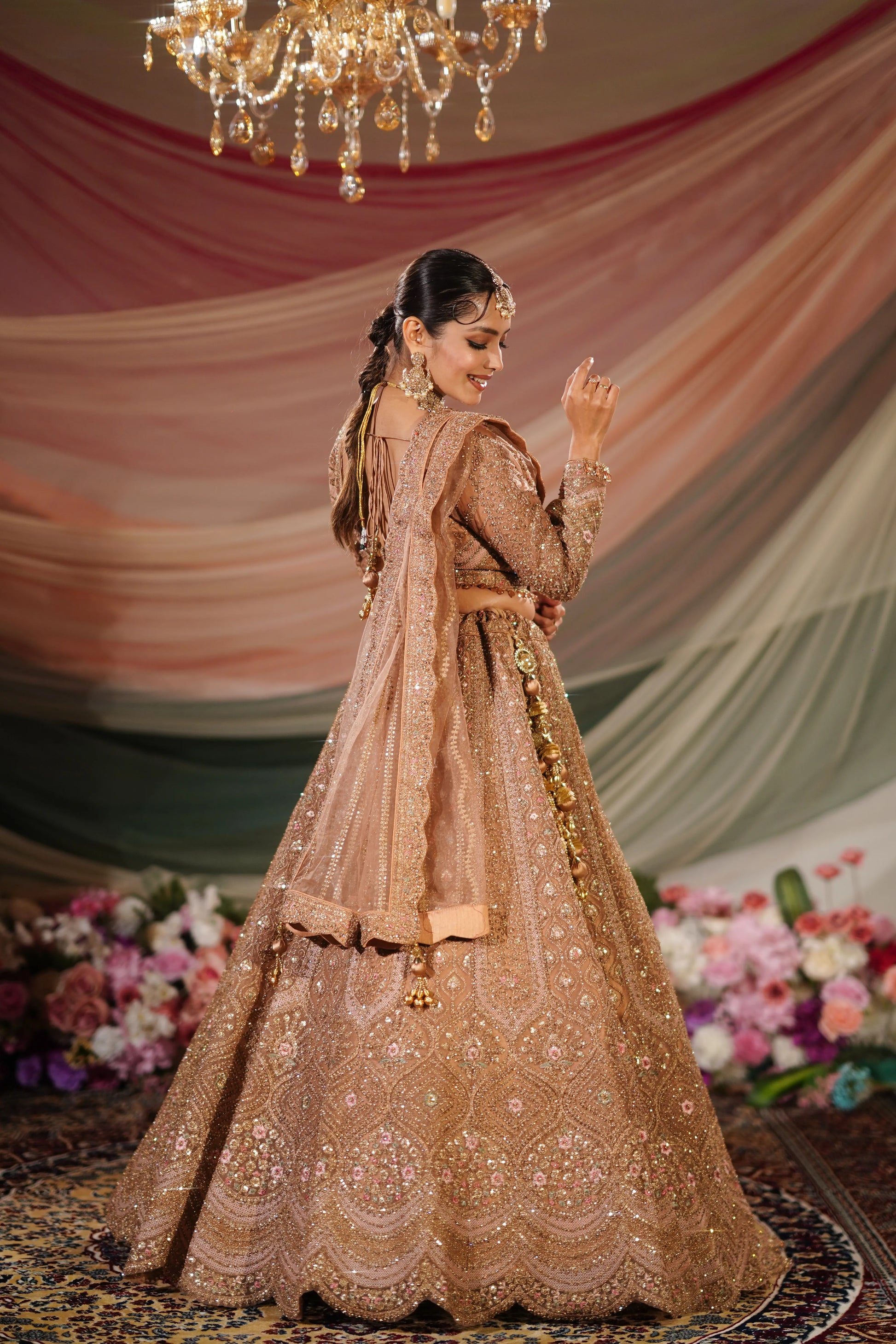 Step into a bygone era of royalty with this mesmerizing Dusty Rose Lehenga Set. This exquisite ensemble stands out with its unique blend of antique gold metallic work and delicate multi-colored thread (resham) embroidery. The intricate floral motifs blooming within regal arched patterns create a romantic narrative, perfect for the bride who cherishes vintage aesthetics and timeless elegance.