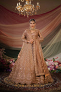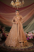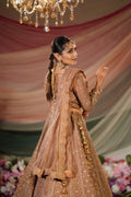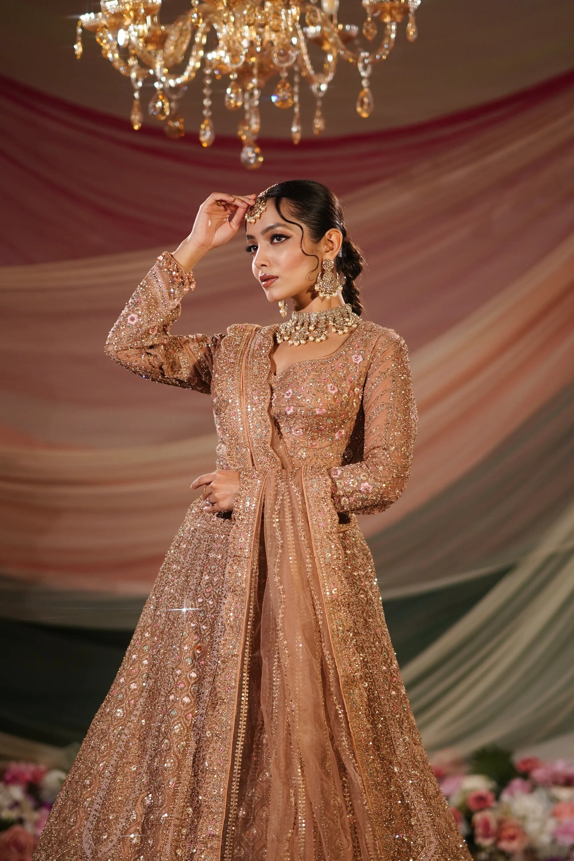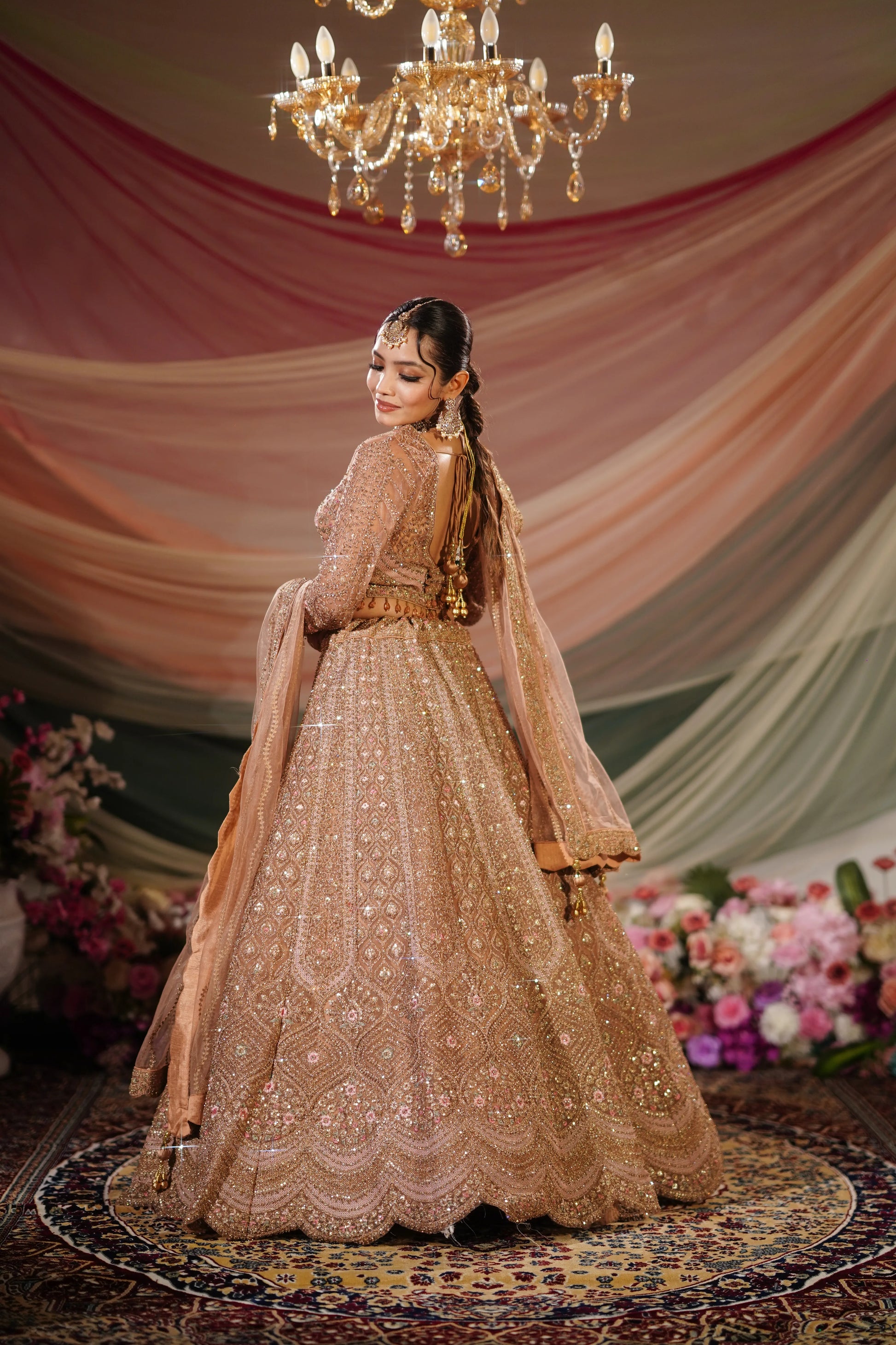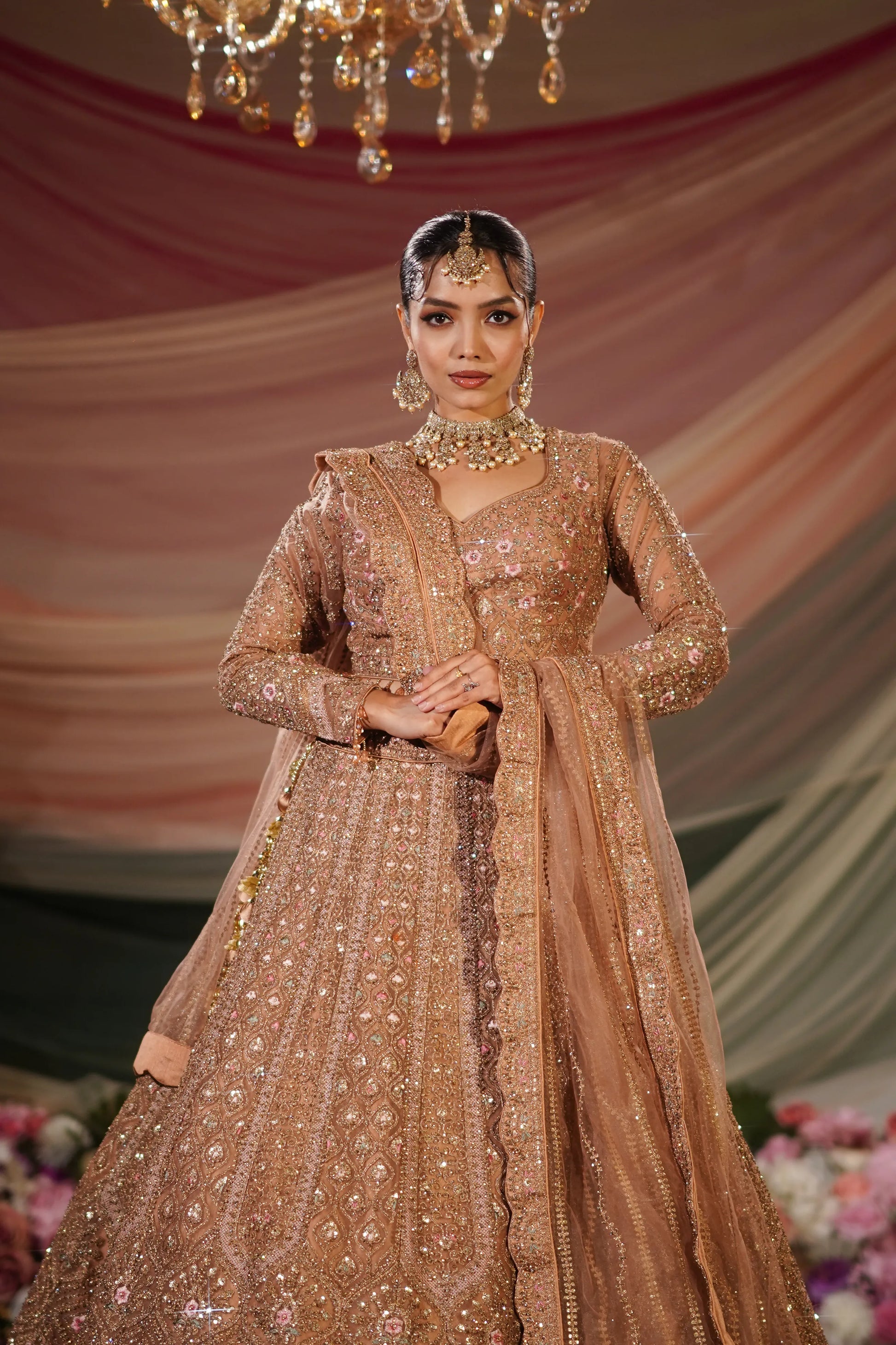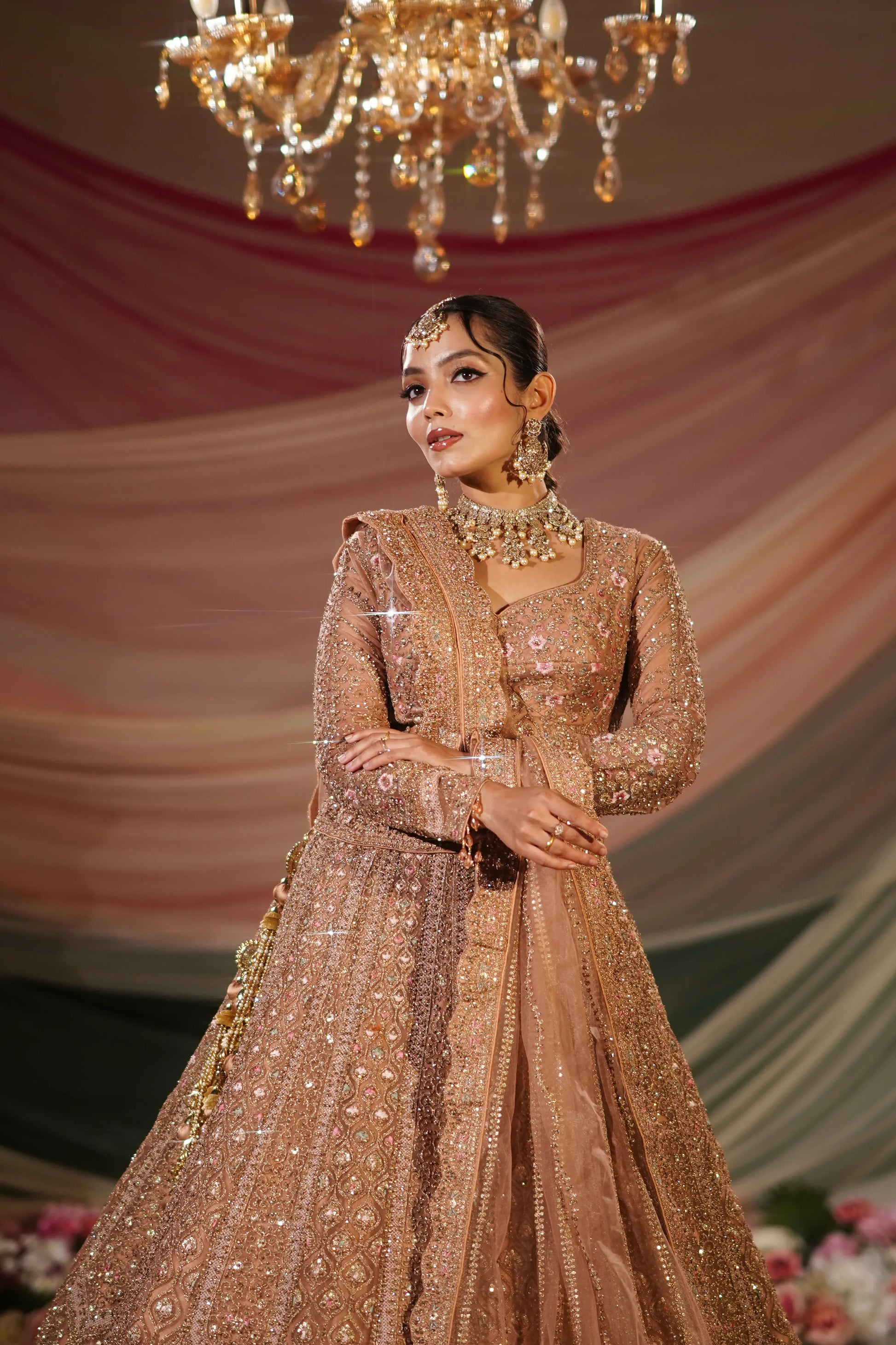 Step into a bygone era of royalty with this mesmerizing Dusty Rose Lehenga Set. This exquisite ensemble stands out with its unique blend of antique gold metallic work and delicate multi-colored thread (resham) embroidery. The intricate floral motifs blooming within regal arched patterns create a romantic narrative, perfect for the bride who cherishes vintage aesthetics and timeless elegance.