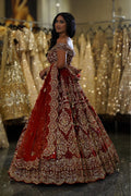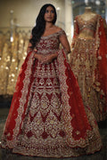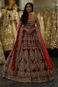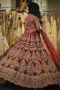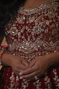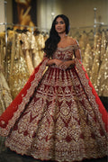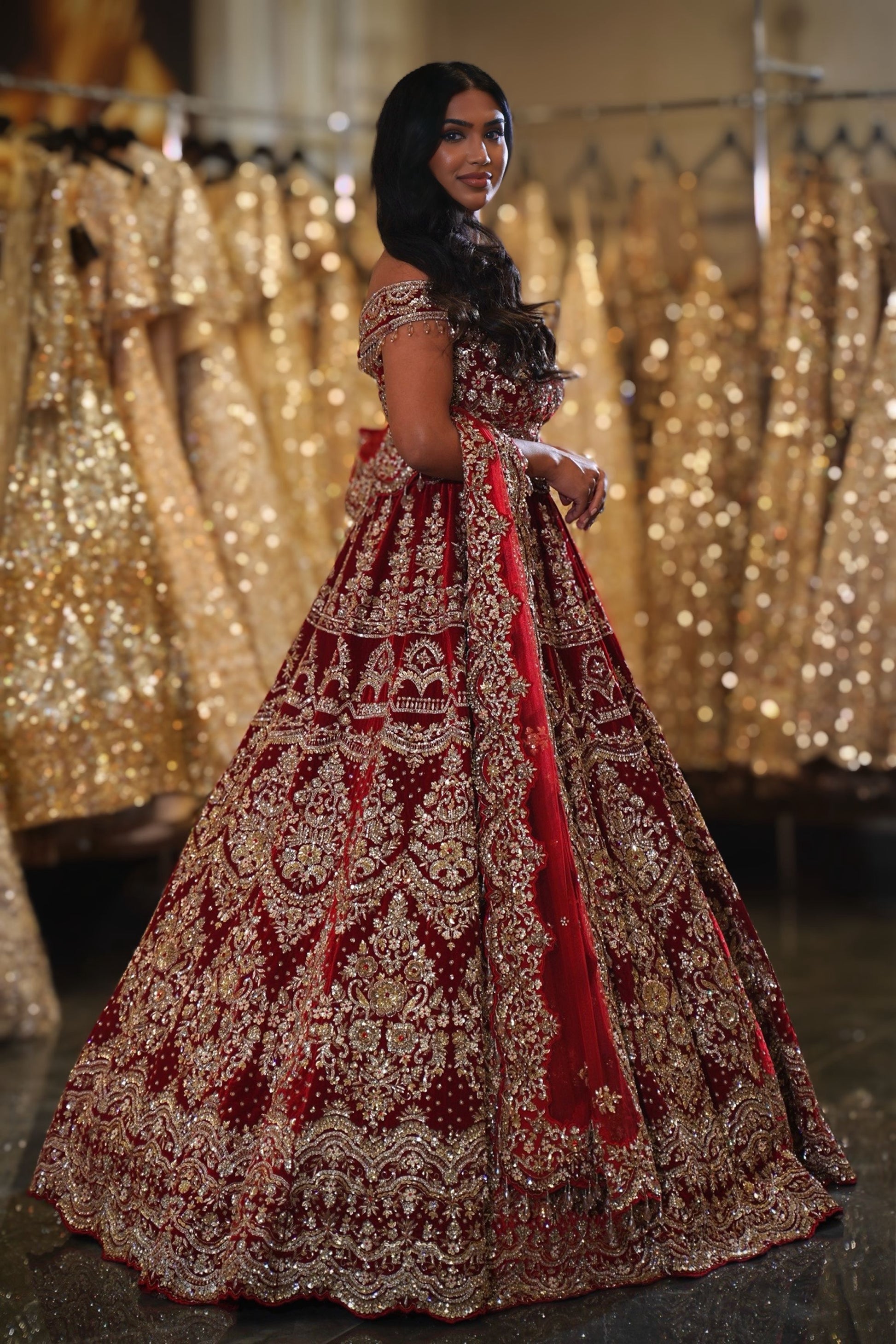 Deep Crimson Red Velvet Off-Shoulder Zardosi Embroidered Bridal Lehenga