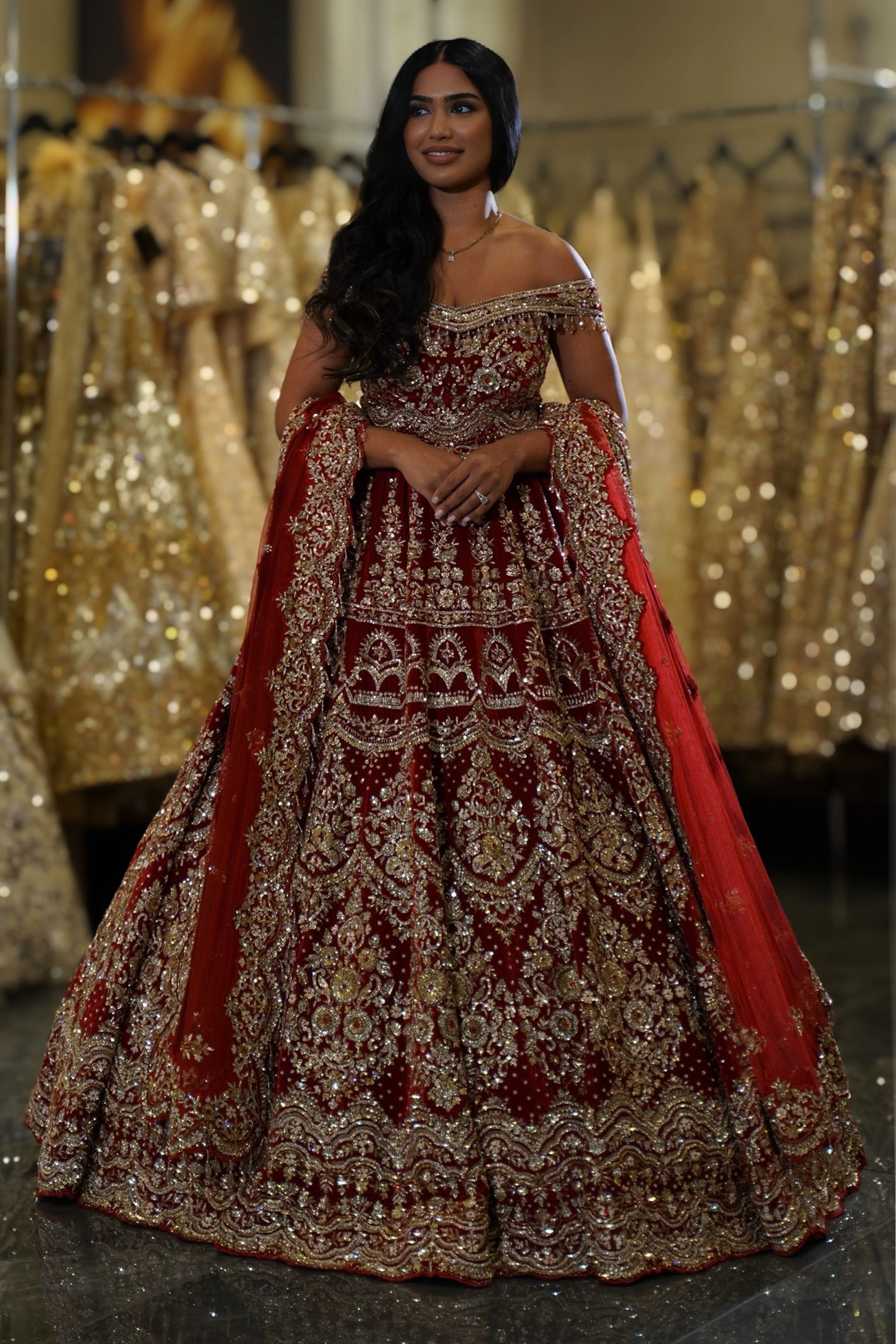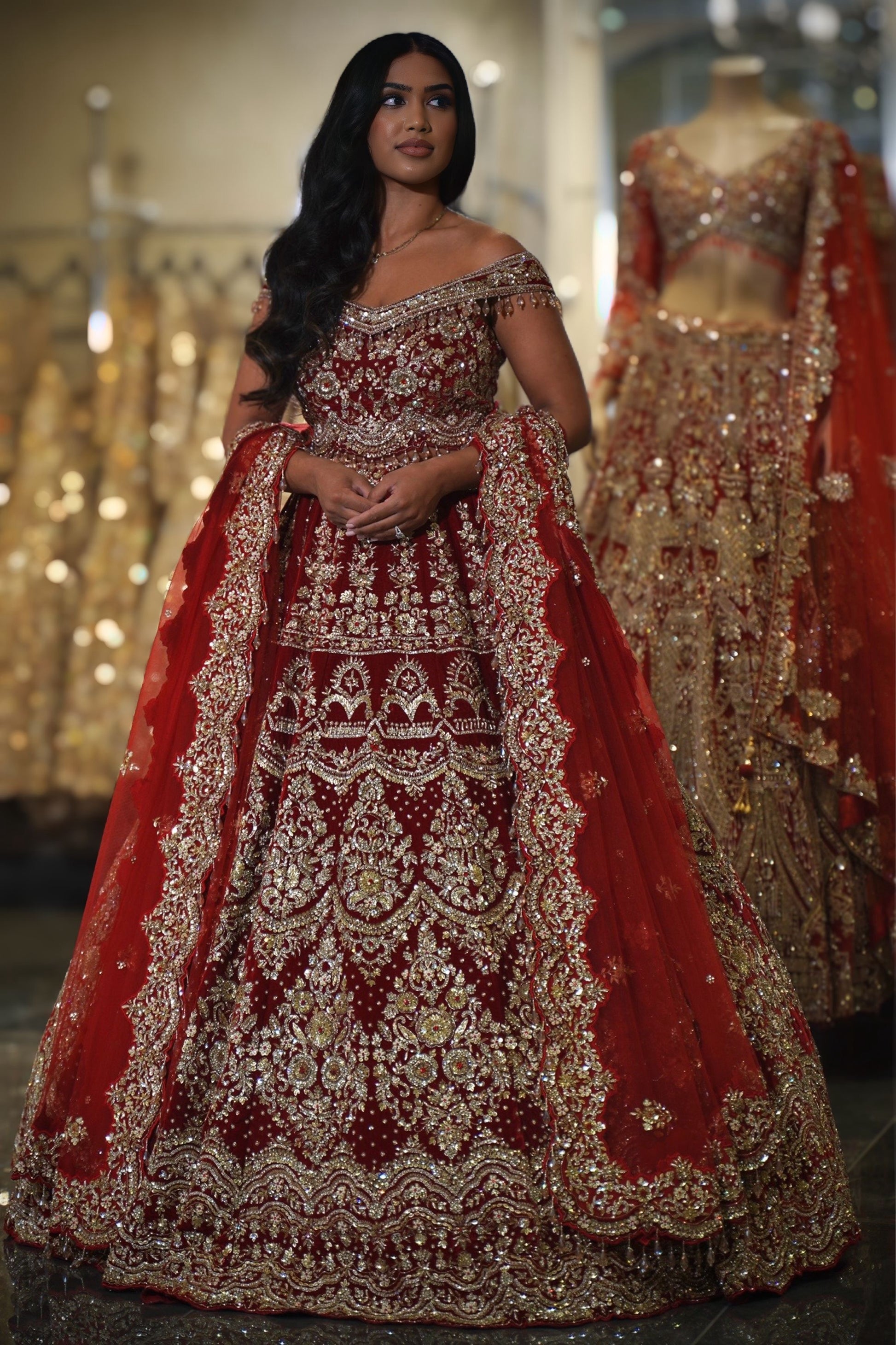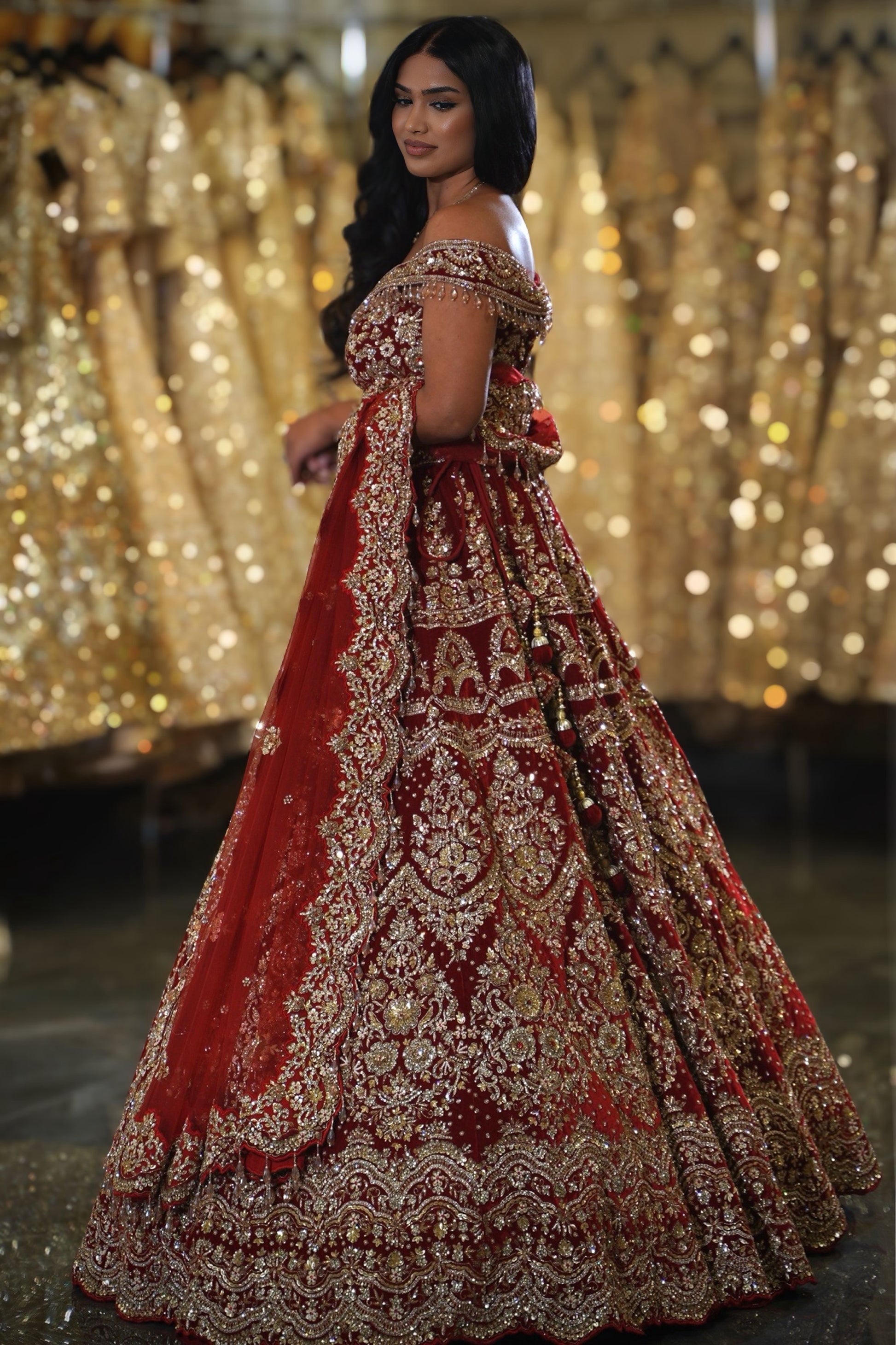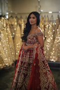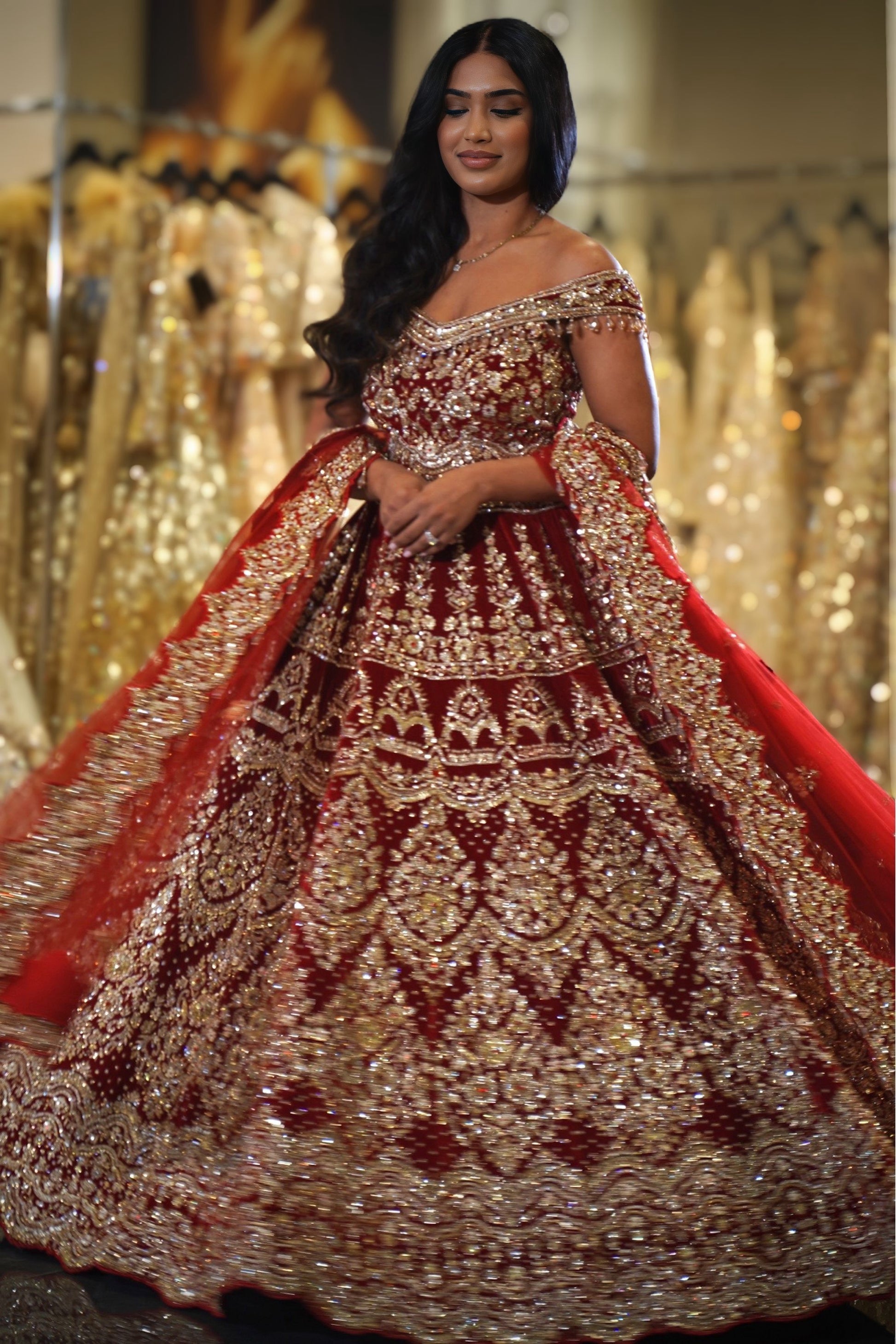 Command the aisle with this breathtaking Crimson Red Velvet Bridal Lehenga. A perfect fusion of timeless heritage and contemporary fashion, this ensemble features a rich, deep red velvet base that exudes regal grandeur. The classic heavy gold embroidery is paired with a stunning off-shoulder blouse, designed for the bride who wants to blend the modesty of tradition with a touch of modern glamour.