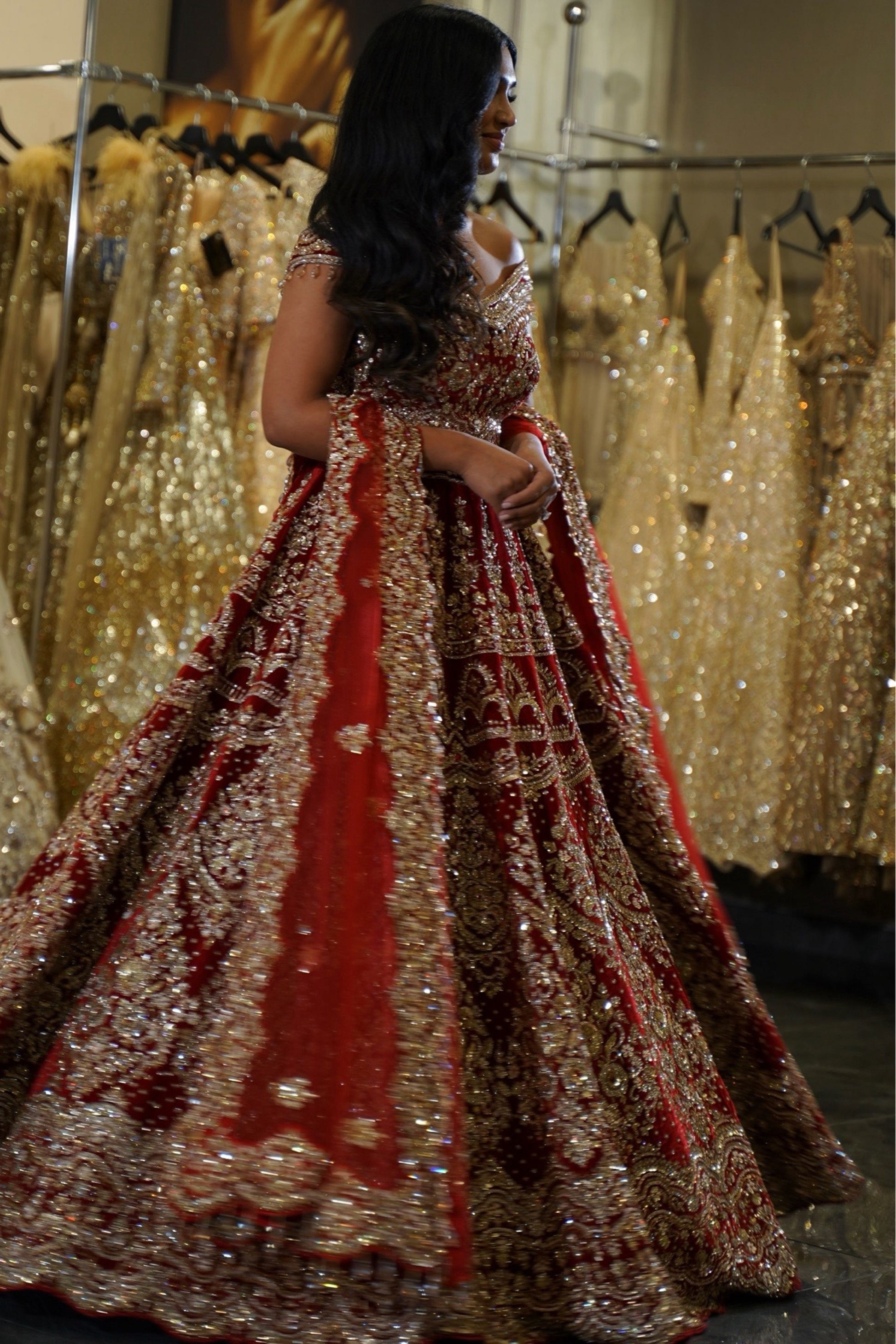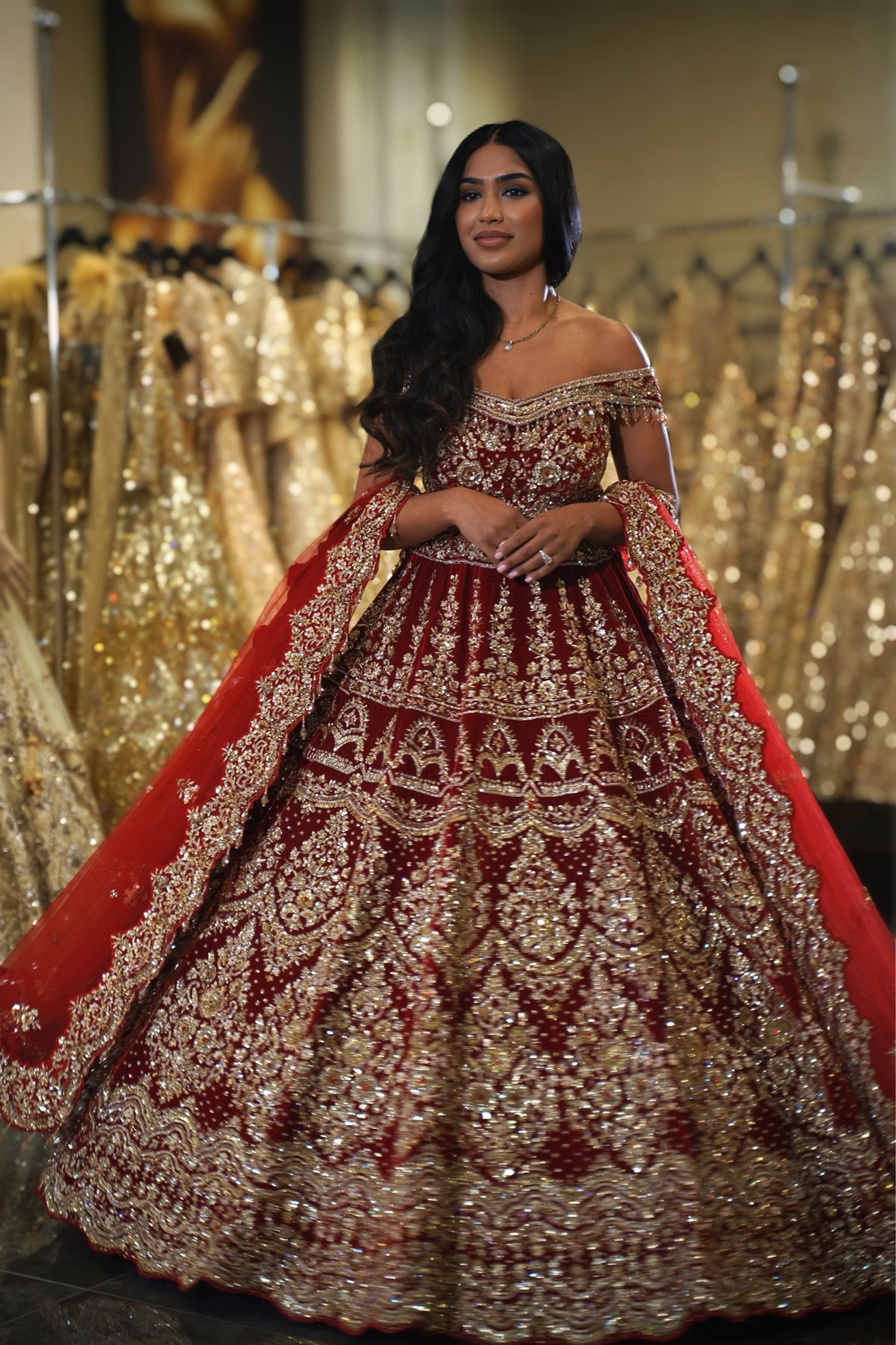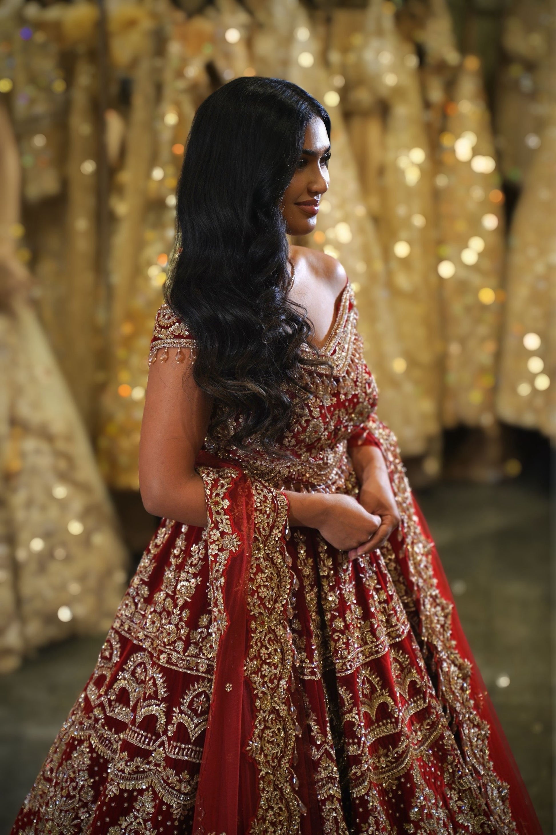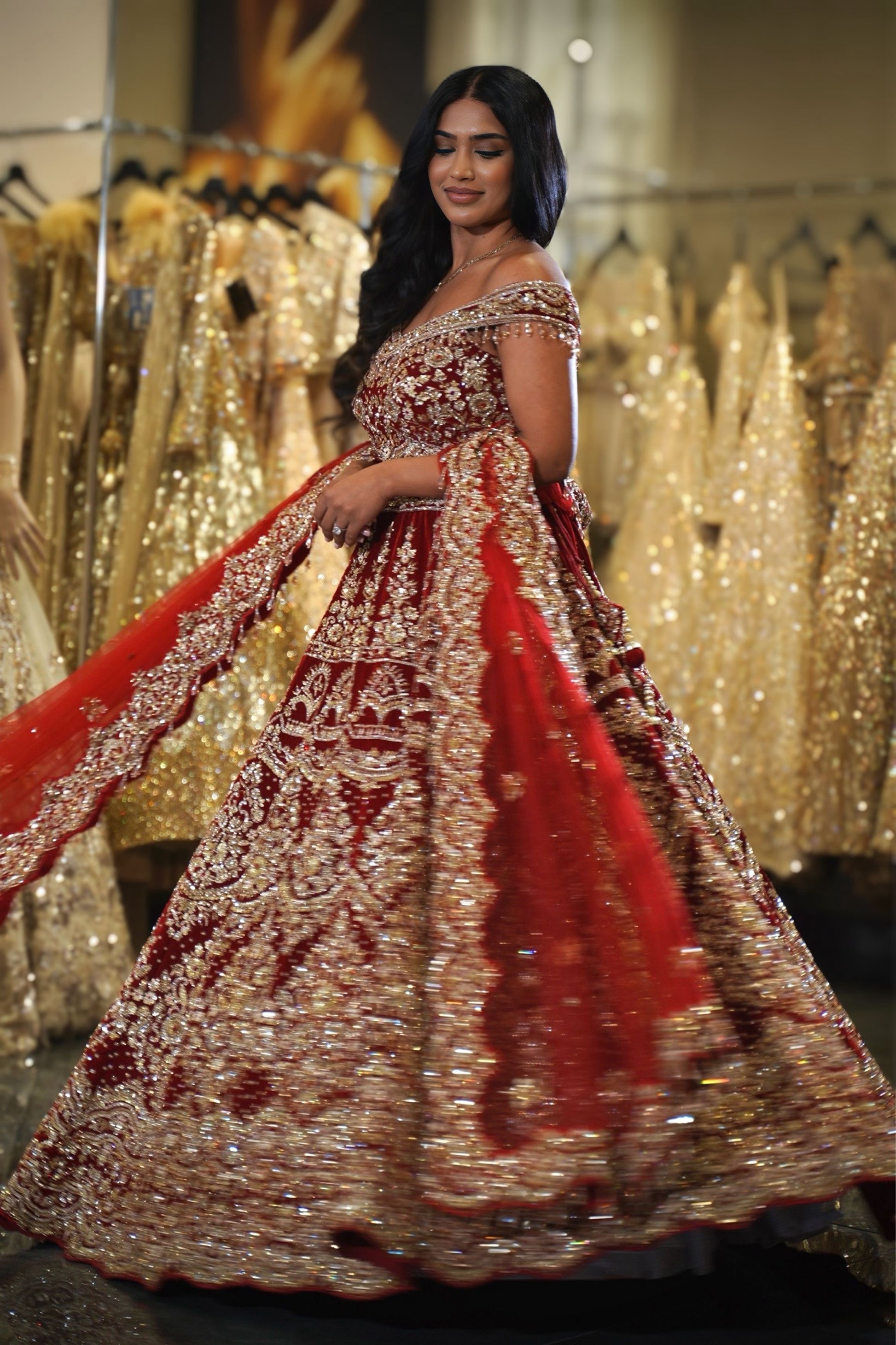 Command the aisle with this breathtaking Crimson Red Velvet Bridal Lehenga. A perfect fusion of timeless heritage and contemporary fashion, this ensemble features a rich, deep red velvet base that exudes regal grandeur. The classic heavy gold embroidery is paired with a stunning off-shoulder blouse, designed for the bride who wants to blend the modesty of tradition with a touch of modern glamour.