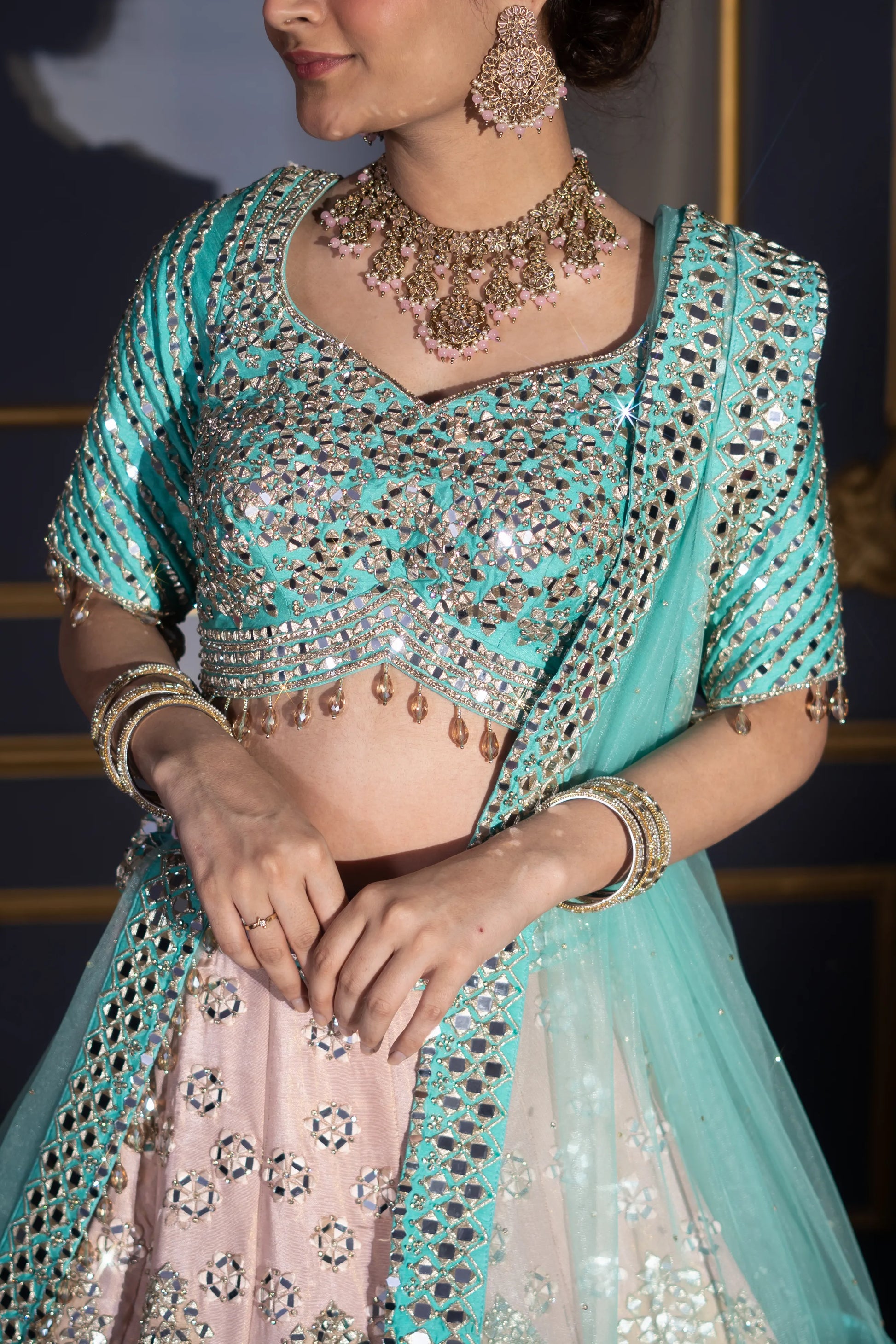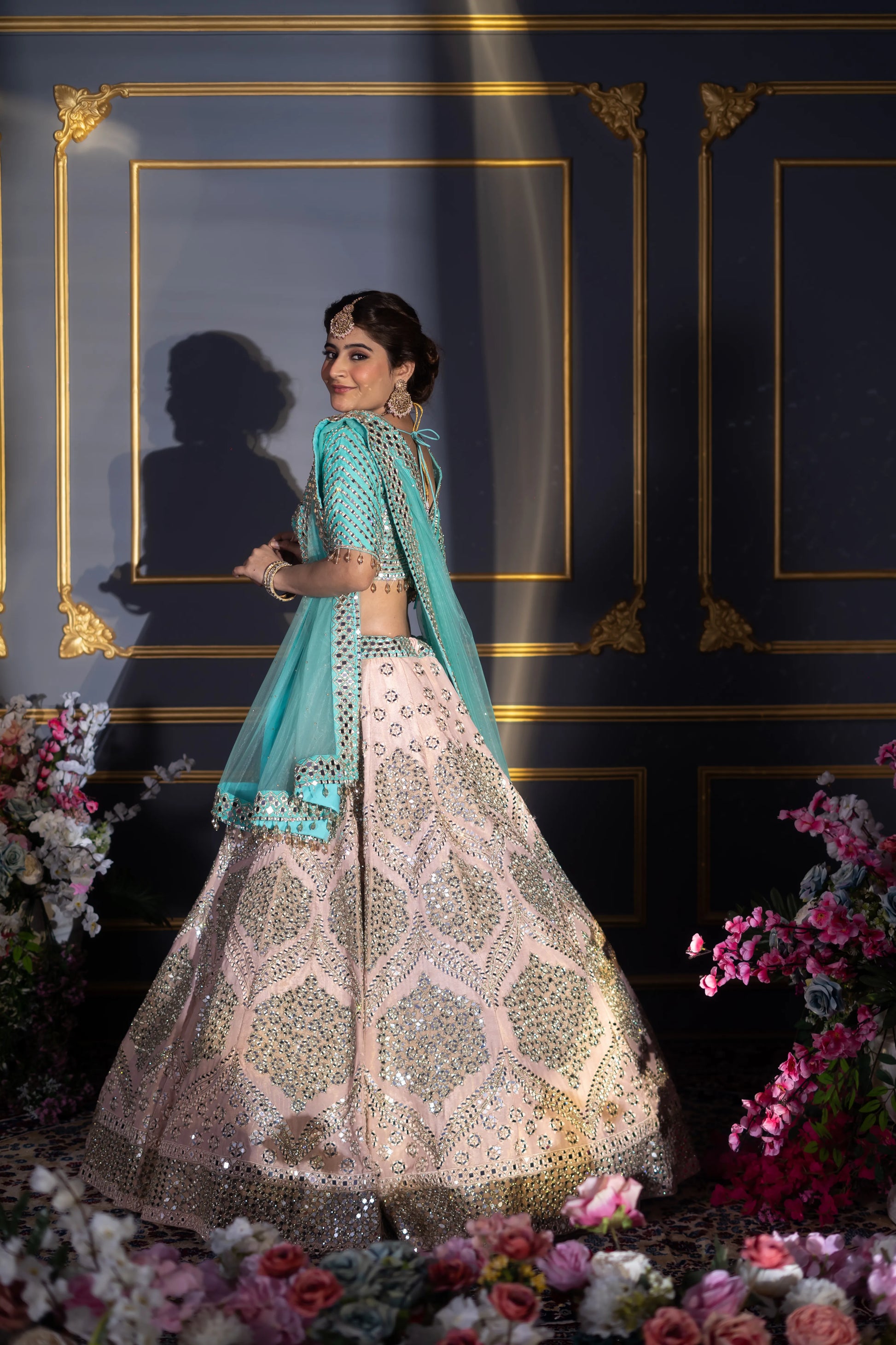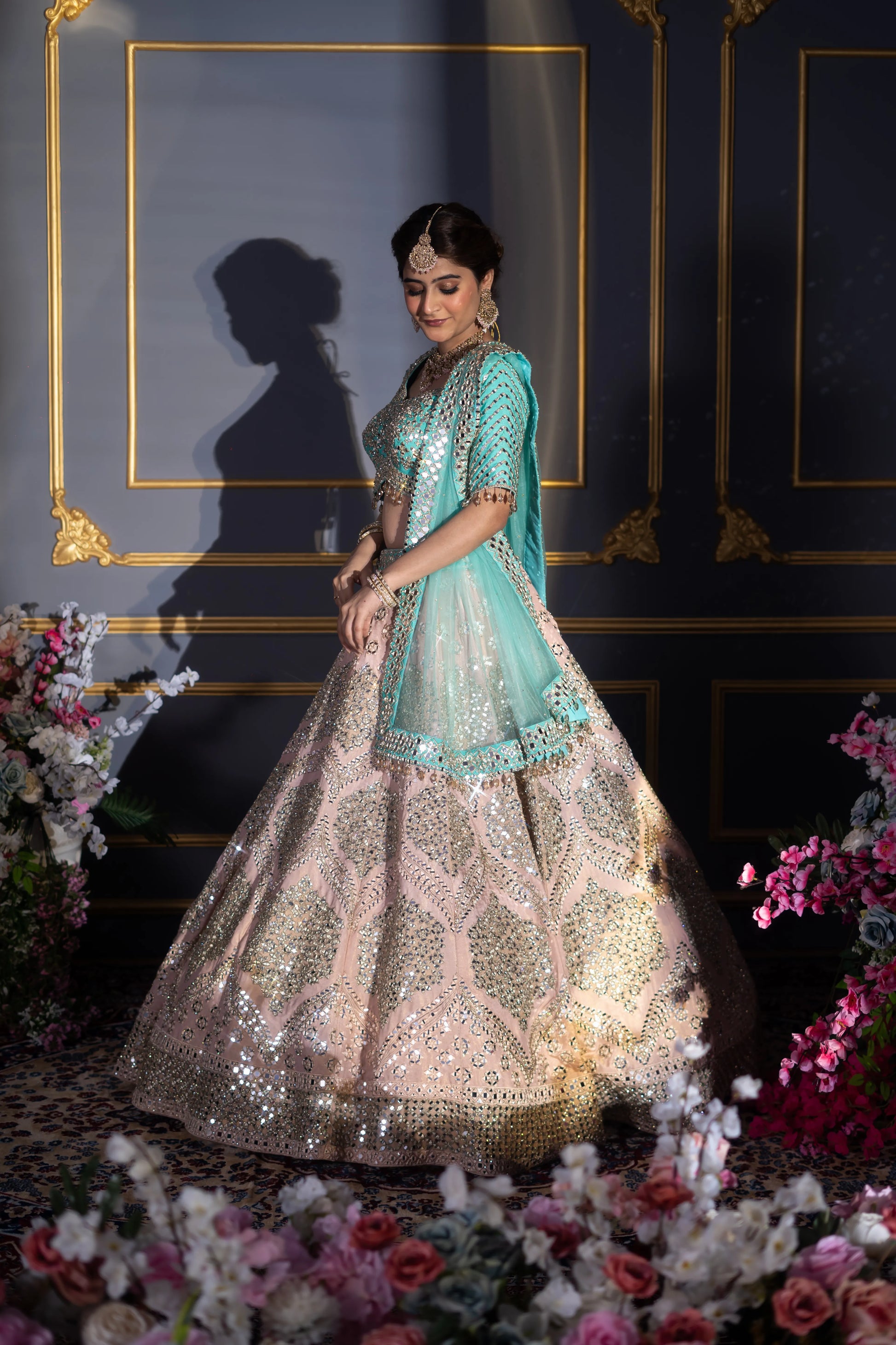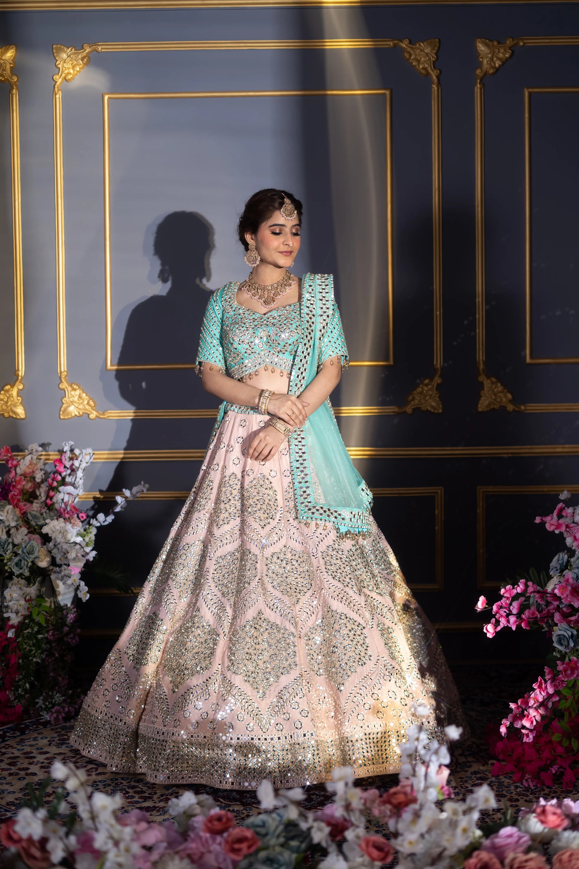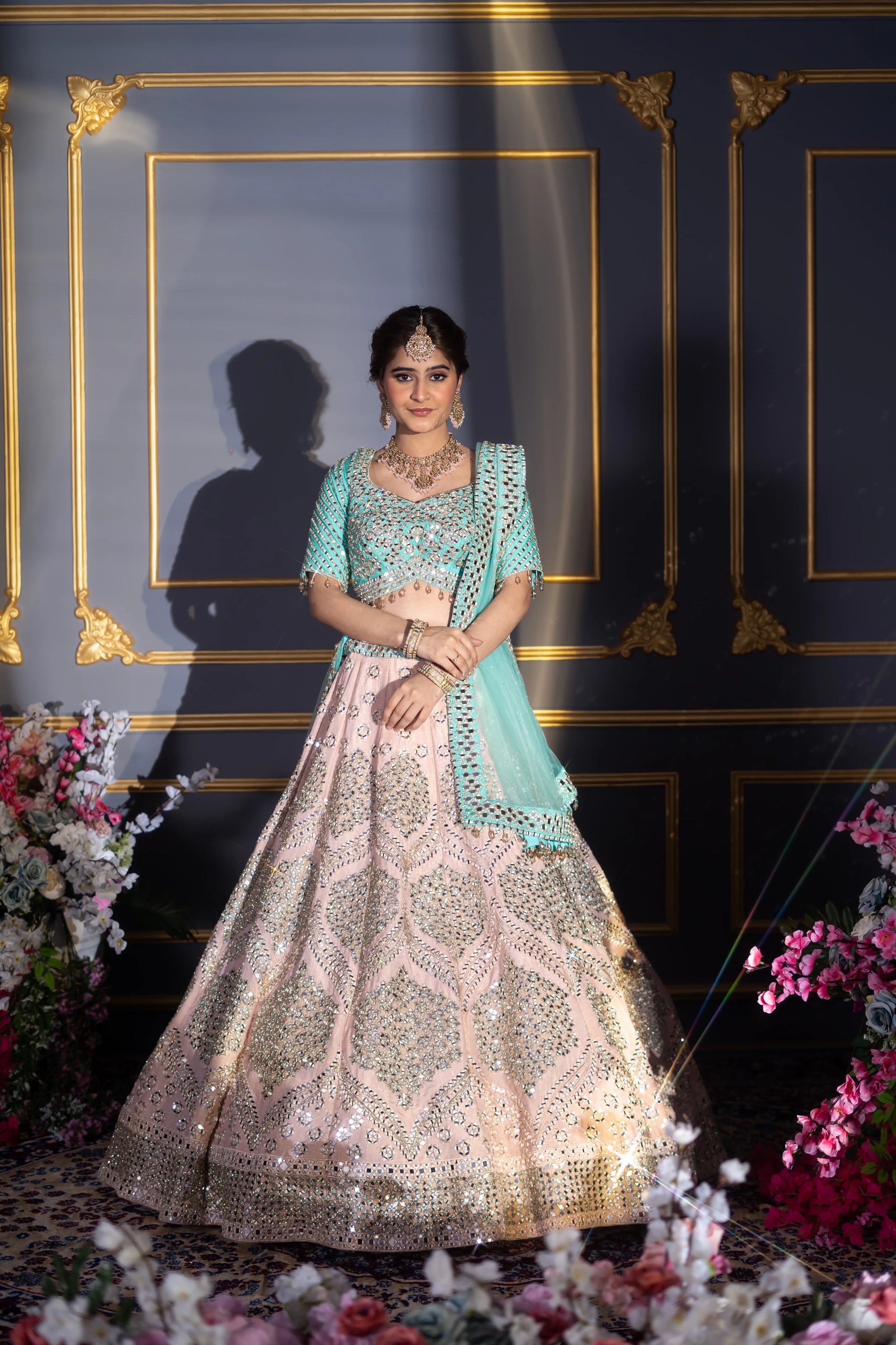 Blush Pink & Turquoise Contrast Mirror Work Bridal Lehenga