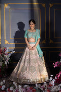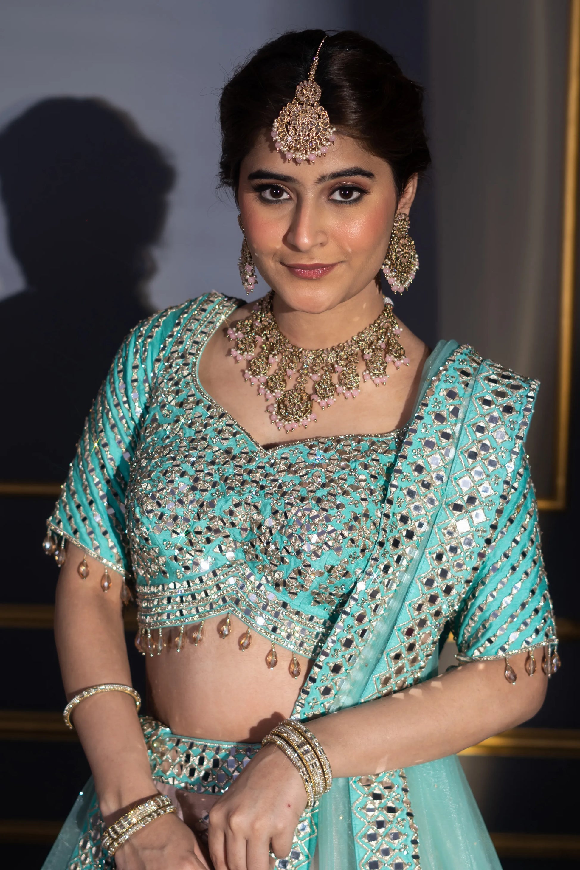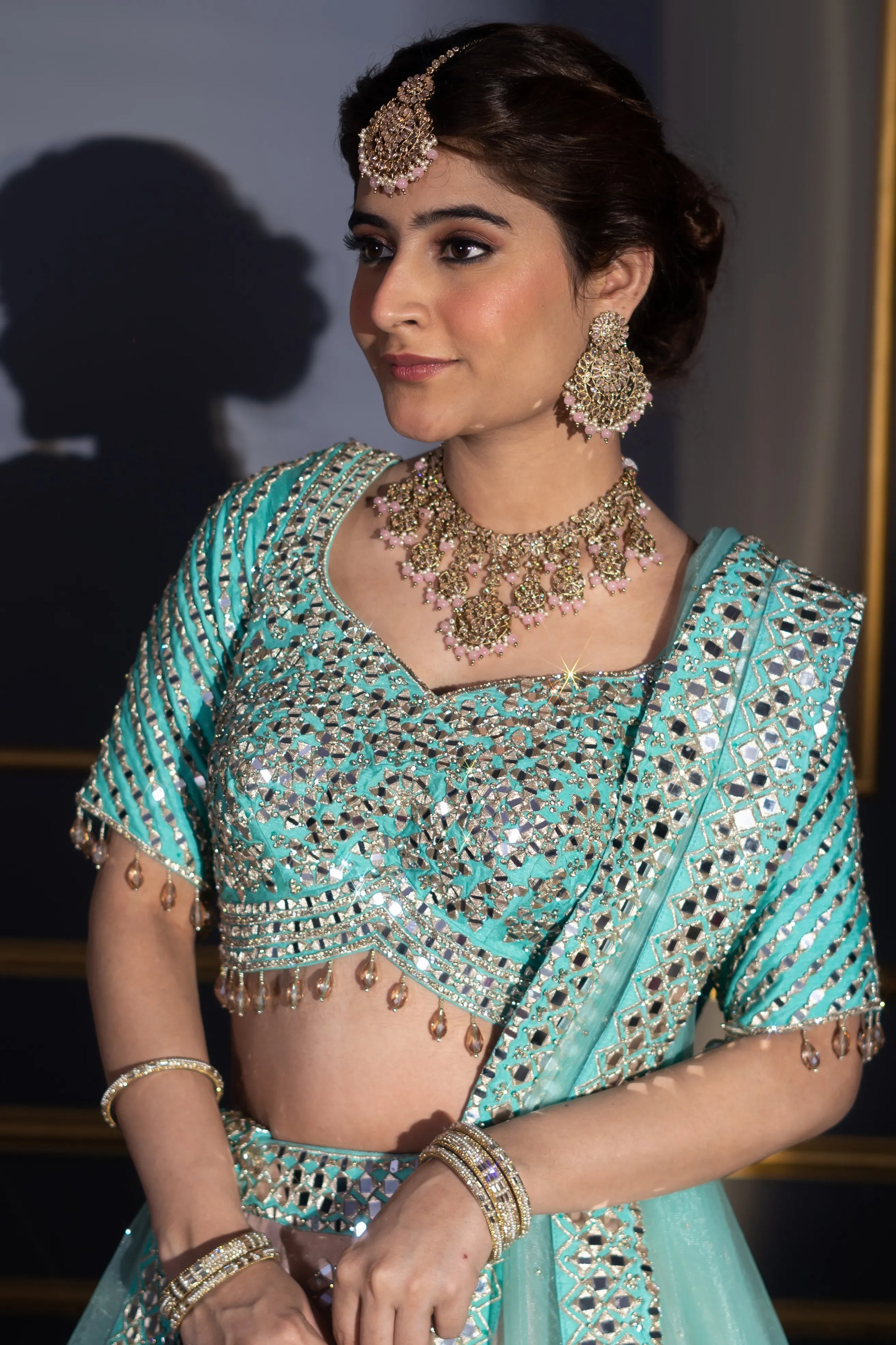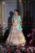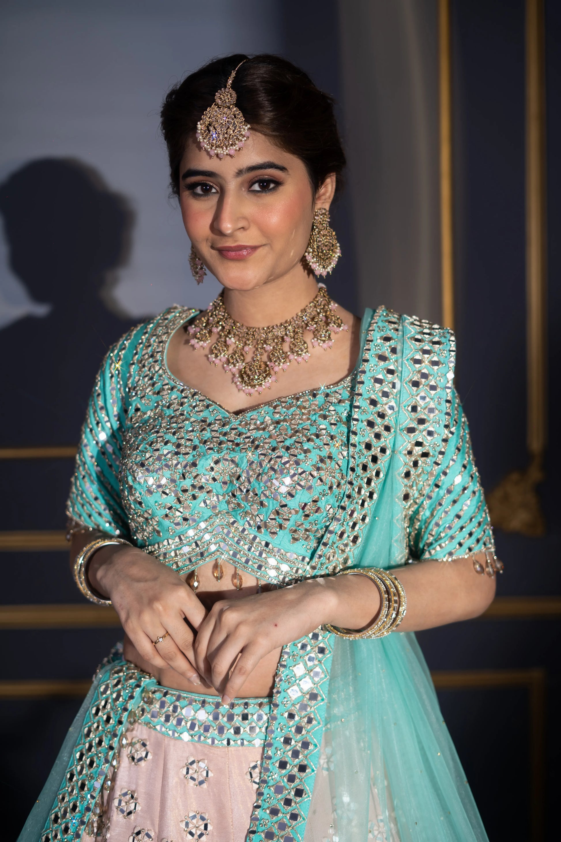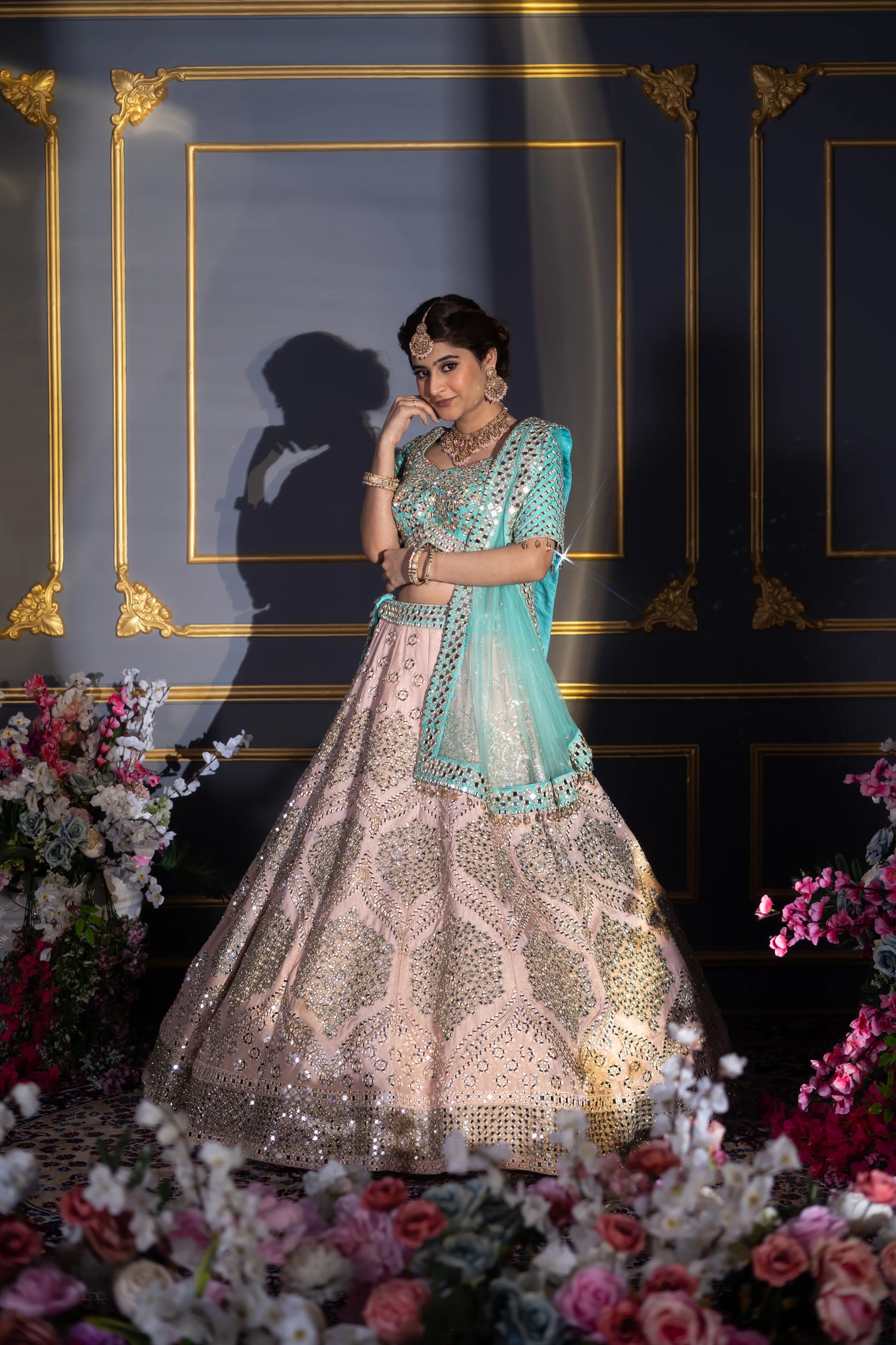 Blush Pink & Turquoise Contrast Mirror Work Bridal Lehenga