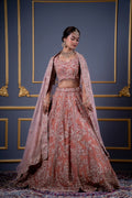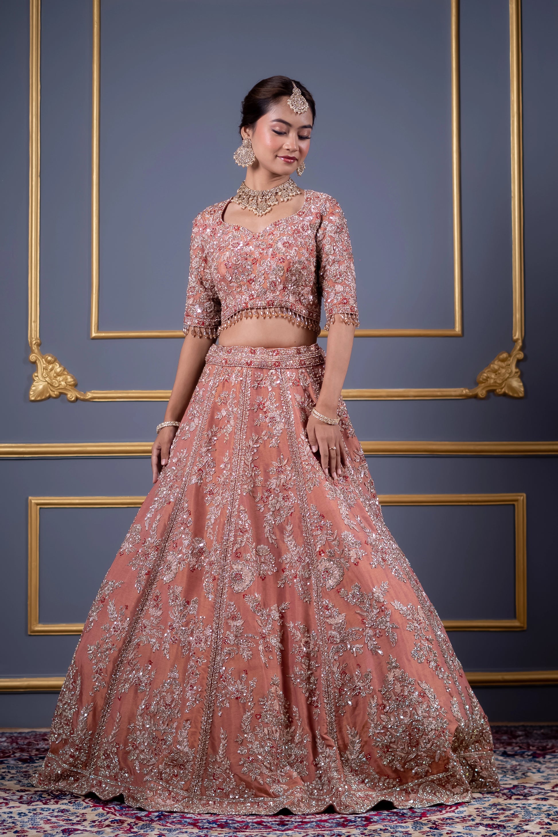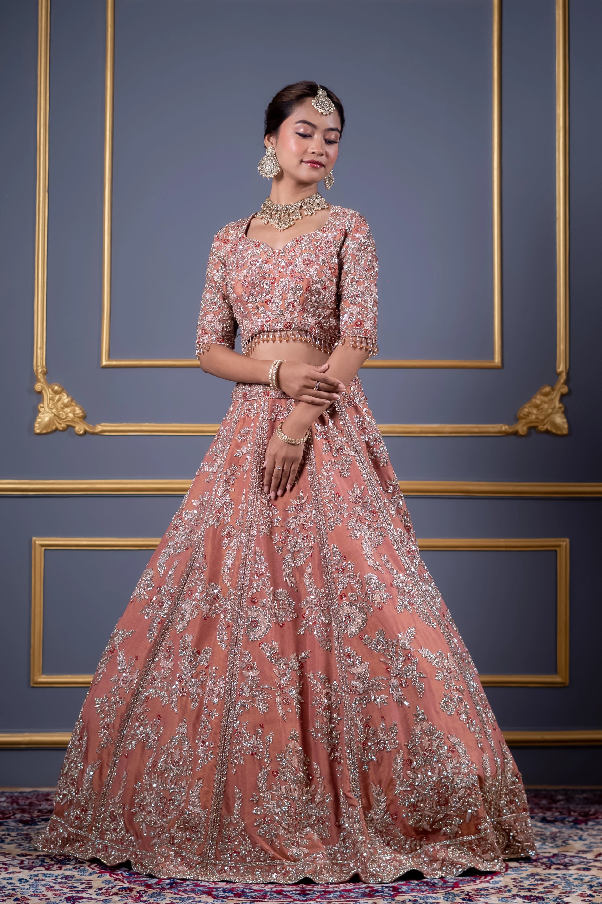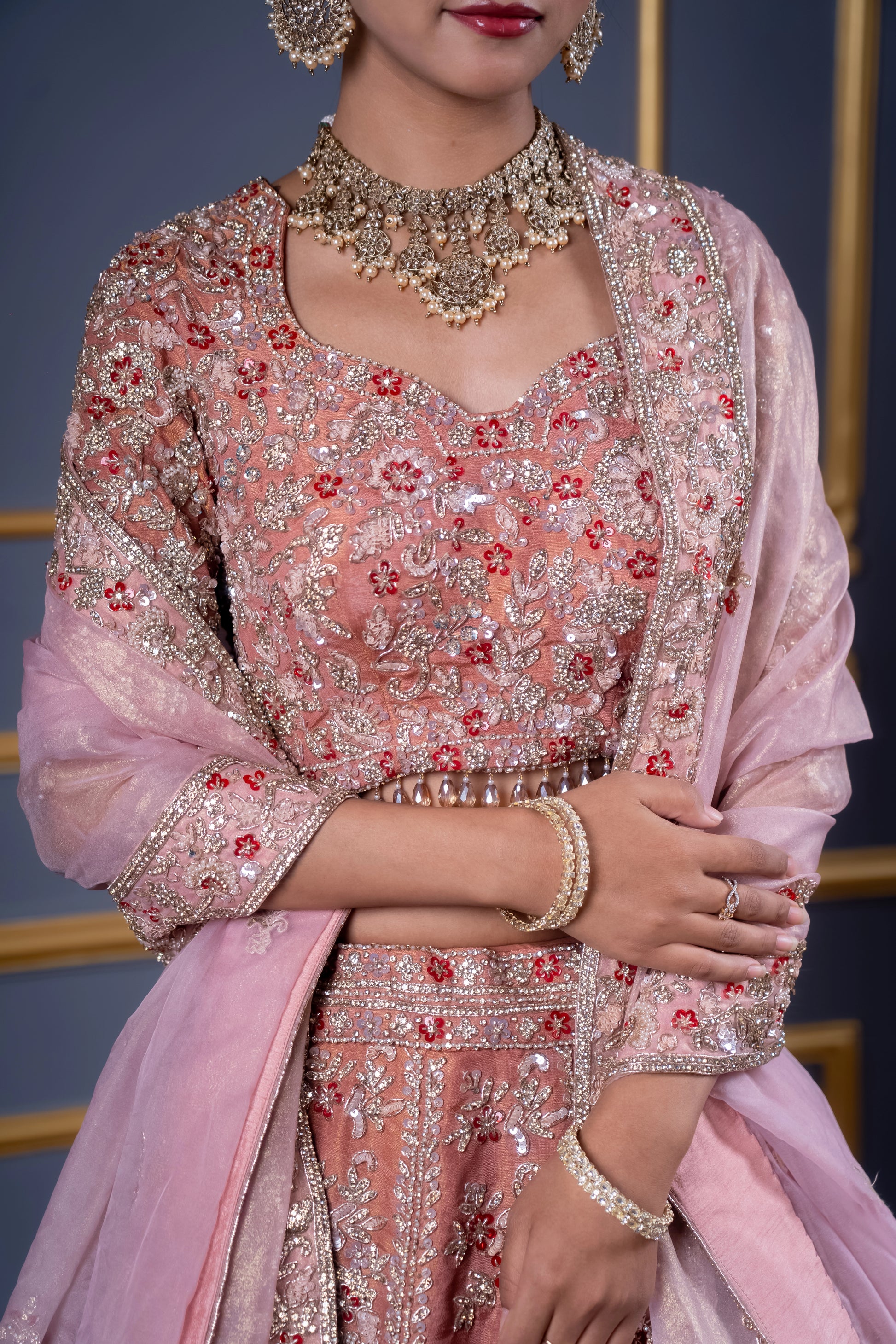 Ethereal blush rose lehenga with all-over silver zari embroidery, featuring intricate floral motifs and pearl beading. Perfect for the modern romantic bride seeking soft elegance.