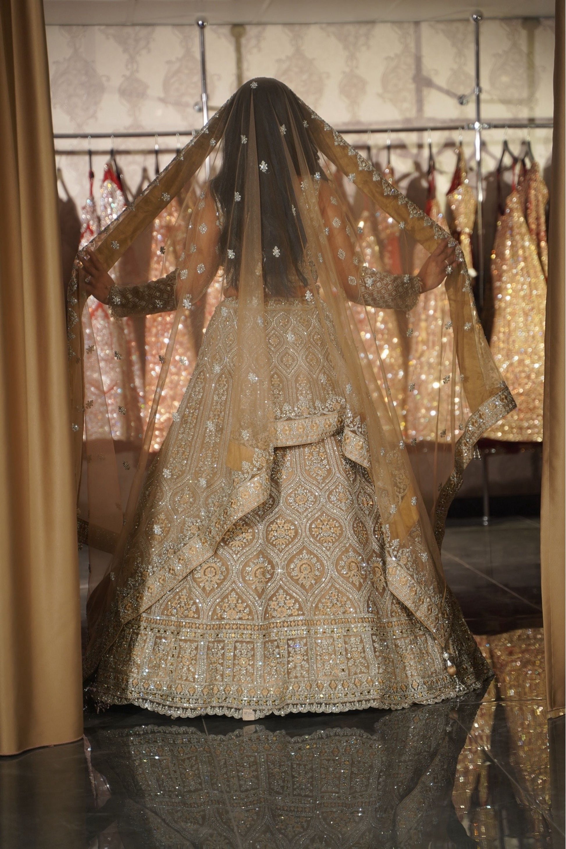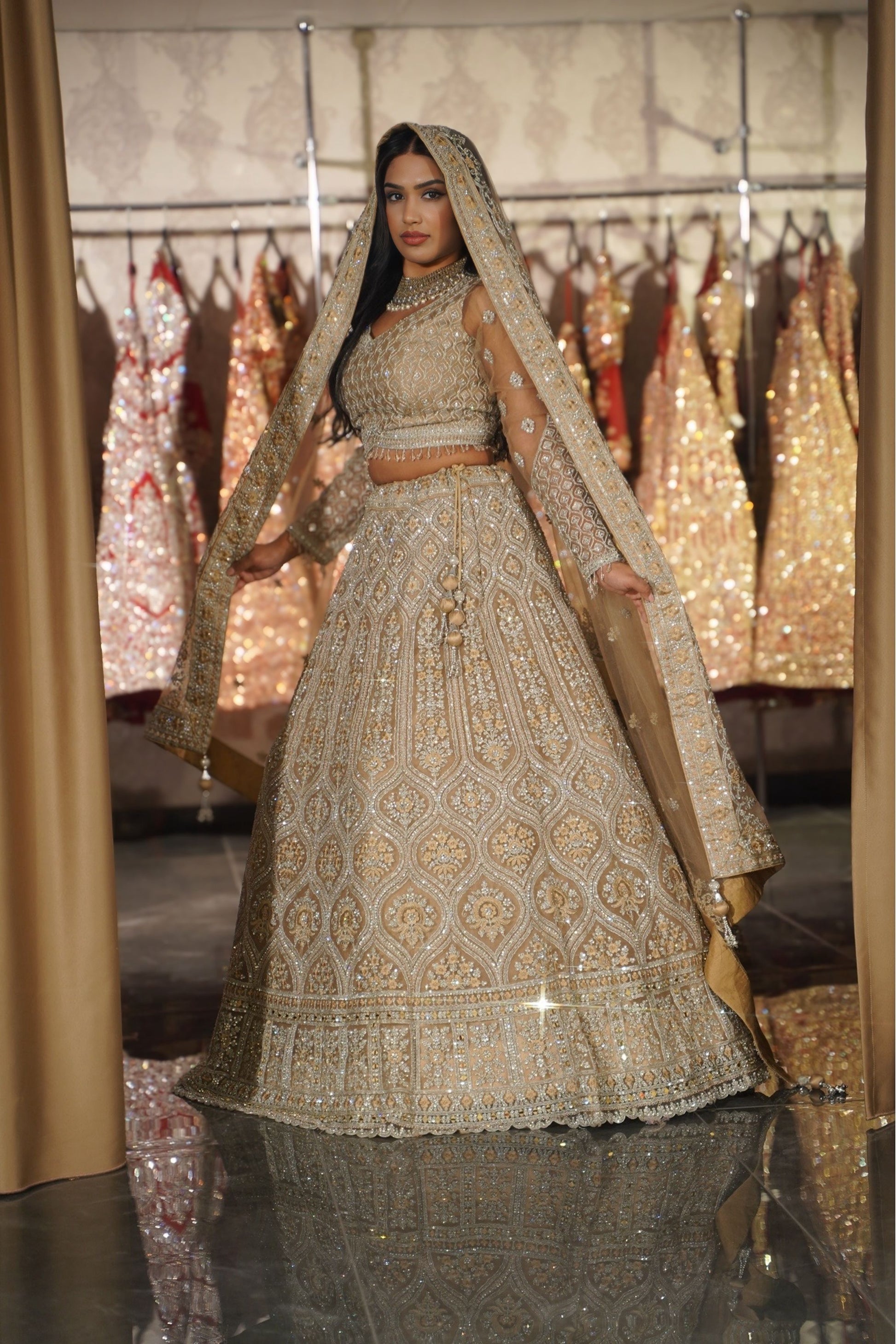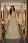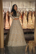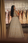 Unveil a vision of ethereal beauty with this exquisite Champagne Gold Bridal Lehenga Set. Designed for the bride who appreciates sophistication over saturation, this ensemble features a soft, neutral palette brought to life with dazzling silver and crystal embroidery. The delicate play of light on the champagne fabric creates a dreamy, romantic aura, making it a flawless choice for a reception, engagement, or a modern day-wedding.