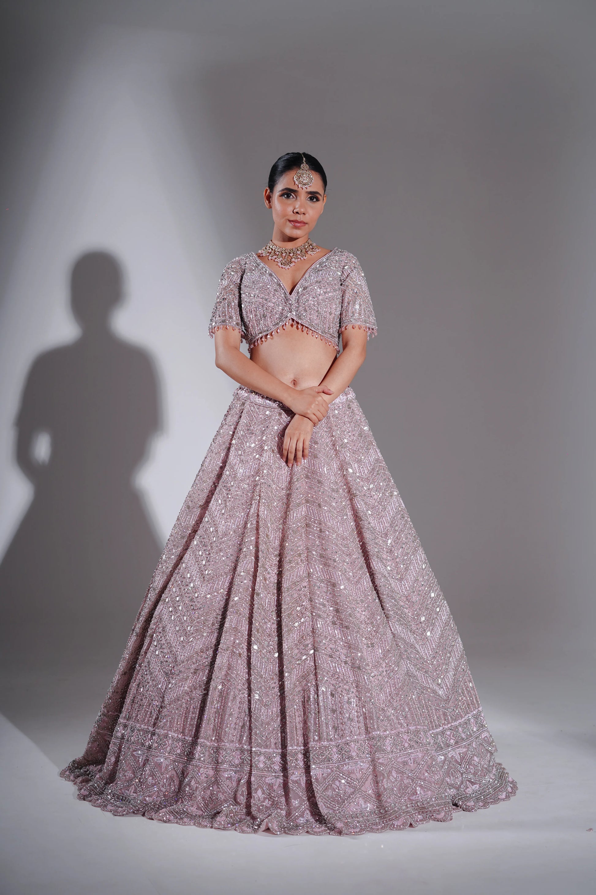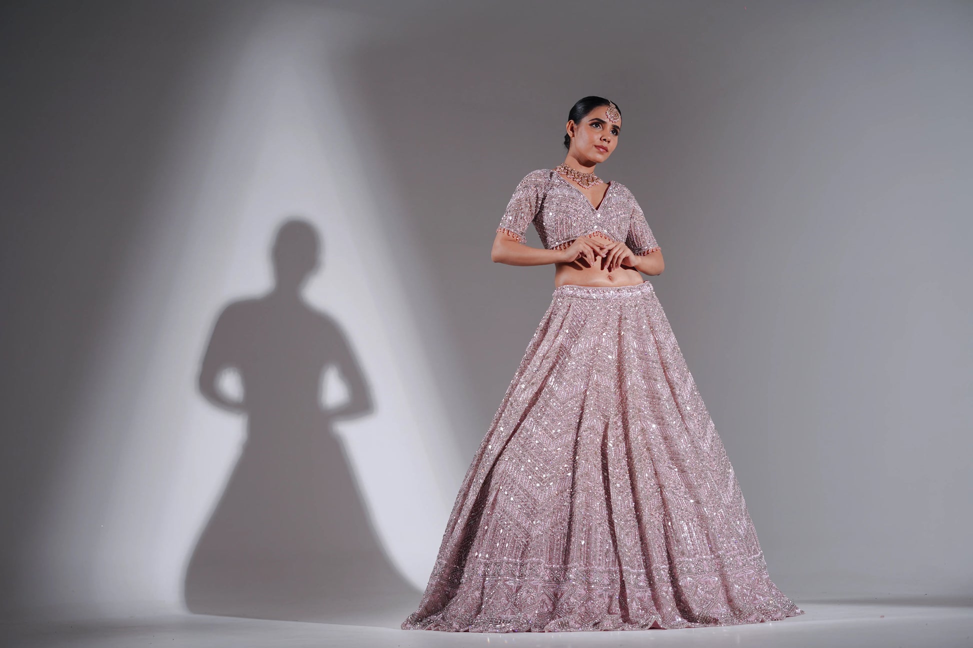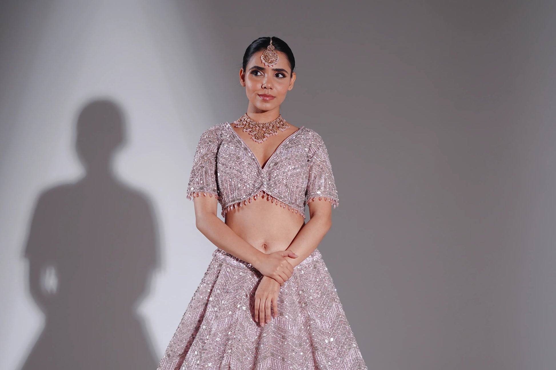 Float into your fairy tale with the Rose Quartz Crystal Cascade Lehenga. This ethereal ensemble is a masterpiece of modern bridal glamour, featuring a delicate rose-pink palette completely covered in shimmering crystal and sequin work. Perfect for the contemporary bride seeking soft elegance with maximum sparkle, or for reception, engagement, and pre-wedding events where you want to shine like a diamond.
