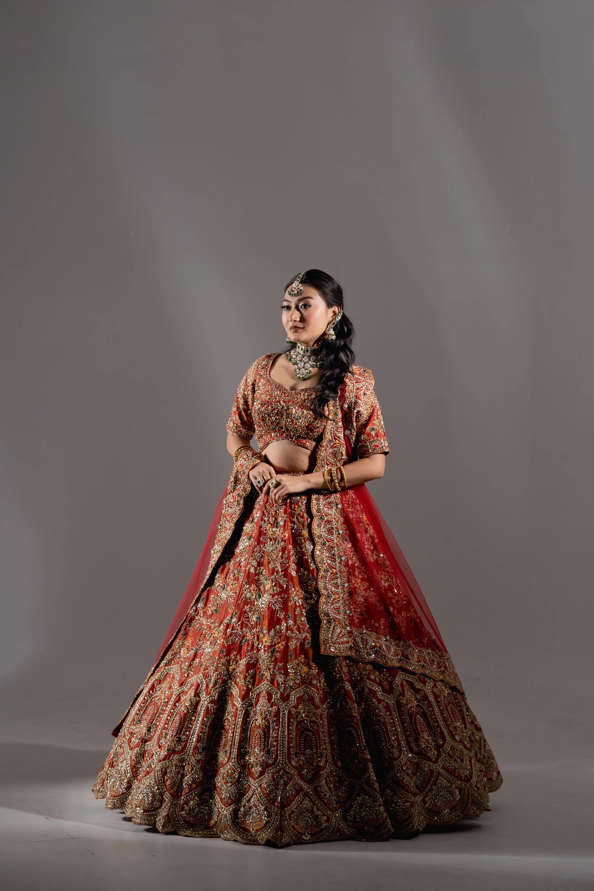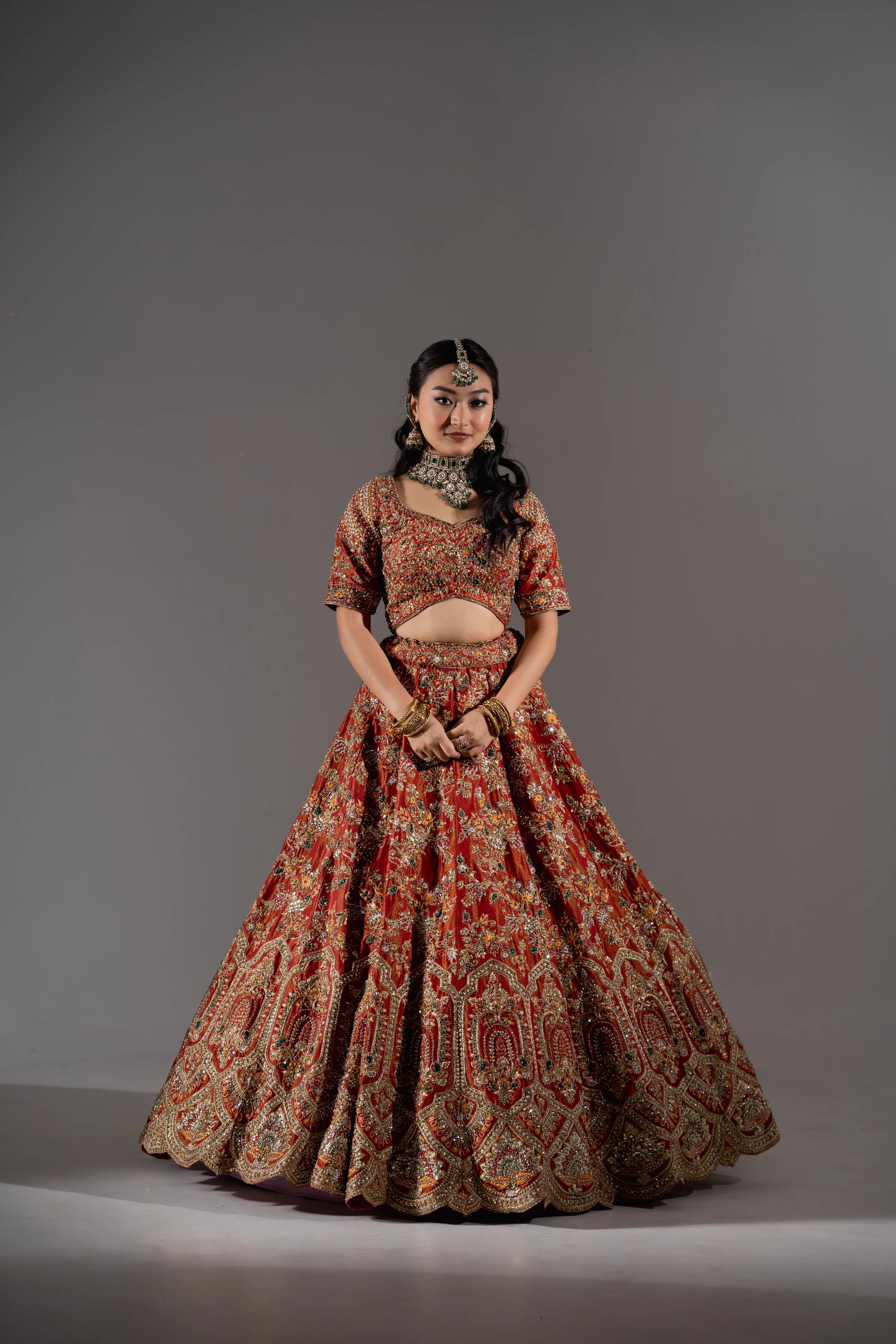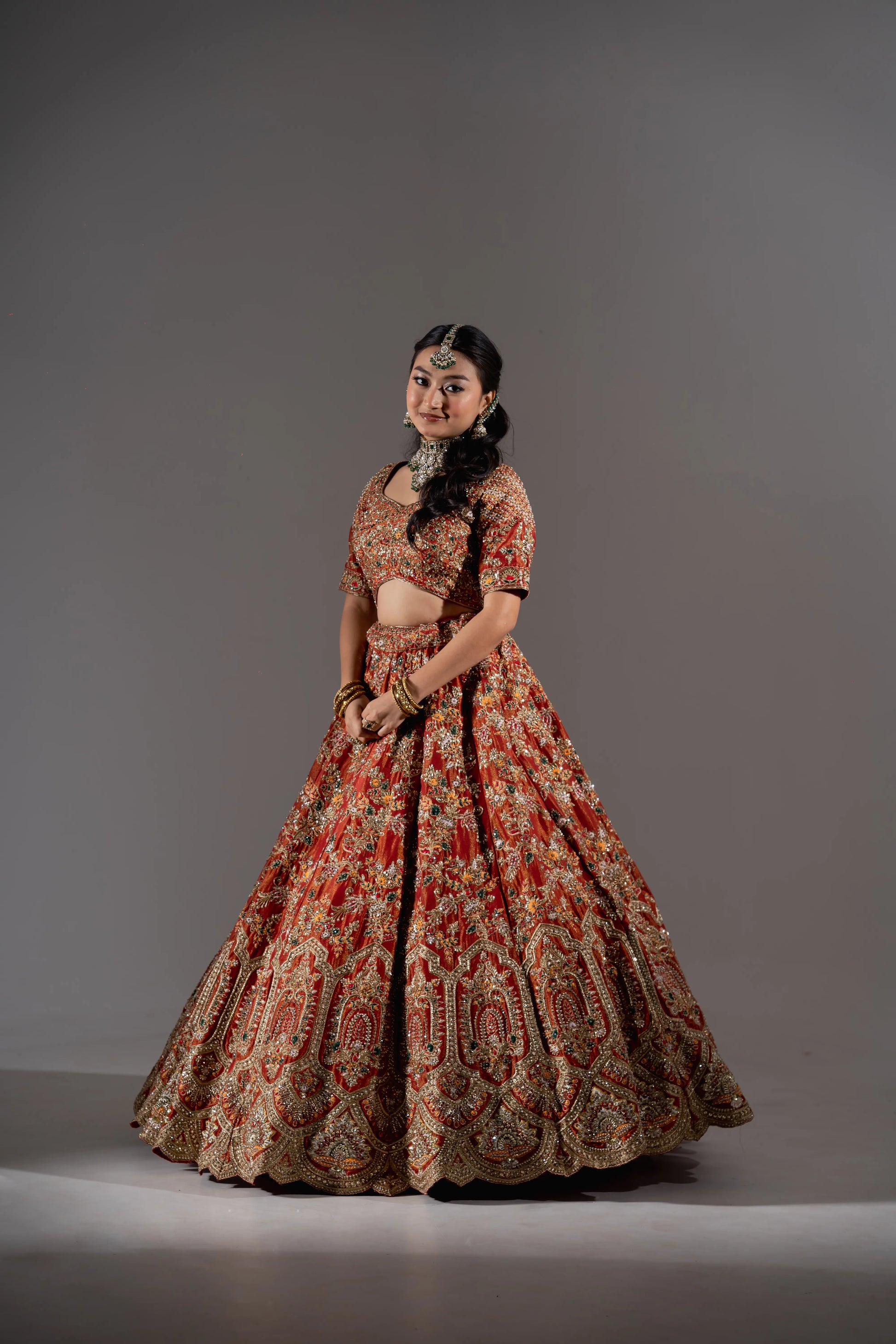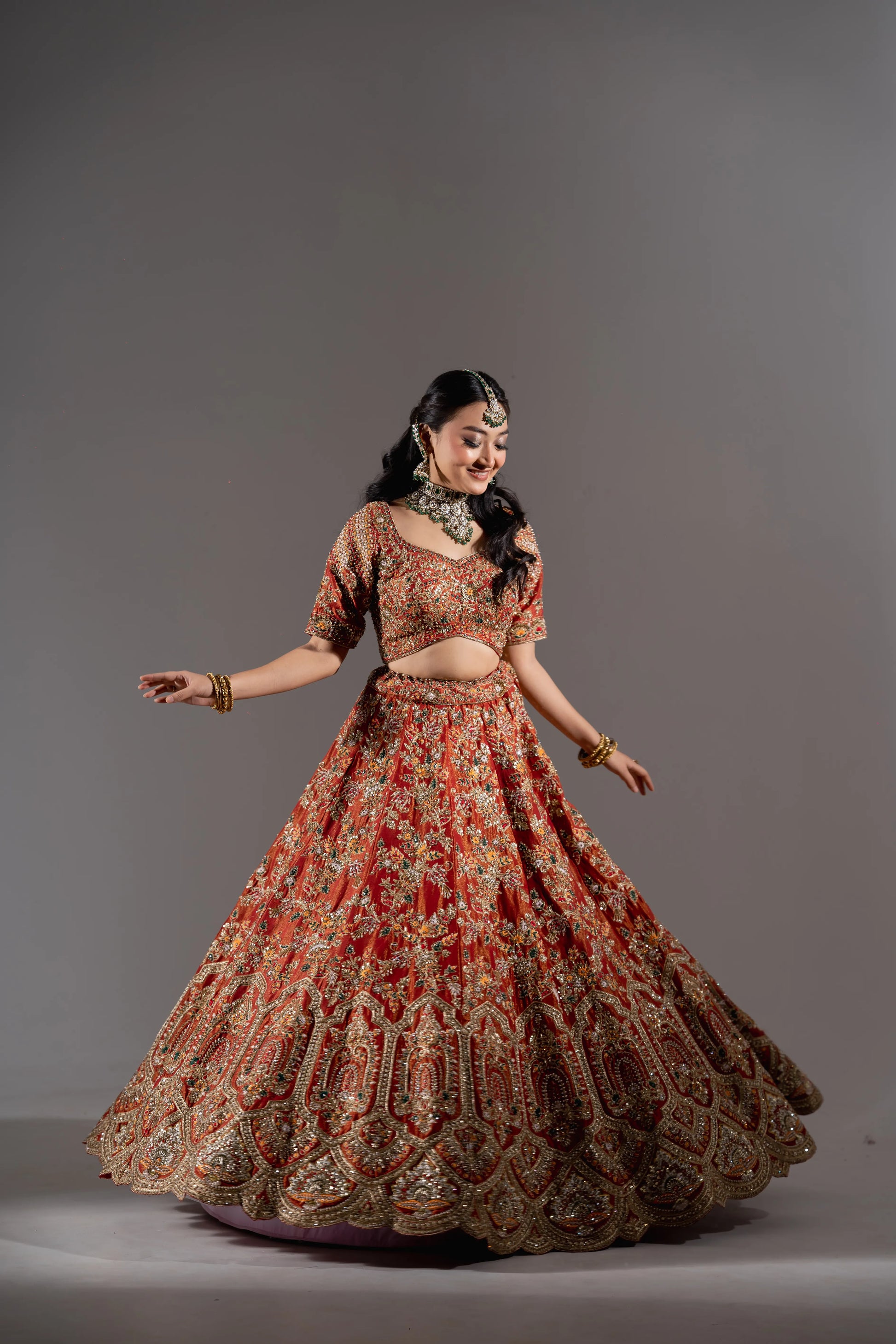 Rust Orange Zardosi Embroidered Bridal Lehenga