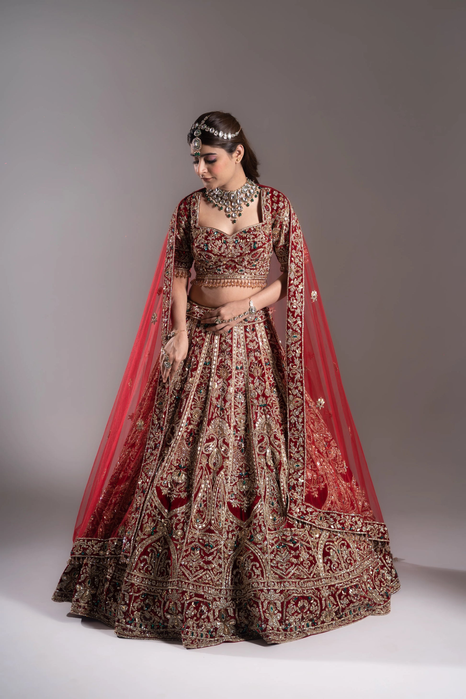 Why Choose This Piece? This is THE ultimate traditional Indian bridal lehenga. The ruby-red color is the most auspicious and sought-after bridal shade in Indian culture, symbolizing love, prosperity, and celebration. The emerald accents add a distinctive royal touch, setting it apart from standard red lehengas. The level of embroidery density and craftsmanship is exceptional - truly a couture heirloom piece that will be treasured for generations. 👰