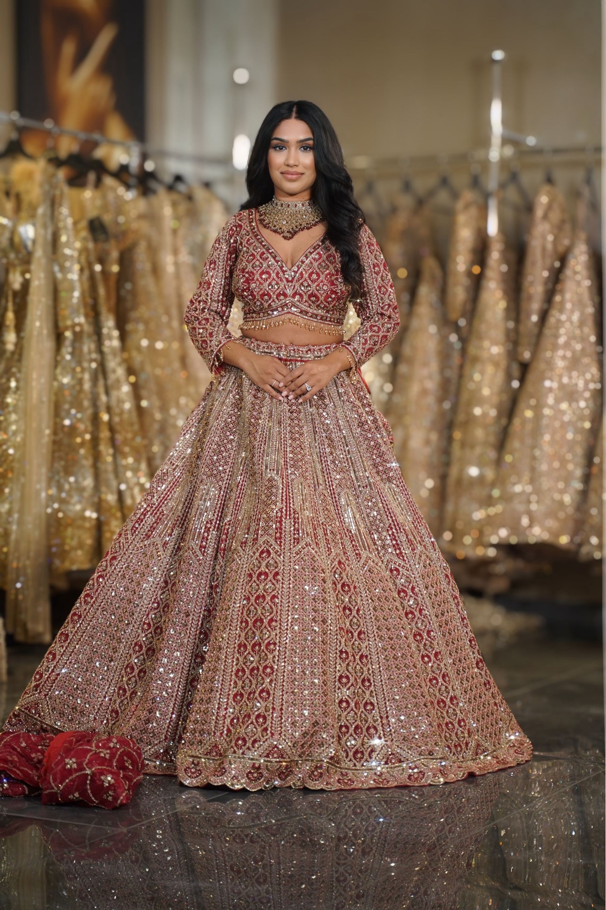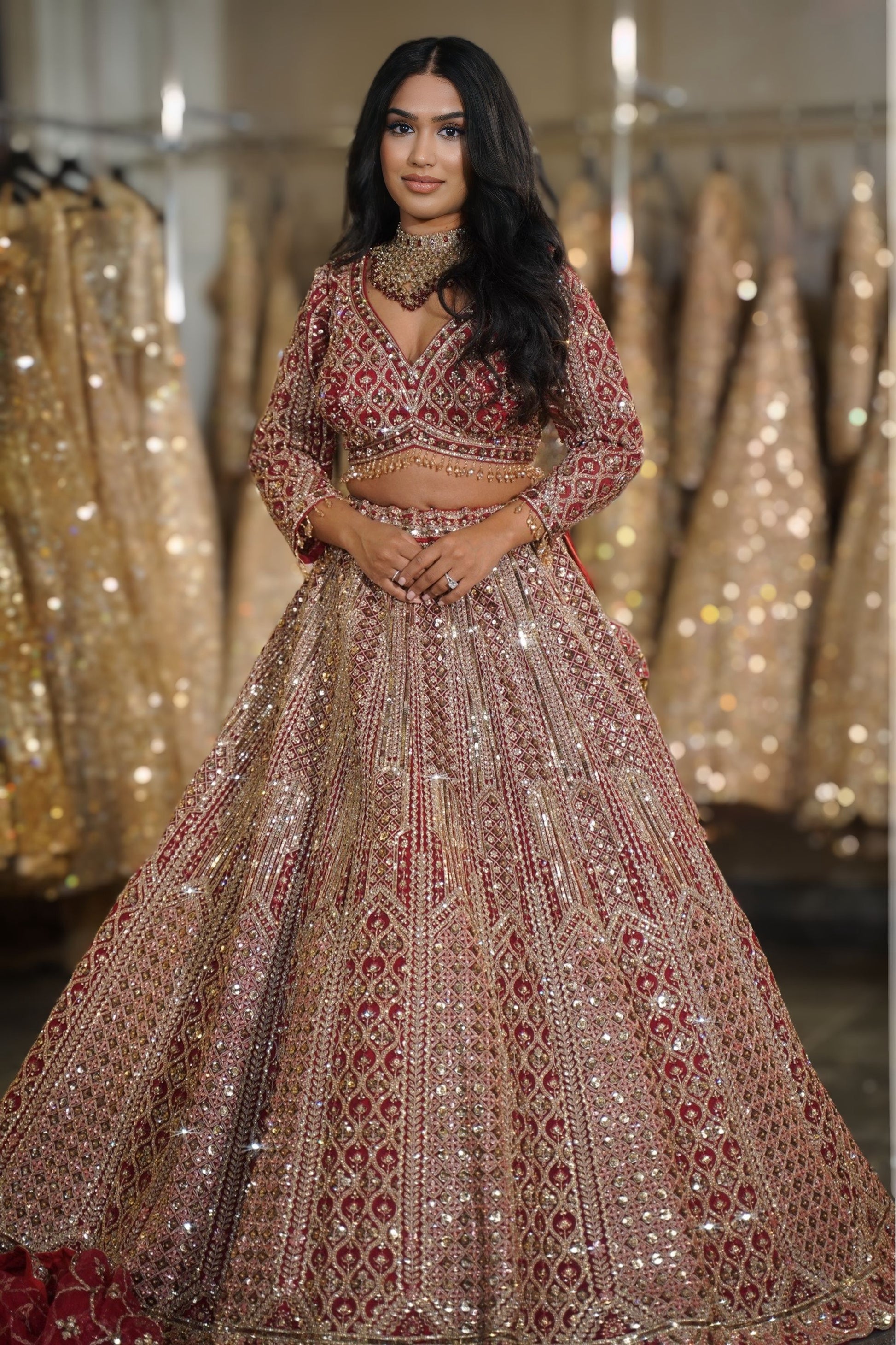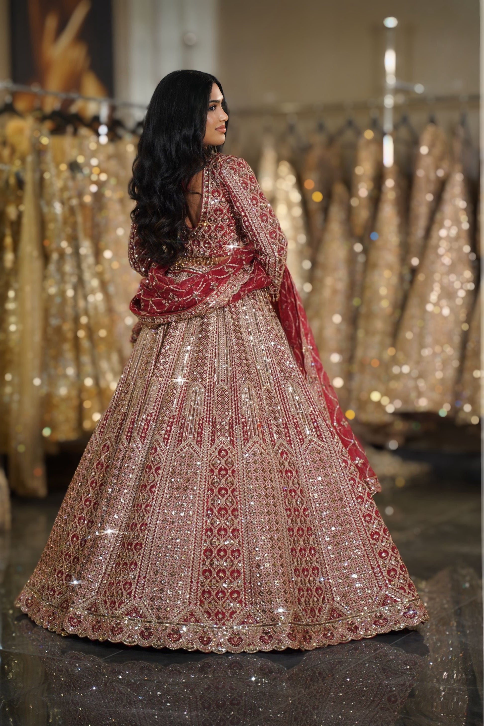 Deep Red Geometric Diamond & Crystal Embroidered Bridal Lehenga Set