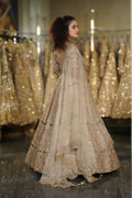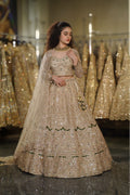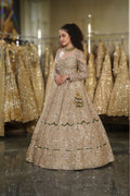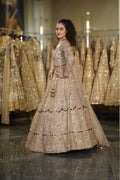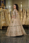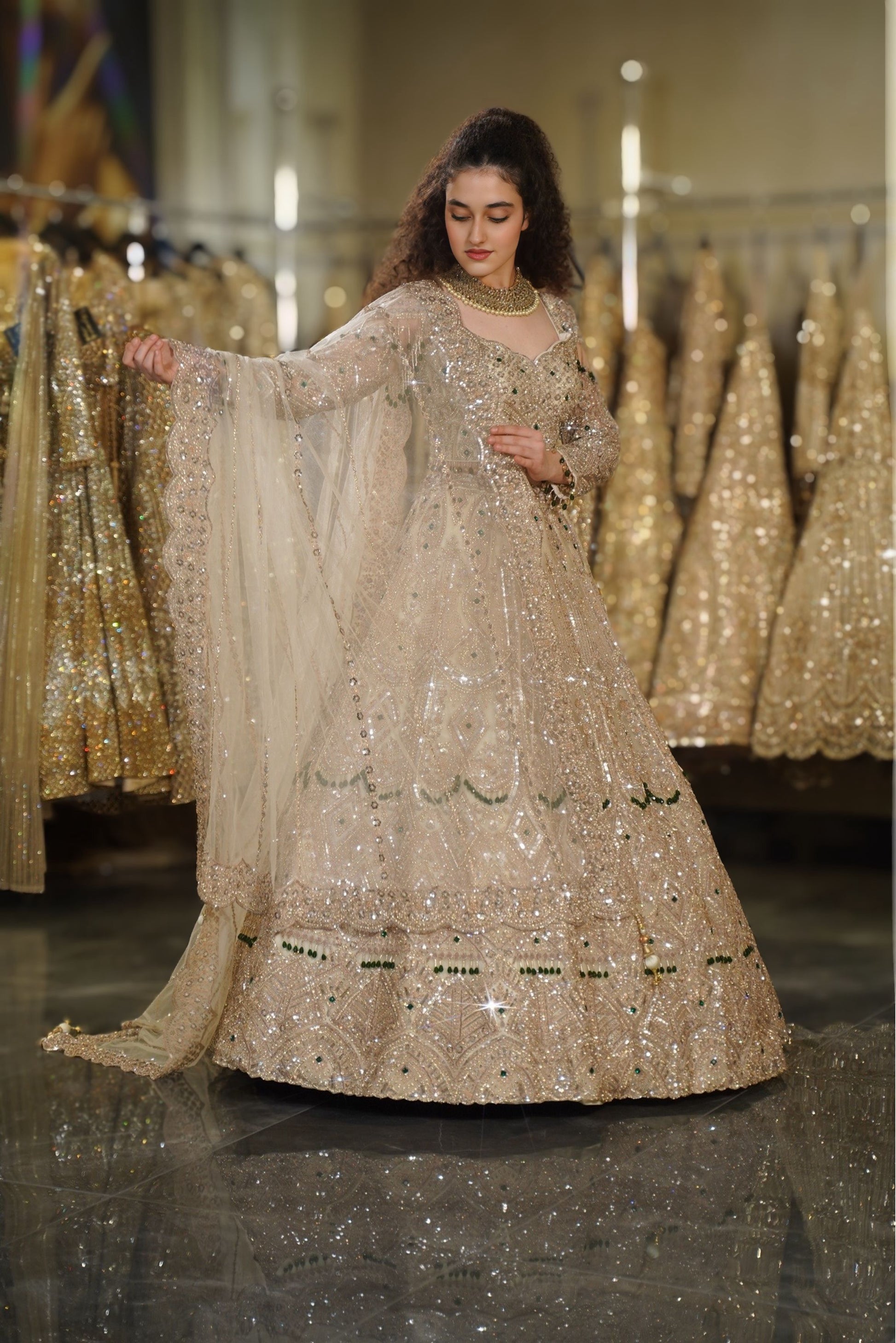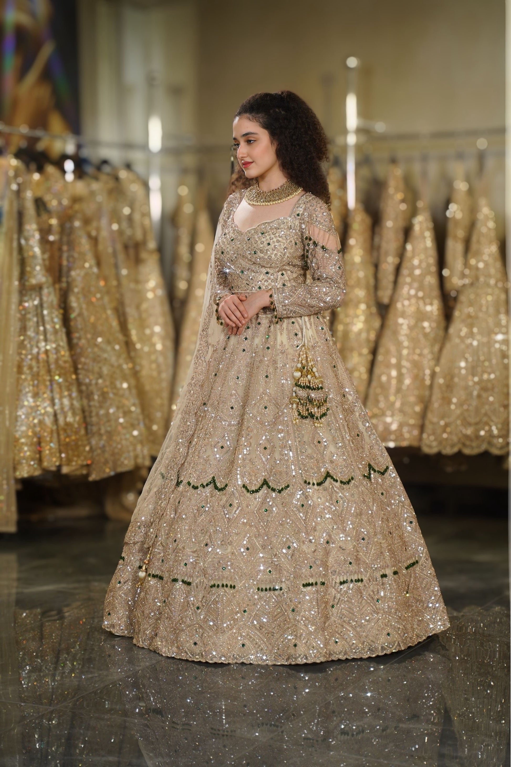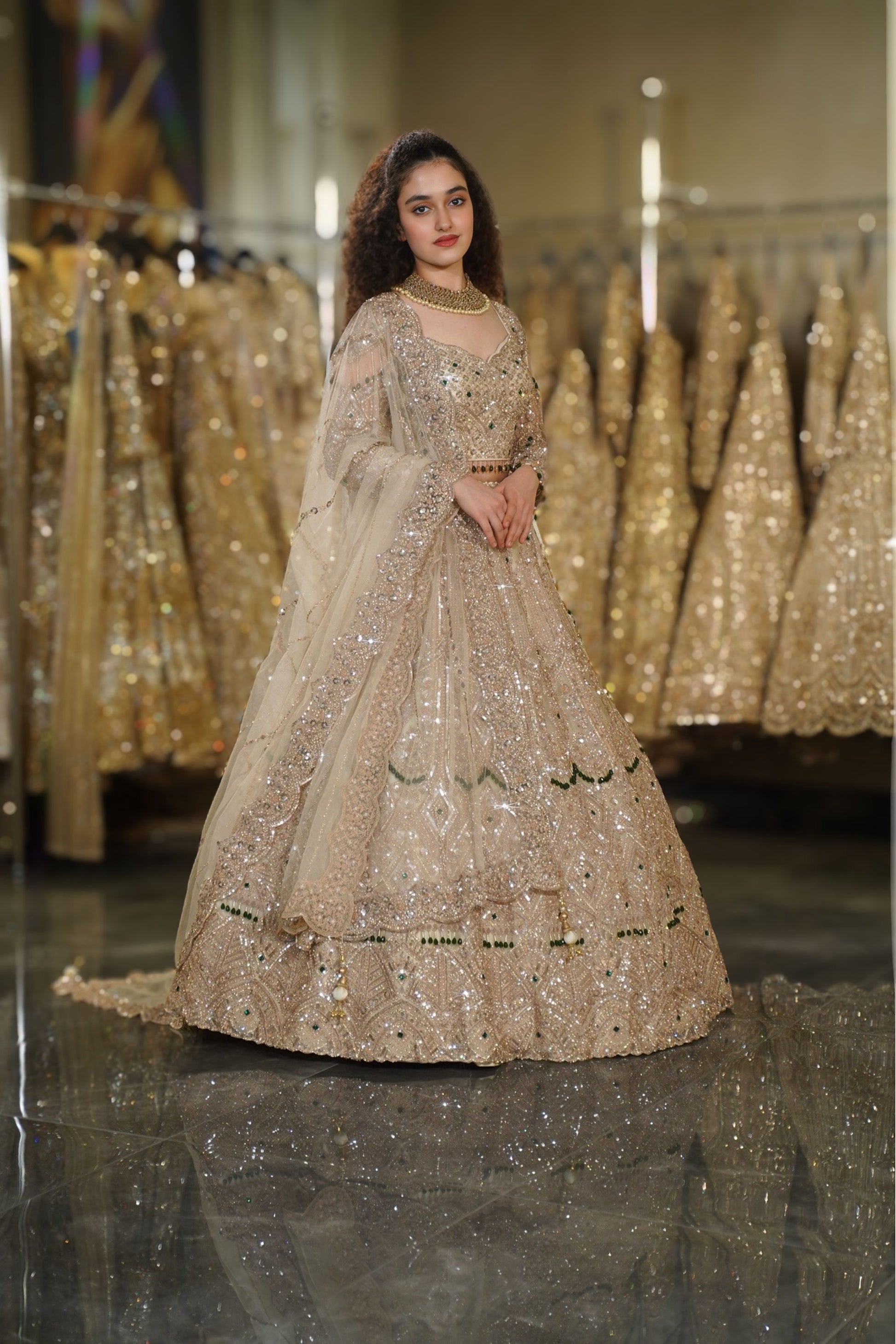 Radiate opulent charm with this exquisite Champagne Beige Lehenga Set. This stunning ensemble elevates the classic nude-gold palette by introducing delicate emerald green crystal accents that outline the scalloped patterns, creating a mesmerizing contrast. Heavily encrusted with sequins and crystals, this outfit is designed for the bride who appreciates intricate detailing and wants a look that is both glamorous and uniquely sophisticated for her big day.