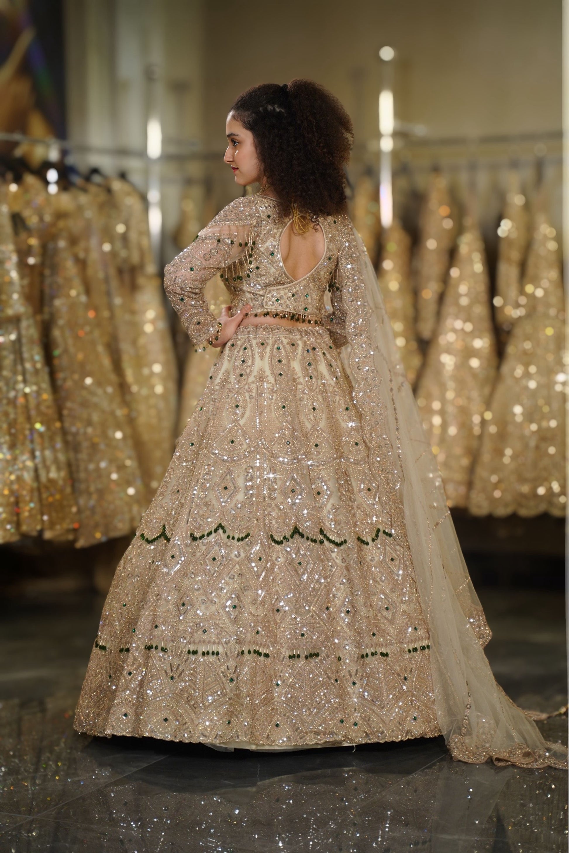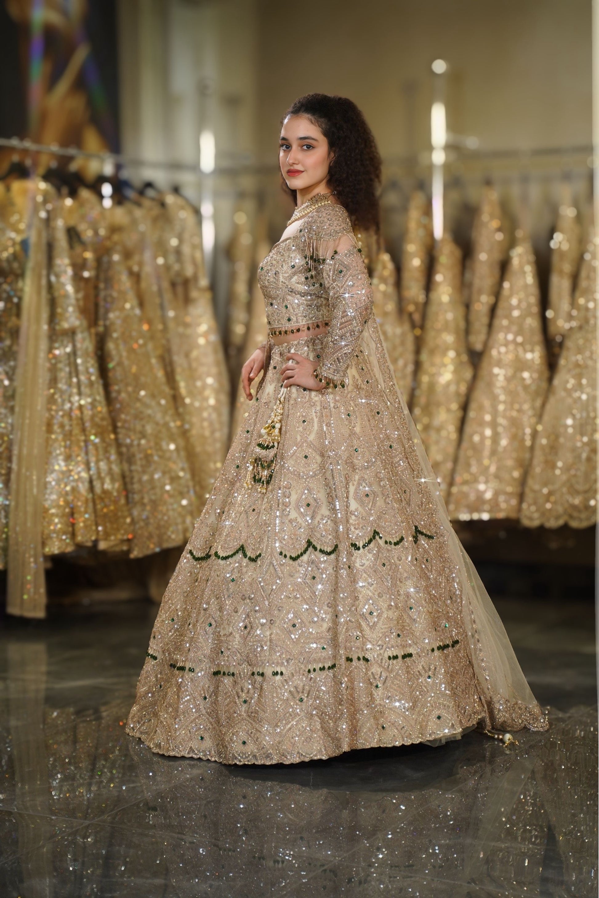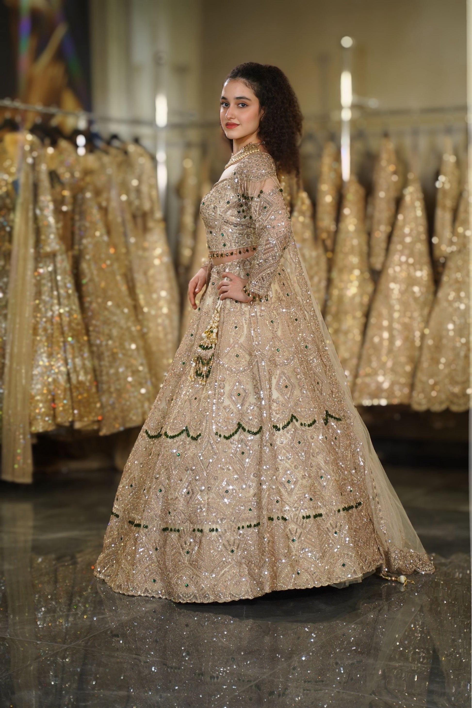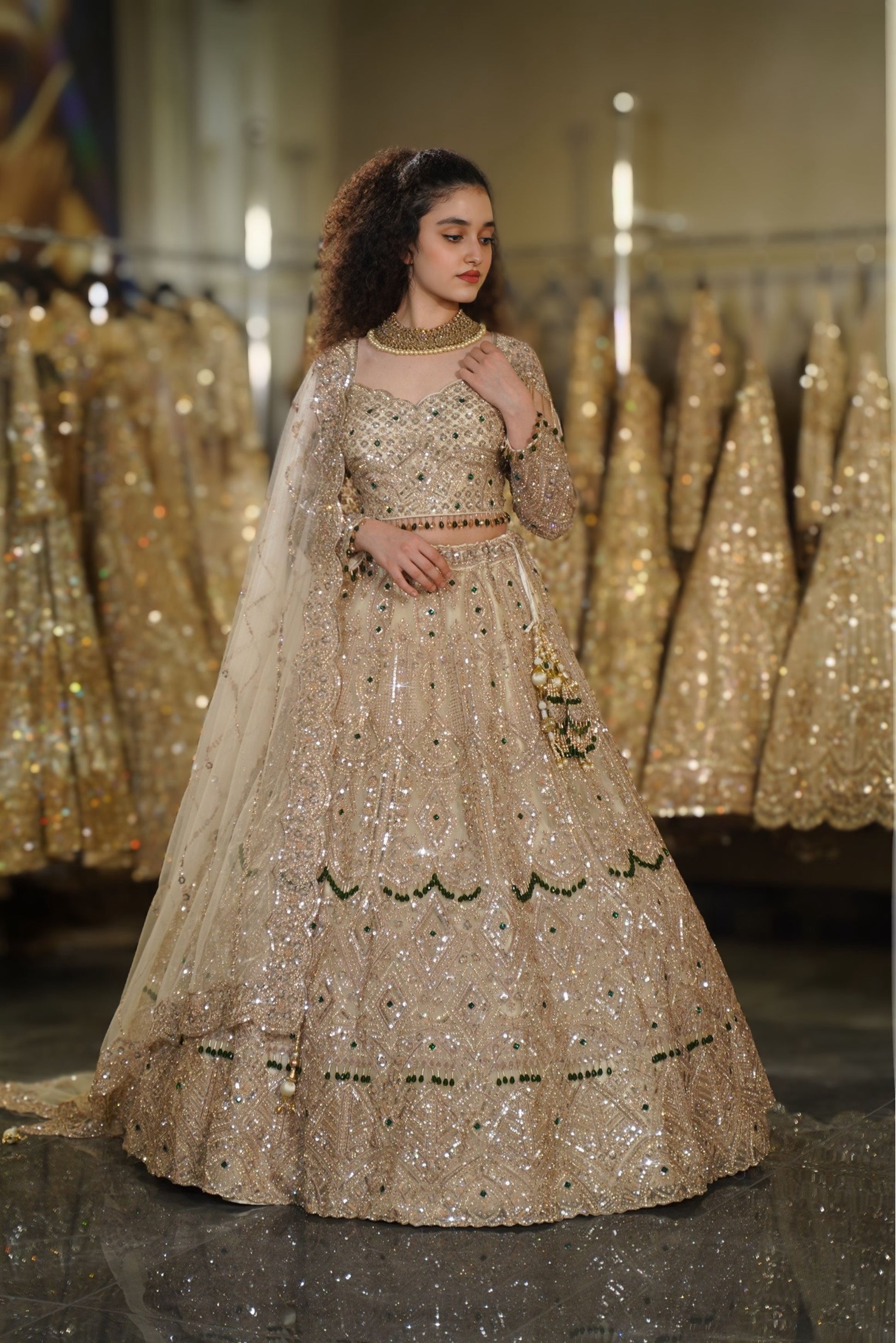Champagne Beige Sequin & Crystal Embroidered Lehenga Set with Emerald Accents