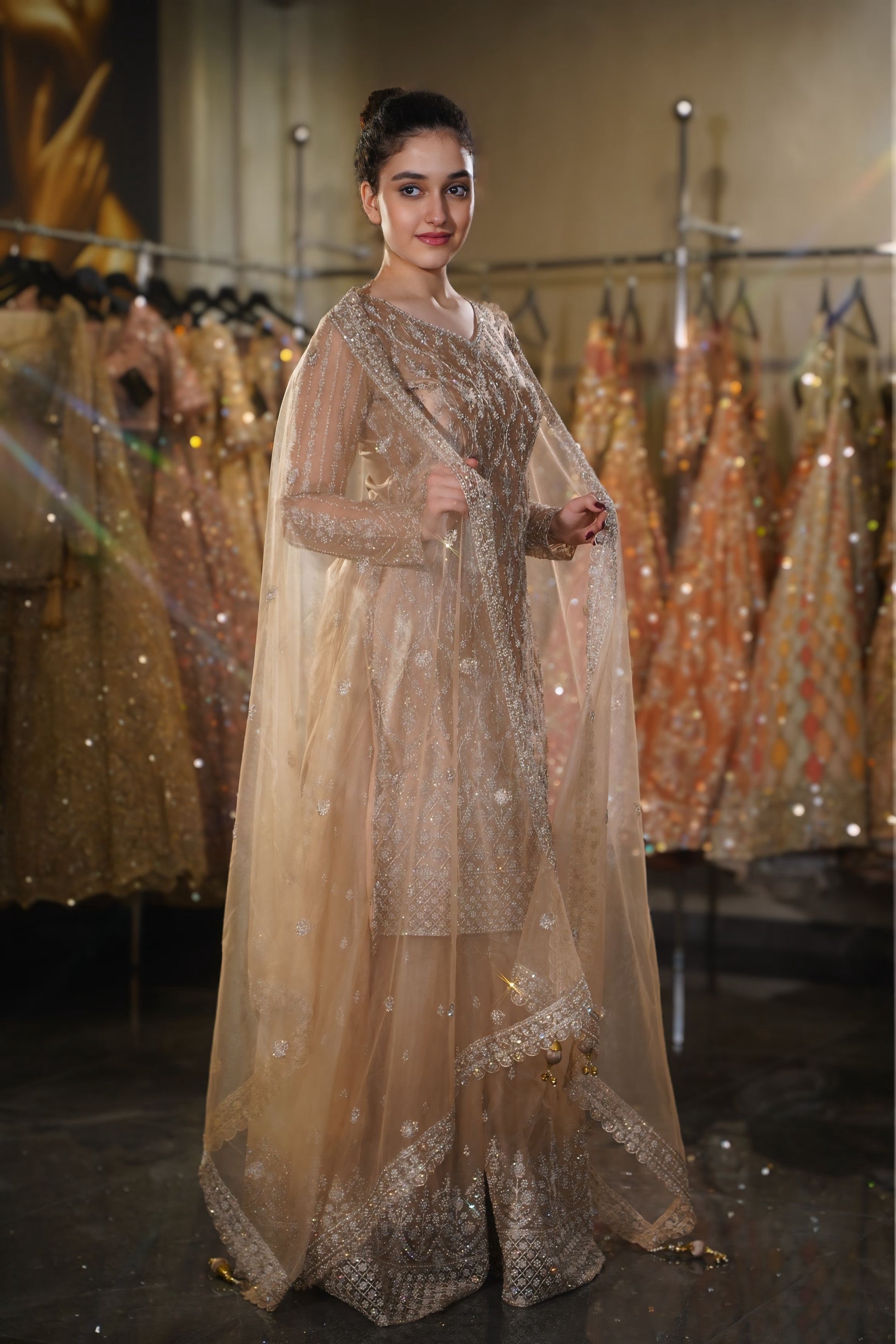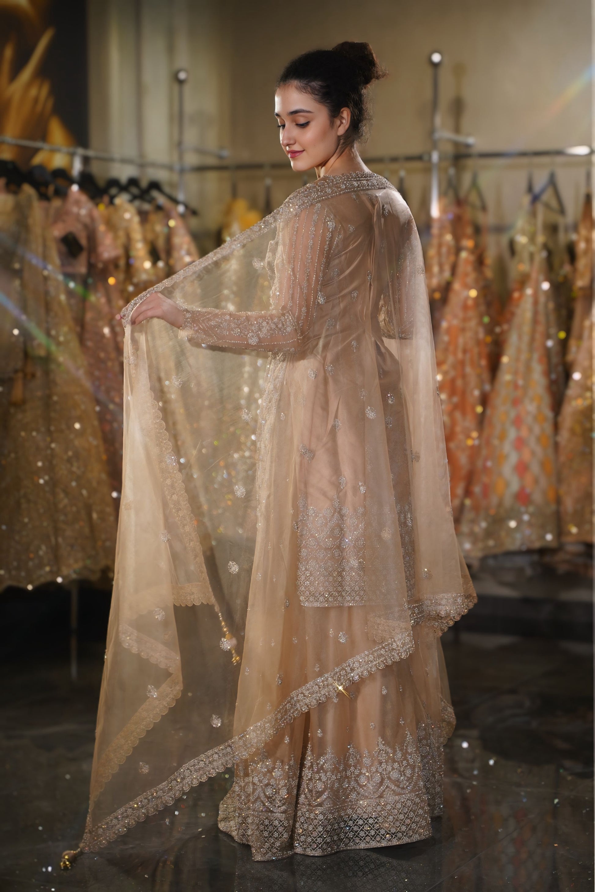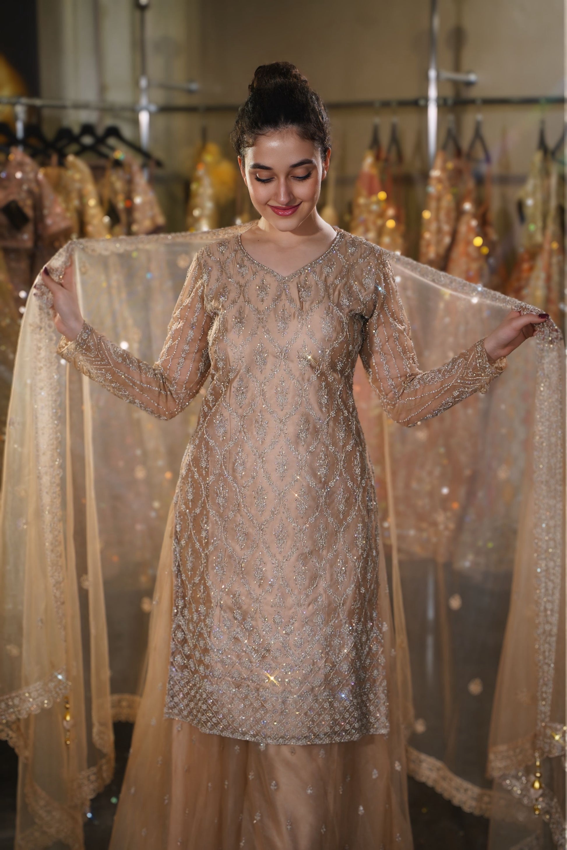 Champagne Beige Geometric Lattice Embroidered Long Kurta Sharara Set