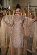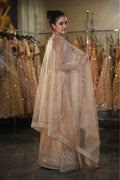 | Dupatta | Sheer champagne net dupatta with a matching embroidered border and scattered sequins |