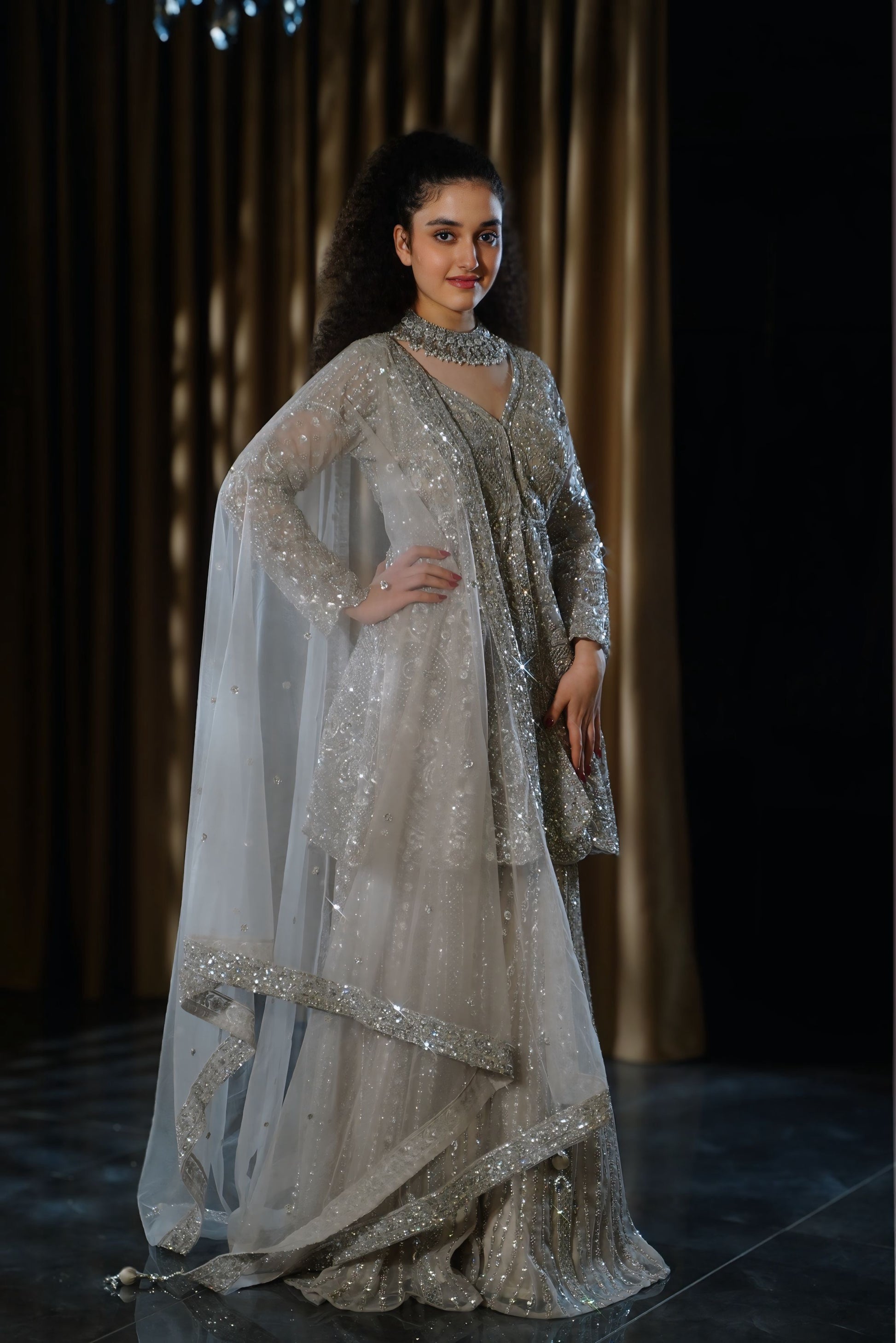 Radiate celestial beauty with this breathtaking Silver Grey Sharara. A vision of high-fashion luxury, this ensemble features a trendy short frock-style kurta paired with voluminous wide-legged pants. The cool grey base is completely enveloped in heavy silver sequin and crystal artistry, creating a shimmering "liquid metal" effect. Perfect for a grand Reception, Sangeet, or a sophisticated Winter Wedding, this outfit ensures you shine with a statue-esque glow.