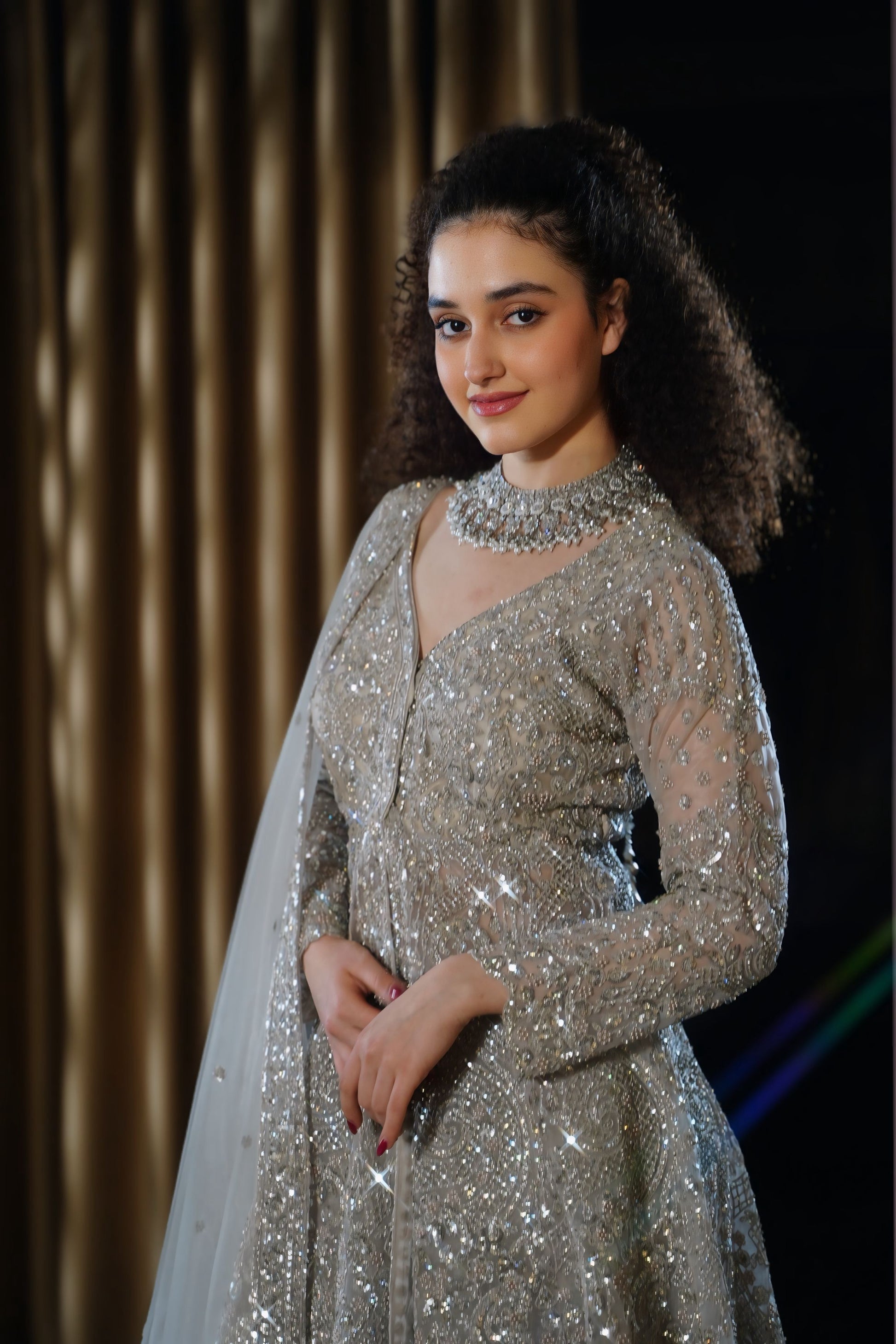 Diamond-Dust Sparkle: The entire ensemble is densely packed with light-reflecting crystals and sequins, giving the fabric a rich, textured appearance that sparkles under evening lights 💎