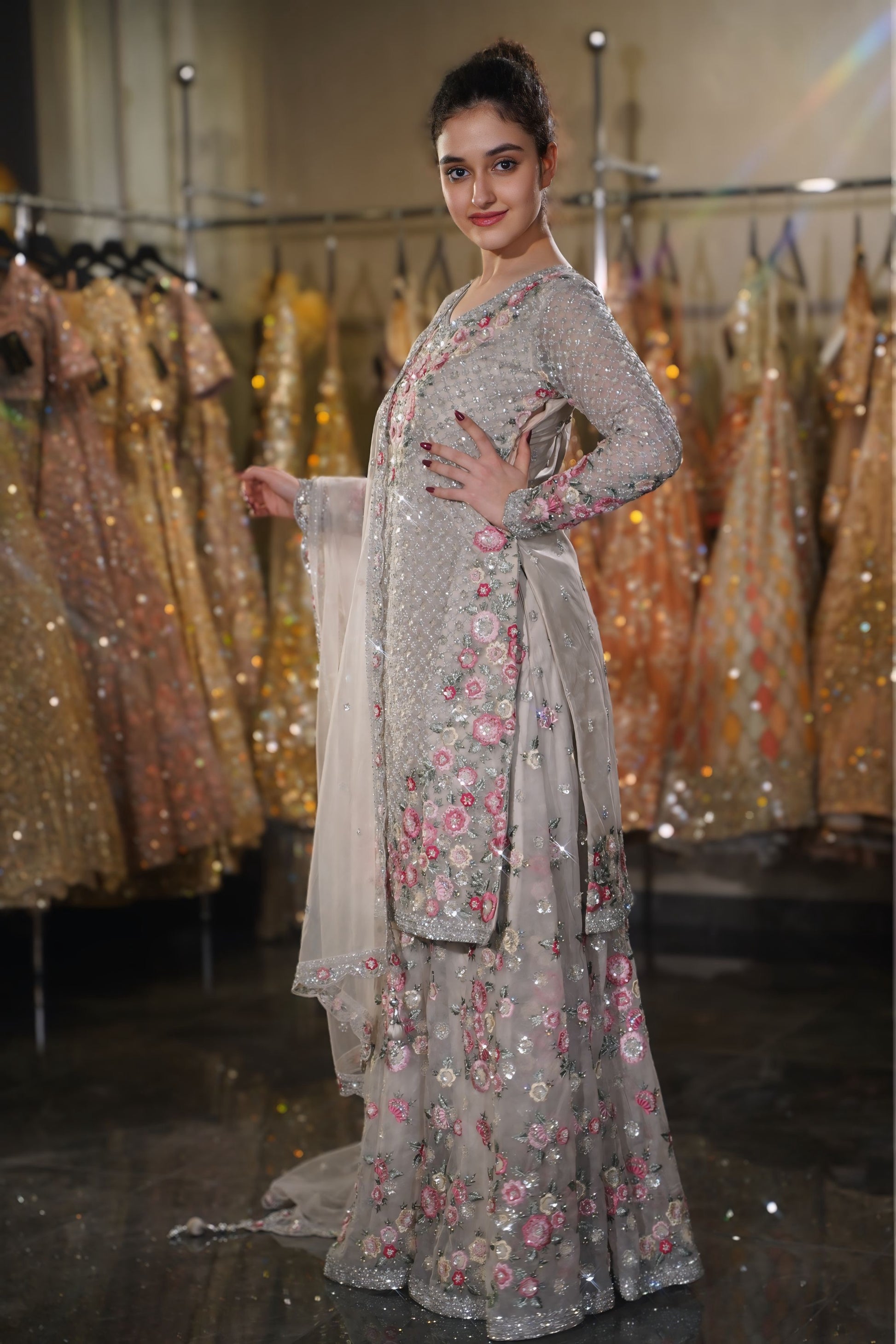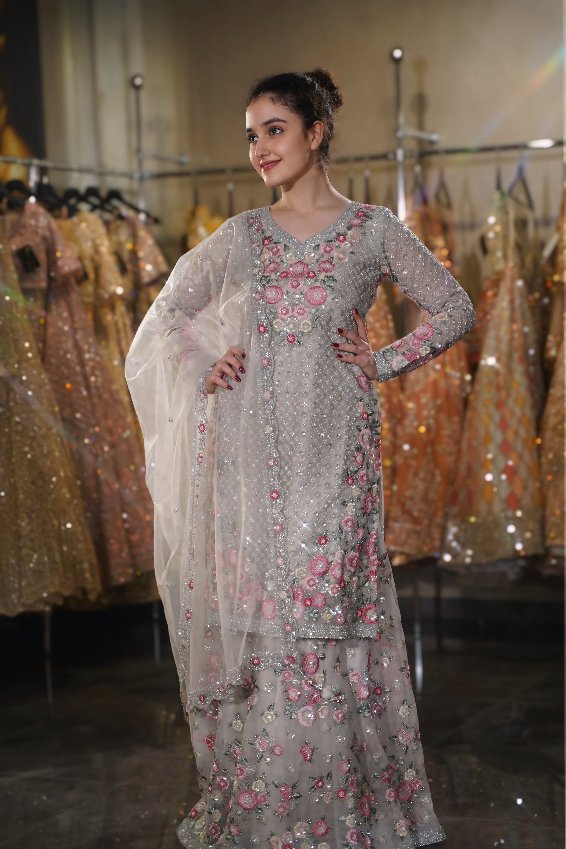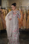 Step into a world of whimsical romance with this breathtaking Silver Grey Sharara Set. A refreshing departure from heavy metallics, this ensemble features a cool grey base brought to life with vibrant pink and peach floral embroidery. The delicate balance between the icy silver background and the warm, blooming flowers creates a look of ethereal beauty, perfect for a Day Wedding, a Morning Engagement, or a graceful Sangeet ceremony.