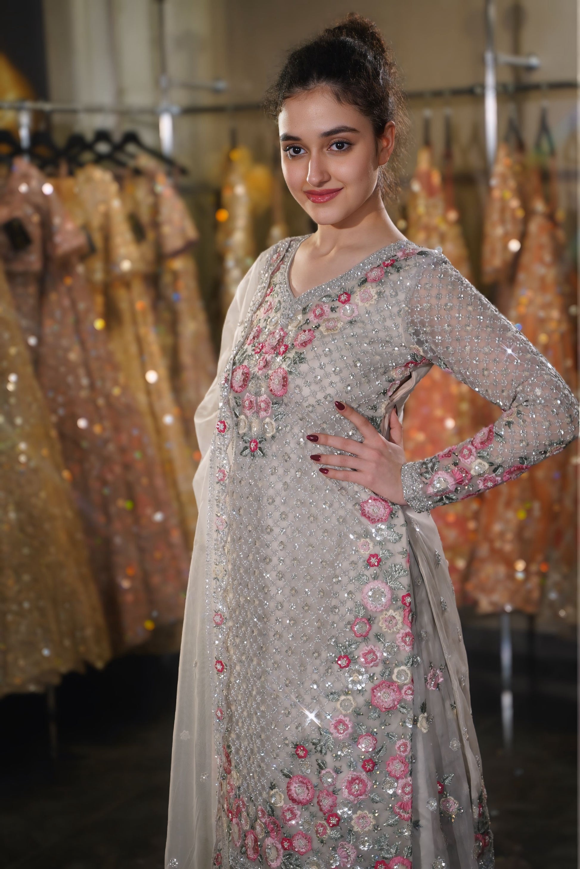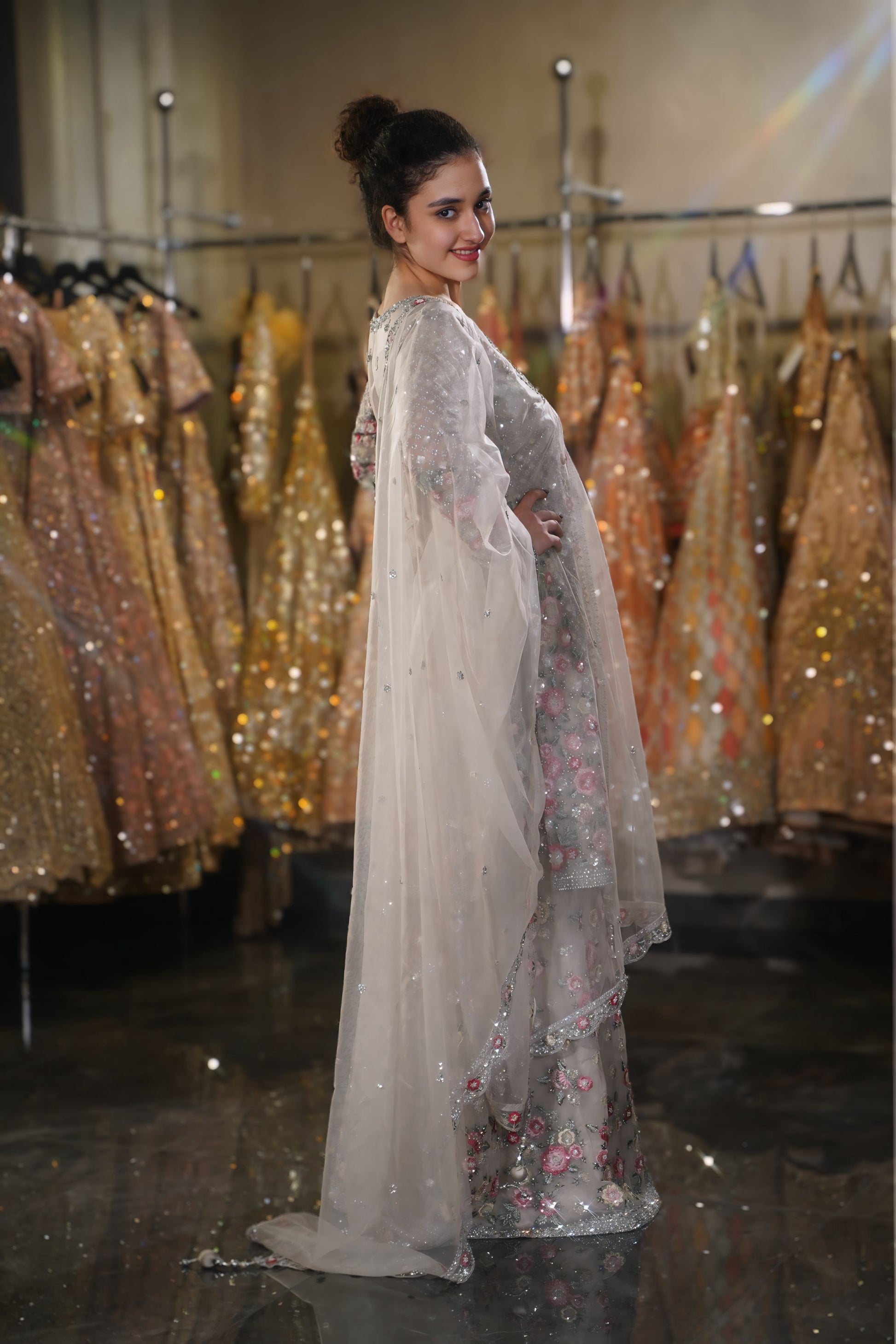 Scalloped Dupatta: The sheer net dupatta is framed by a beautiful scalloped border adorned with matching floral embroidery and silver sequins, adding a soft, feminine finish 🌊