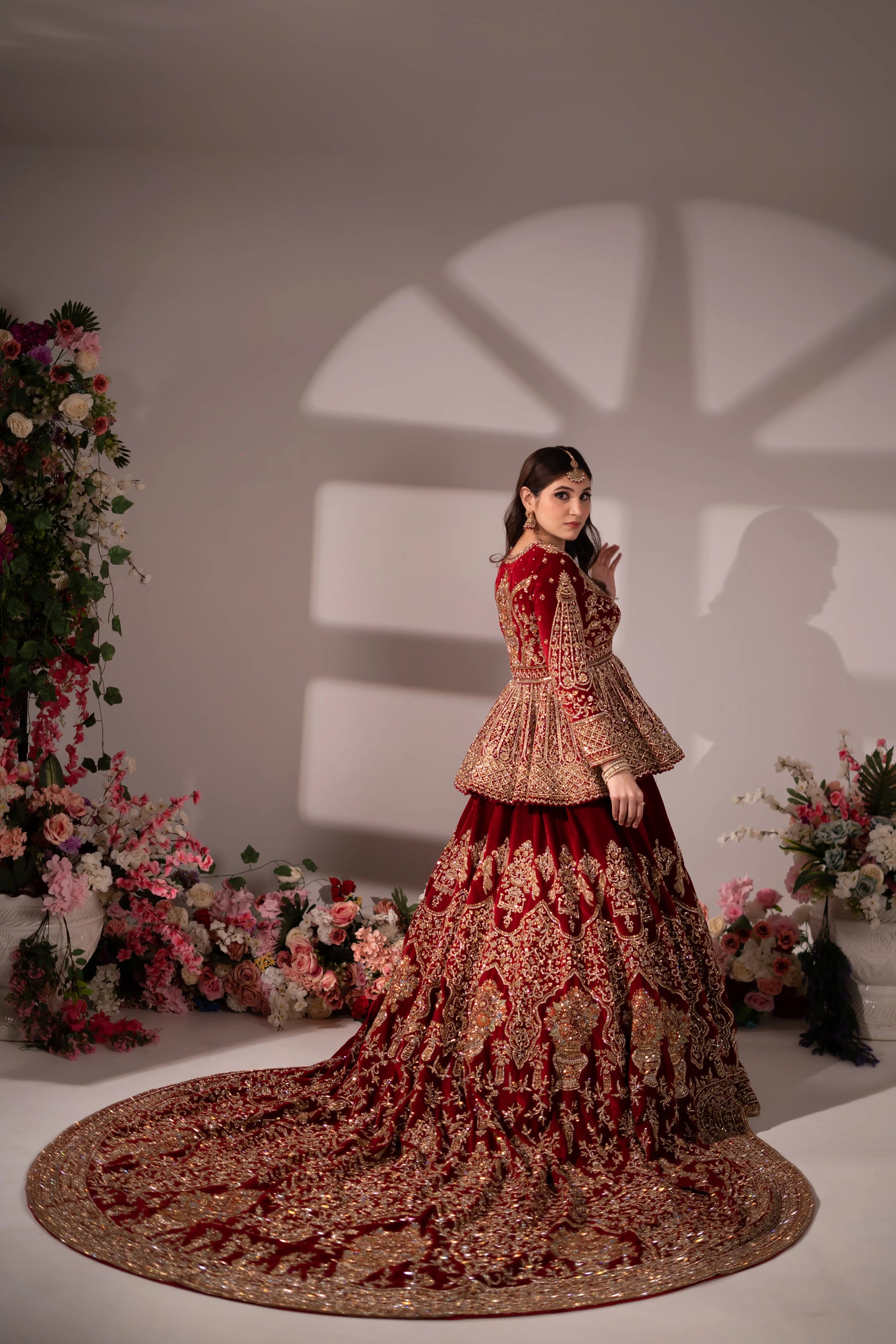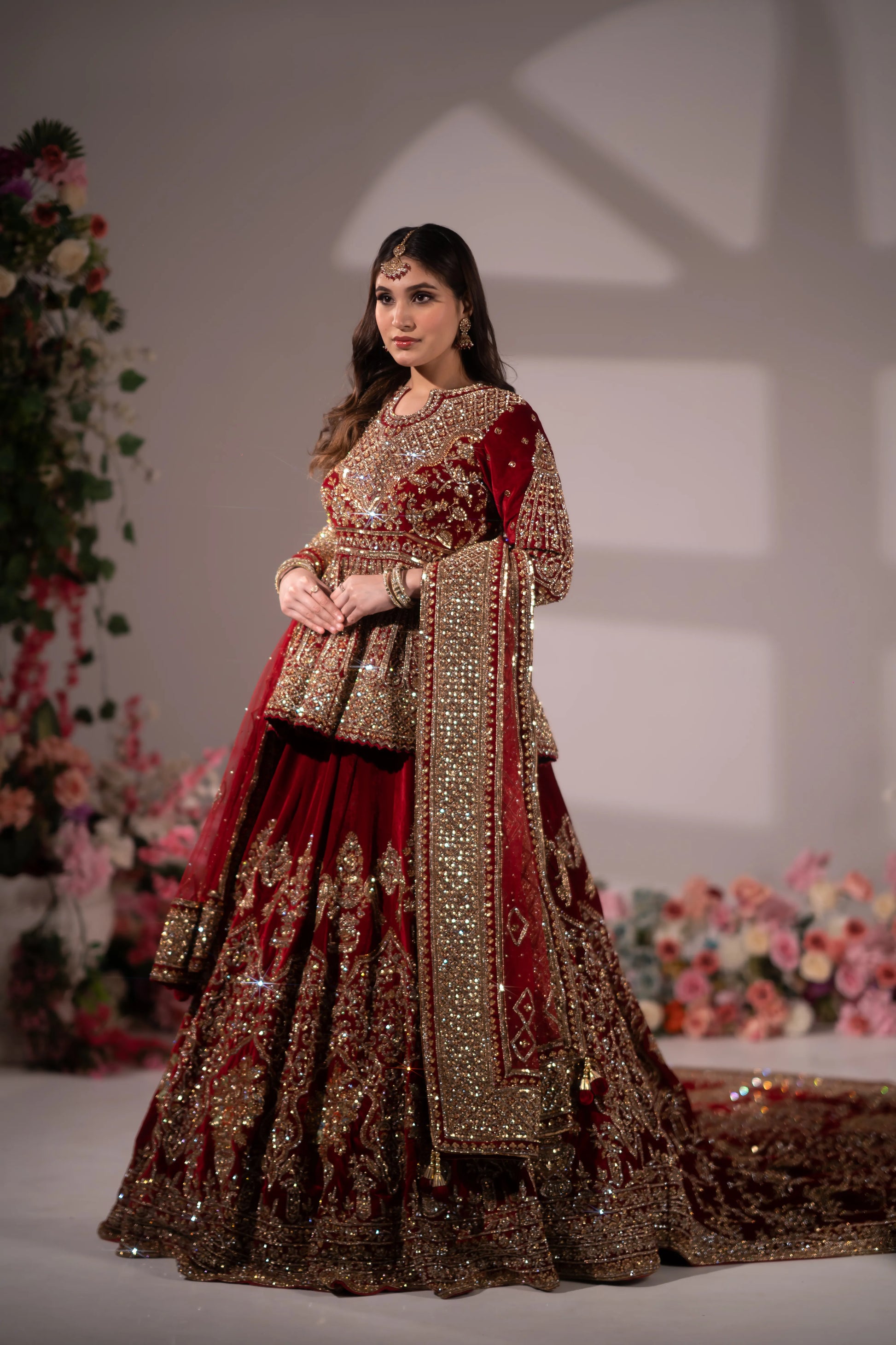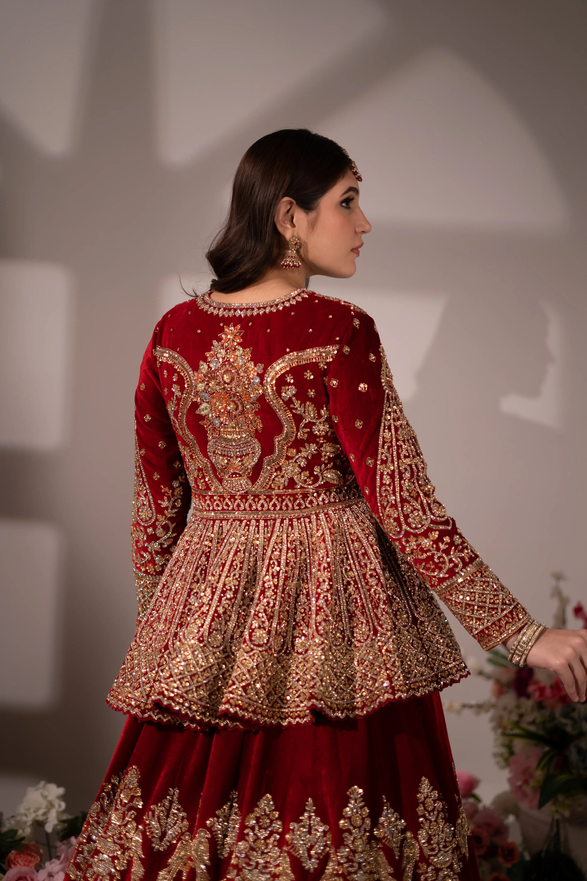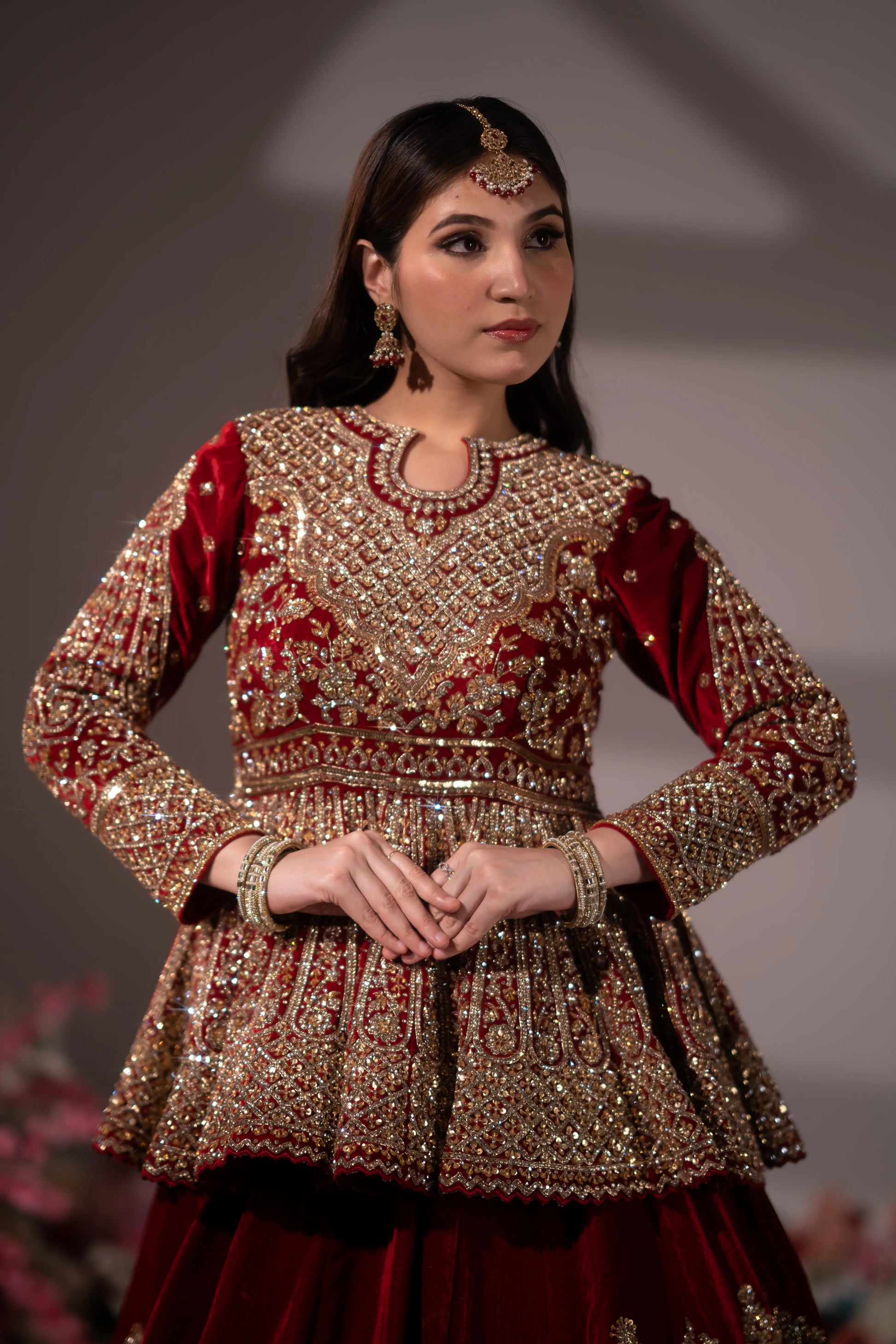 Stunning crimson-red velvet lehenga with unique peplum-style top featuring heavy golden zari embroidery, traditional kalash motif, full sleeves, and crystal fringe trim. Perfect for the contemporary bride seeking traditional elegance with modern flair.