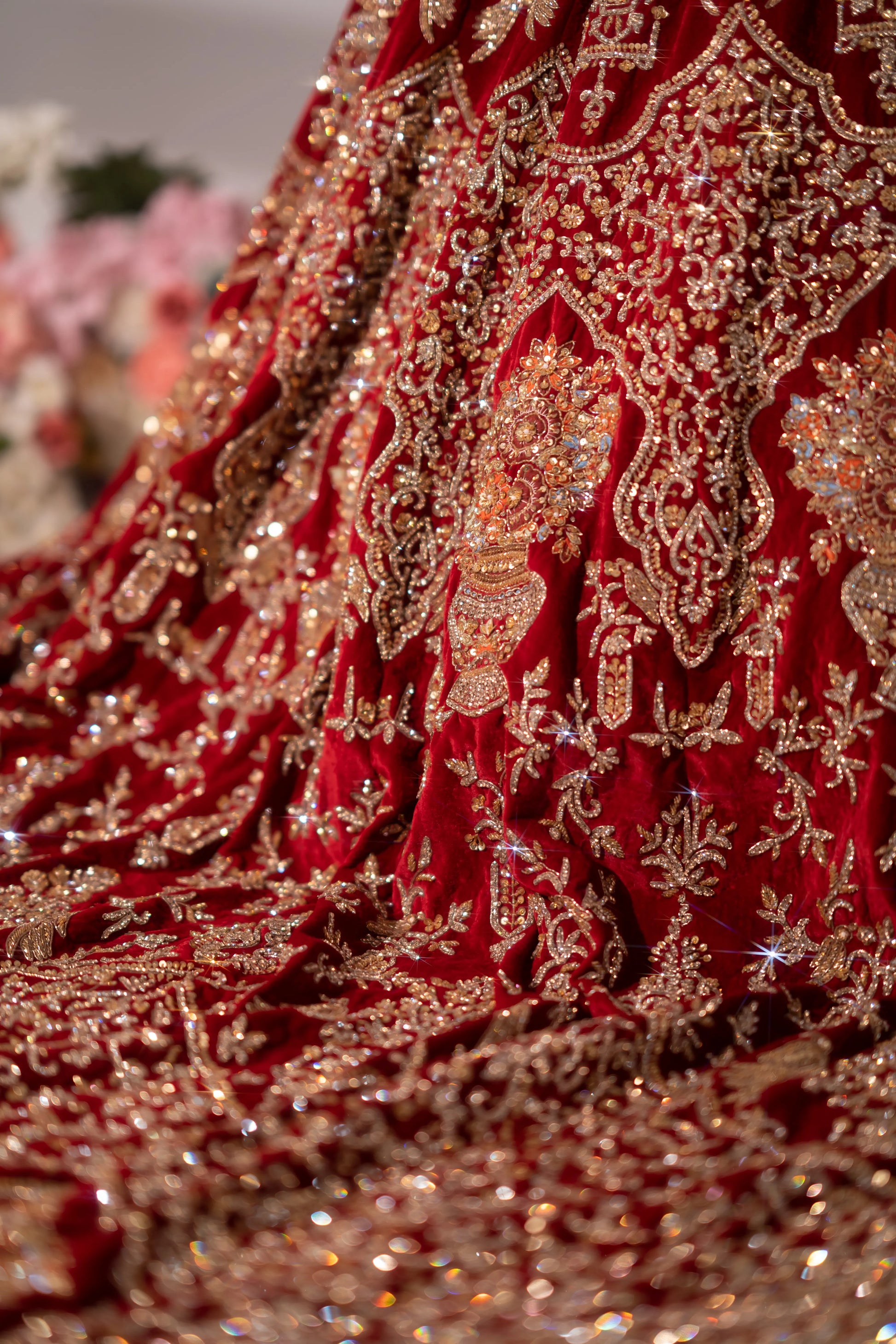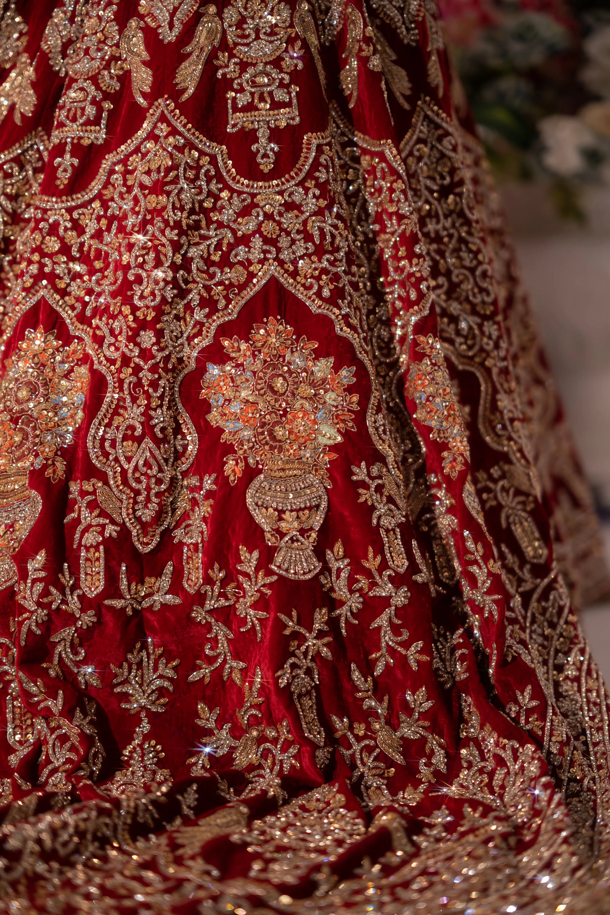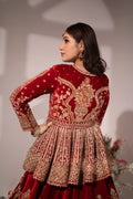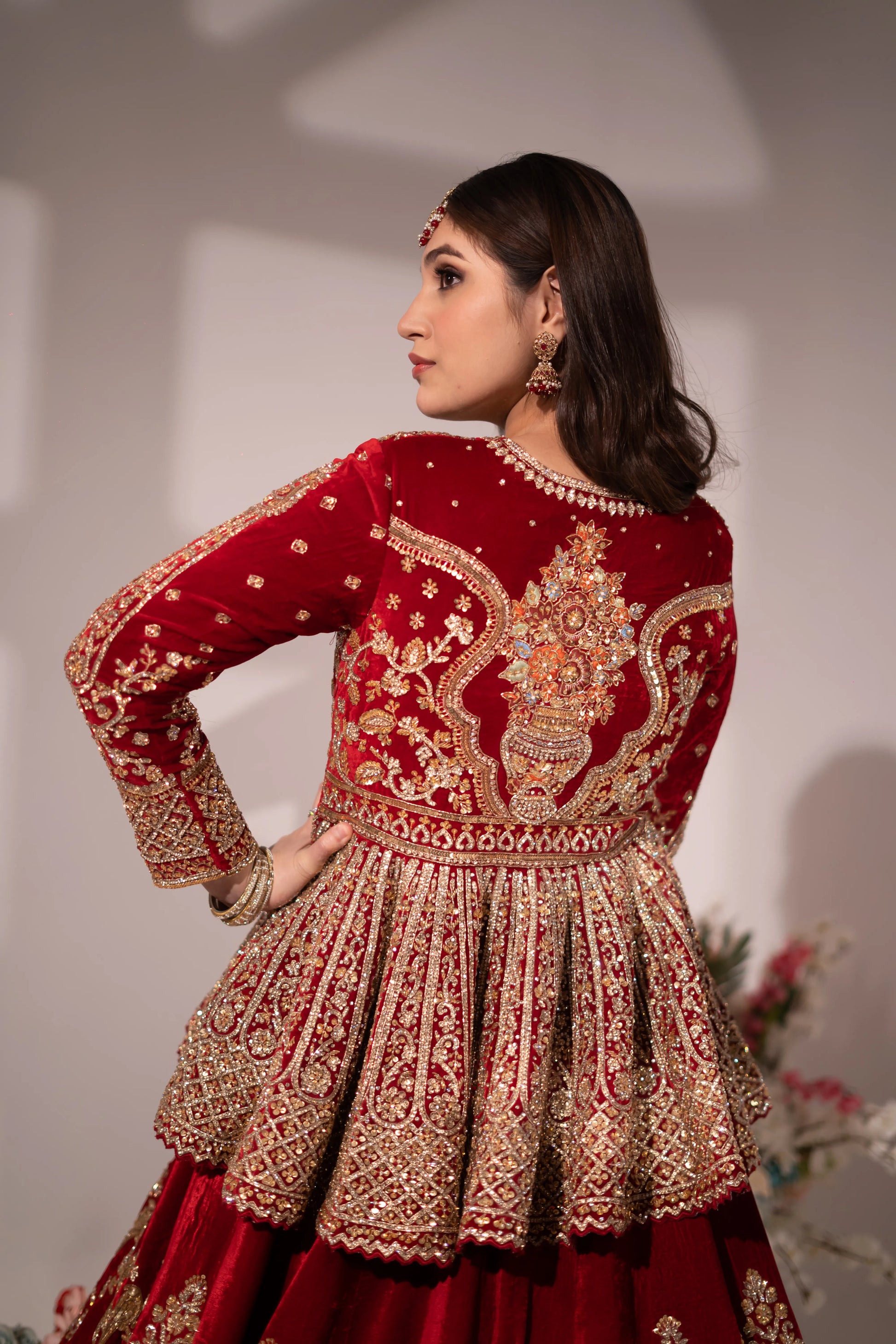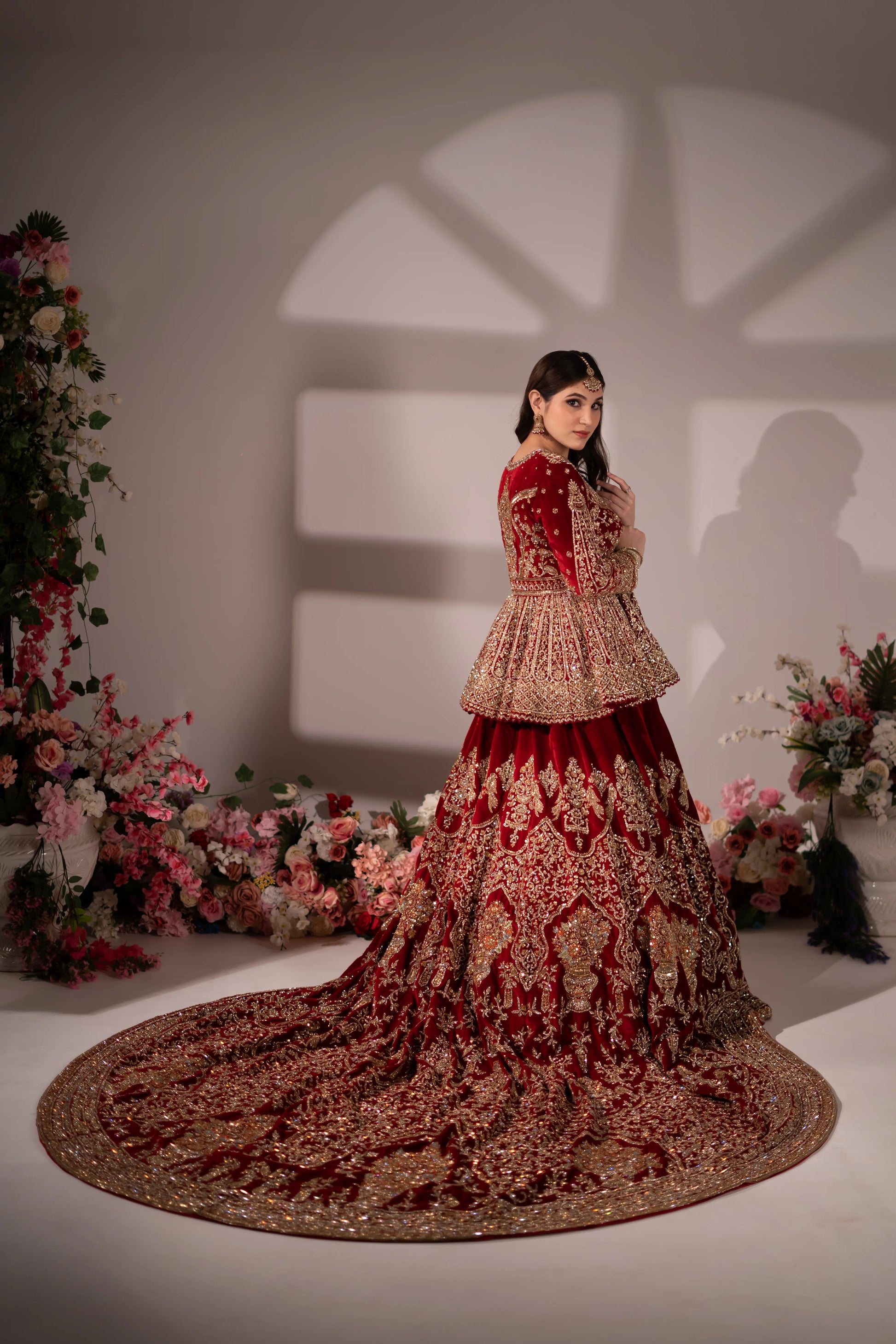 Stunning crimson-red velvet lehenga with unique peplum-style top featuring heavy golden zari embroidery, traditional kalash motif, full sleeves, and crystal fringe trim. Perfect for the contemporary bride seeking traditional elegance with modern flair.